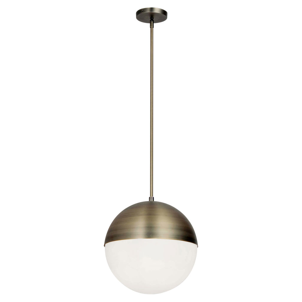 Cette lampe suspendue marie harmonieusement métal brossé et verre opalin blanc dans une composition sphérique équilibrée. La demi-sphère supérieure en laiton antique coiffe élégamment le globe de verre blanc laiteux, créant un contraste visuel sophistiqué et intemporel.