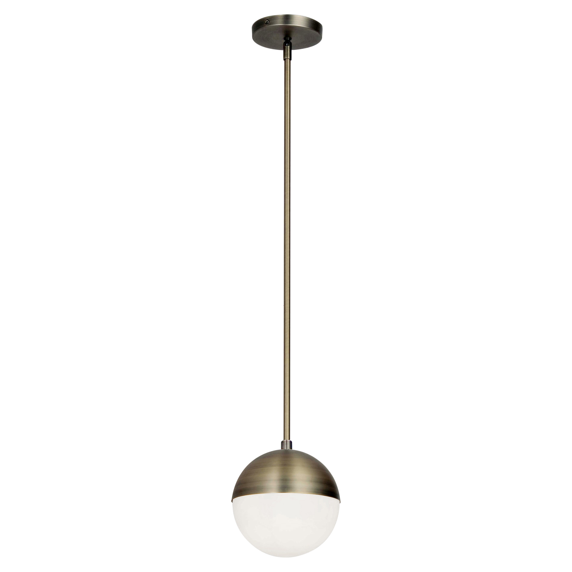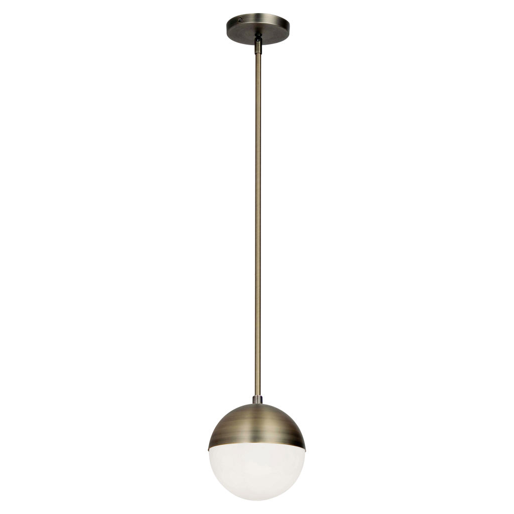 Cette lampe suspendue marie harmonieusement métal brossé et verre opalin blanc dans une composition sphérique équilibrée. La demi-sphère supérieure en laiton antique coiffe élégamment le globe de verre blanc laiteux, créant un contraste visuel sophistiqué et intemporel.