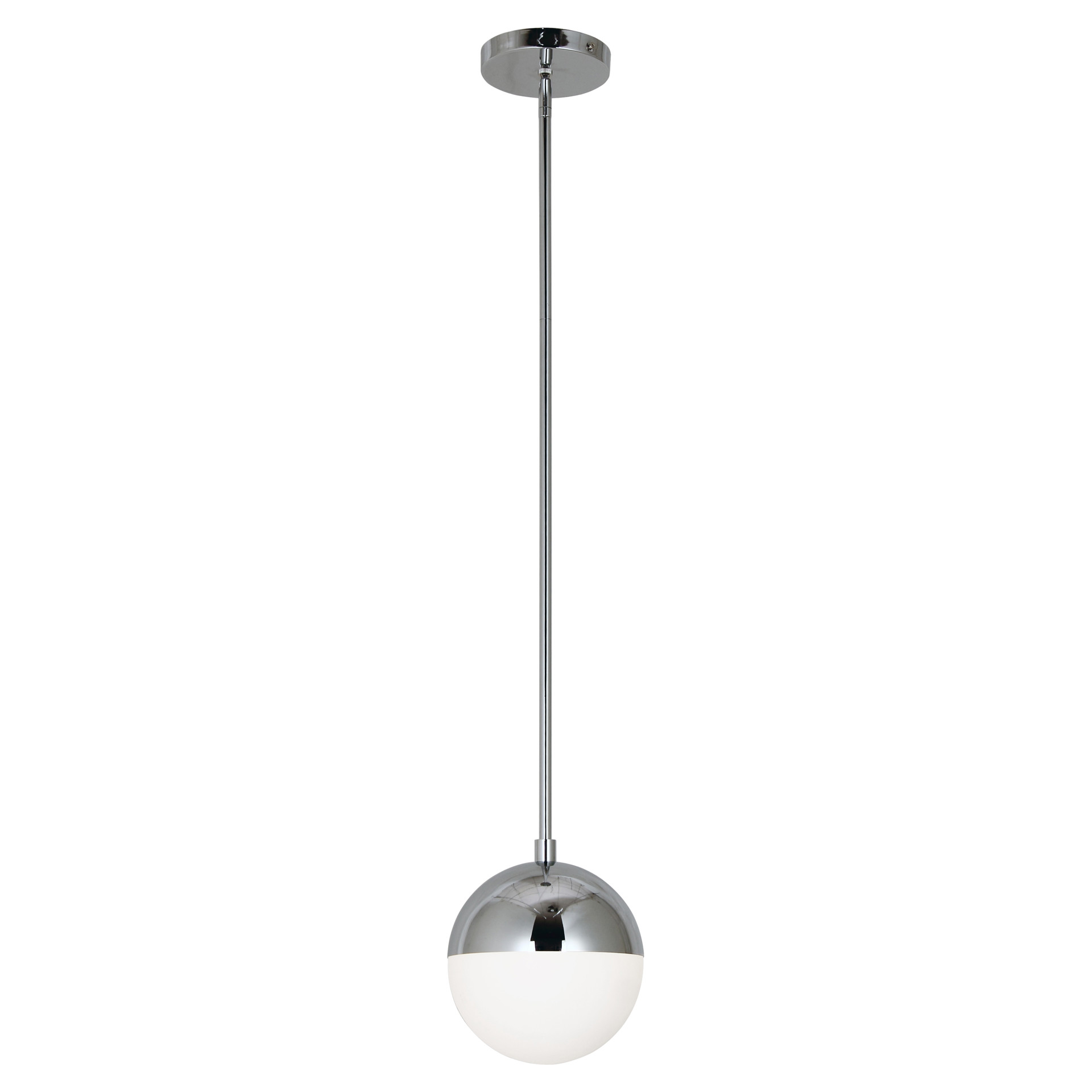 Cette lampe suspendue marie harmonieusement chrome poli et verre opalin blanc dans une composition sphérique équilibrée. La demi-sphère supérieure chrome poli coiffe élégamment le globe de verre blanc laiteux, créant un contraste visuel sophistiqué et intemporel.