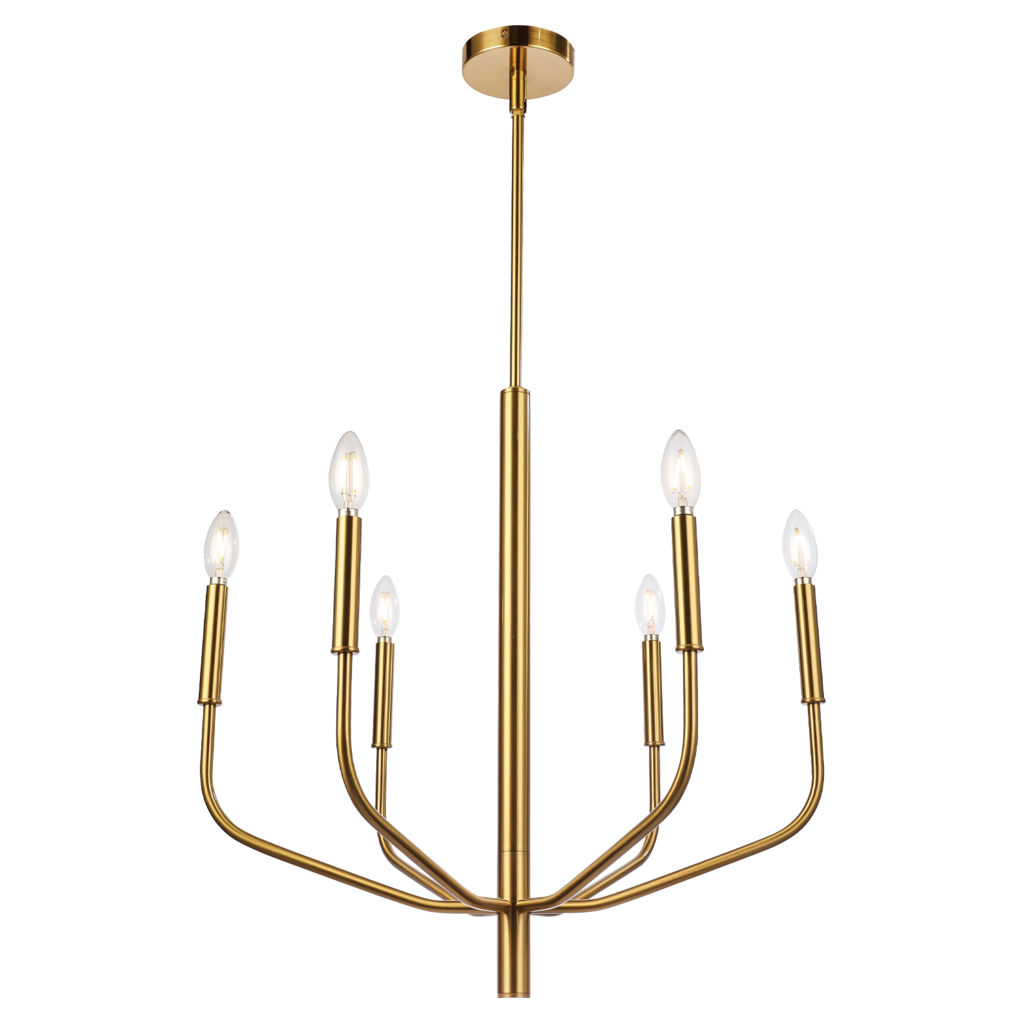 Ce lustre à six branches célèbre la simplicité raffinée avec ses bras tubulaires en laiton brossé qui s'élèvent gracieusement depuis une tige centrale élancée. Les lignes courbes minimalistes créent une silhouette aérienne et élégante qui capte subtilement la lumière.