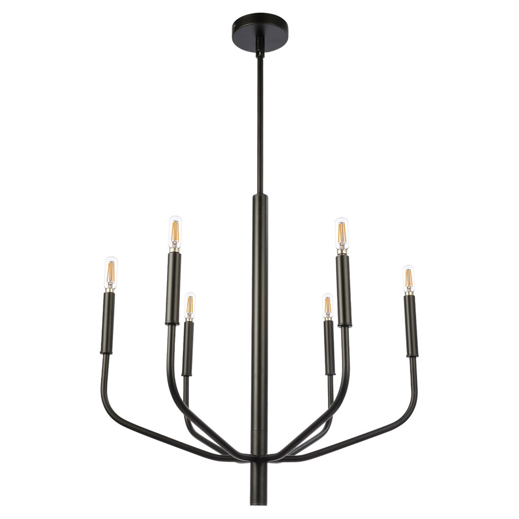Ce lustre à six branches célèbre la simplicité raffinée avec ses bras tubulaires en métal noir qui s'élèvent gracieusement depuis une tige centrale élancée. Les lignes courbes minimalistes créent une silhouette aérienne et élégante qui capte subtilement la lumière.