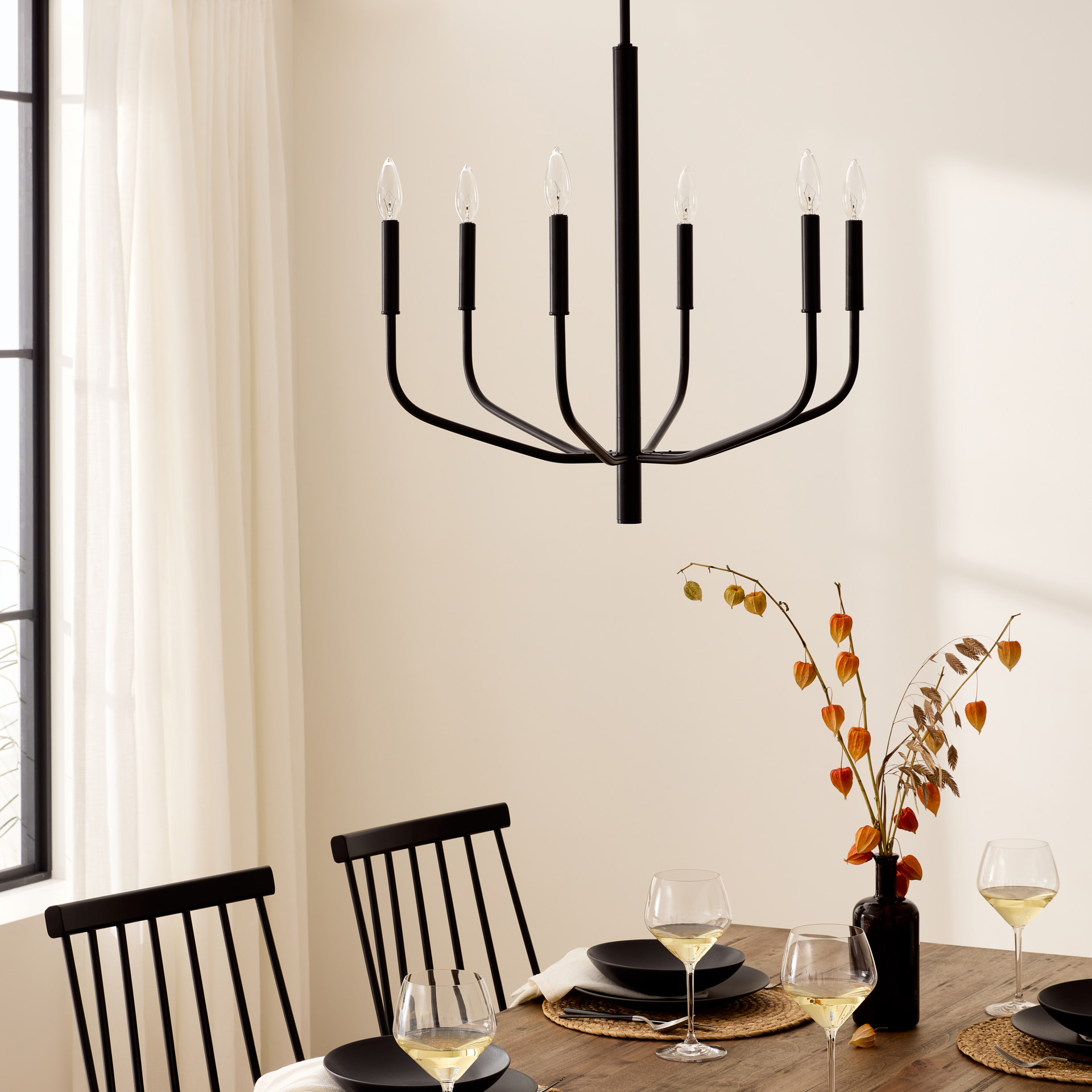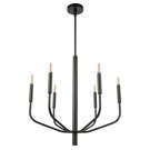 La finition noir mat ajoute une chaleur sophistiquée, tandis que les ampoules chandelle apparentes deviennent l'élément décoratif central. La structure ouverte préserve une légèreté visuelle malgré ses six sources lumineuses, offrant un éclairage généreux sans encombrement.
