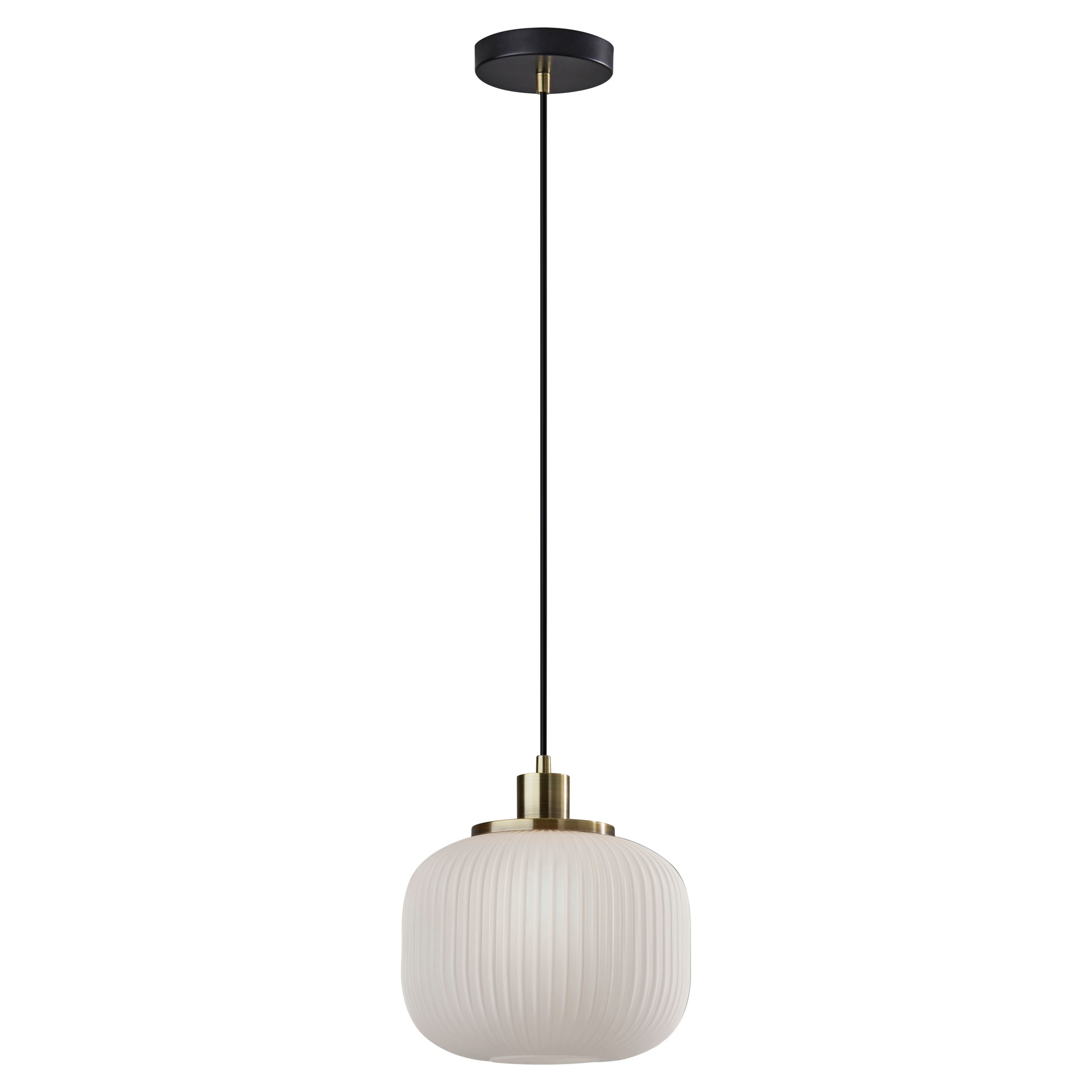 Apportez élégance et douceur avec cette suspension aux lignes organiques raffinées. Son globe en verre blanc texturé de fines rainures verticales diffuse une lumière tamisée et enveloppante. L'accent en laiton au sommet ajoute une touche de chaleur et de sophistication.
