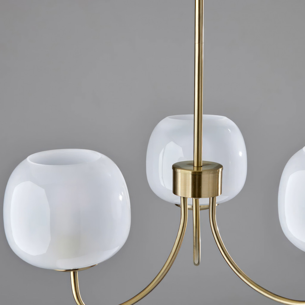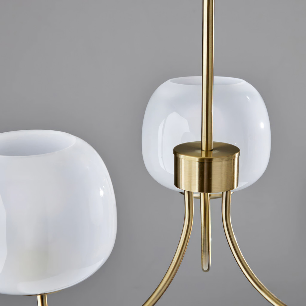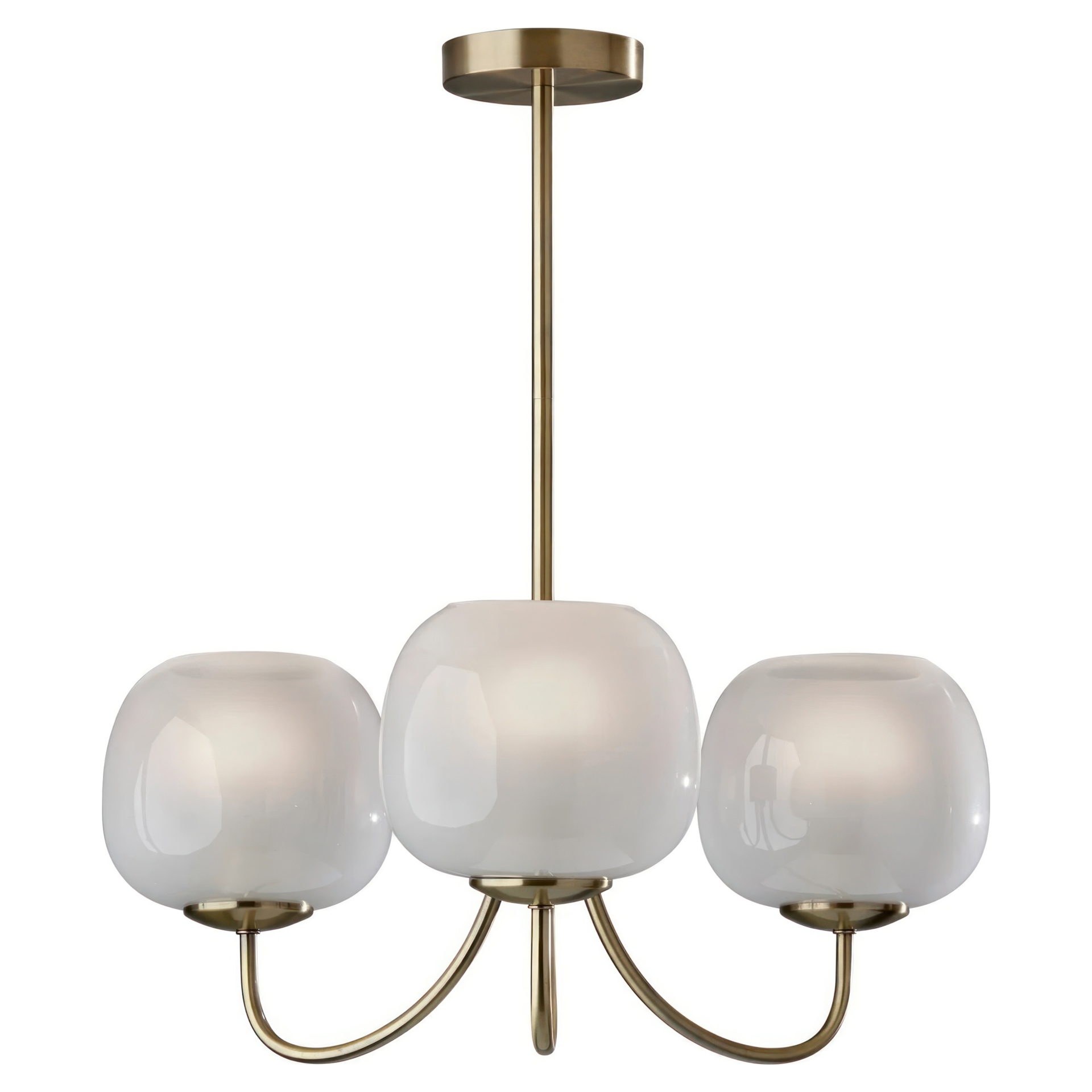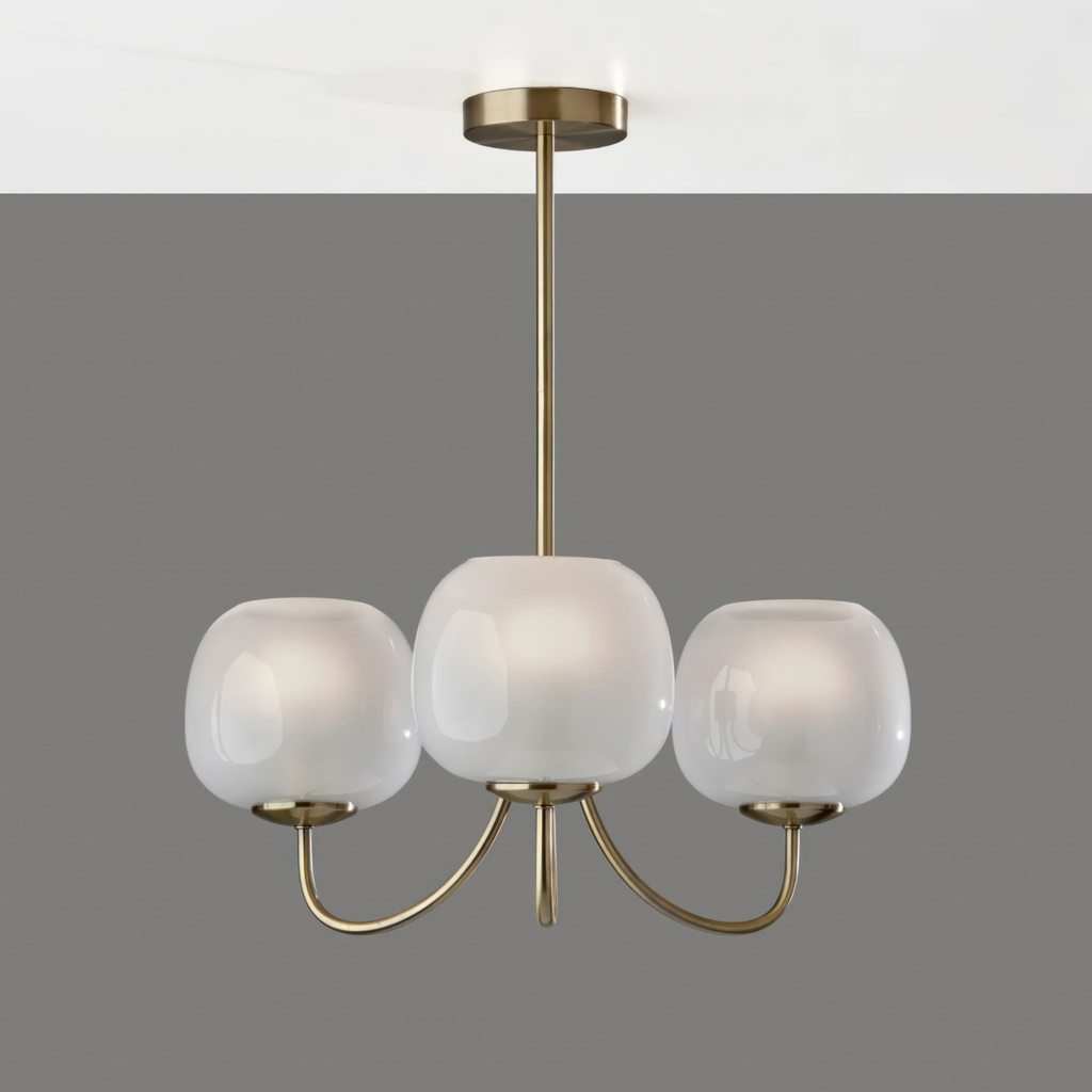 Ses trois abat-jours en verre sont une étude de contraste, avec des extérieurs blancs brillants pour une touche contemporaine, tandis que les intérieurs givrés diffusent une lumière douce et invitante.