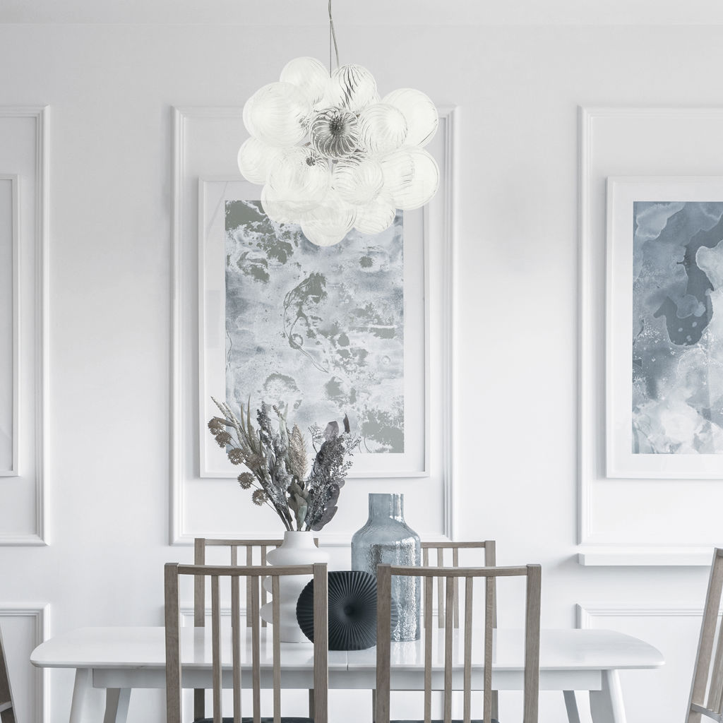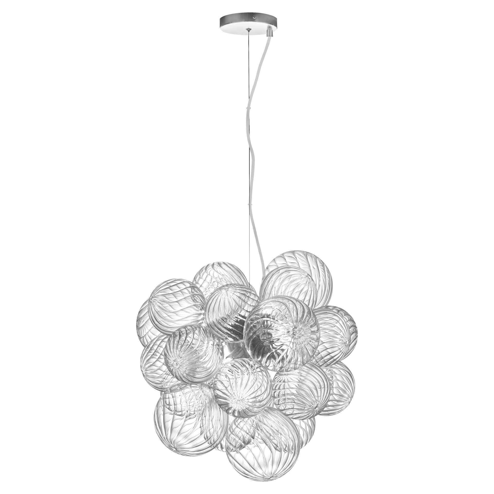 Suspension contemporaine Charlize en verre clair en spirale pour le plafond avec 6 ampoules, base de douille G9 40 W max, graduable et approuvé UL pour l'humidité avec une garantie limitée d'un an.