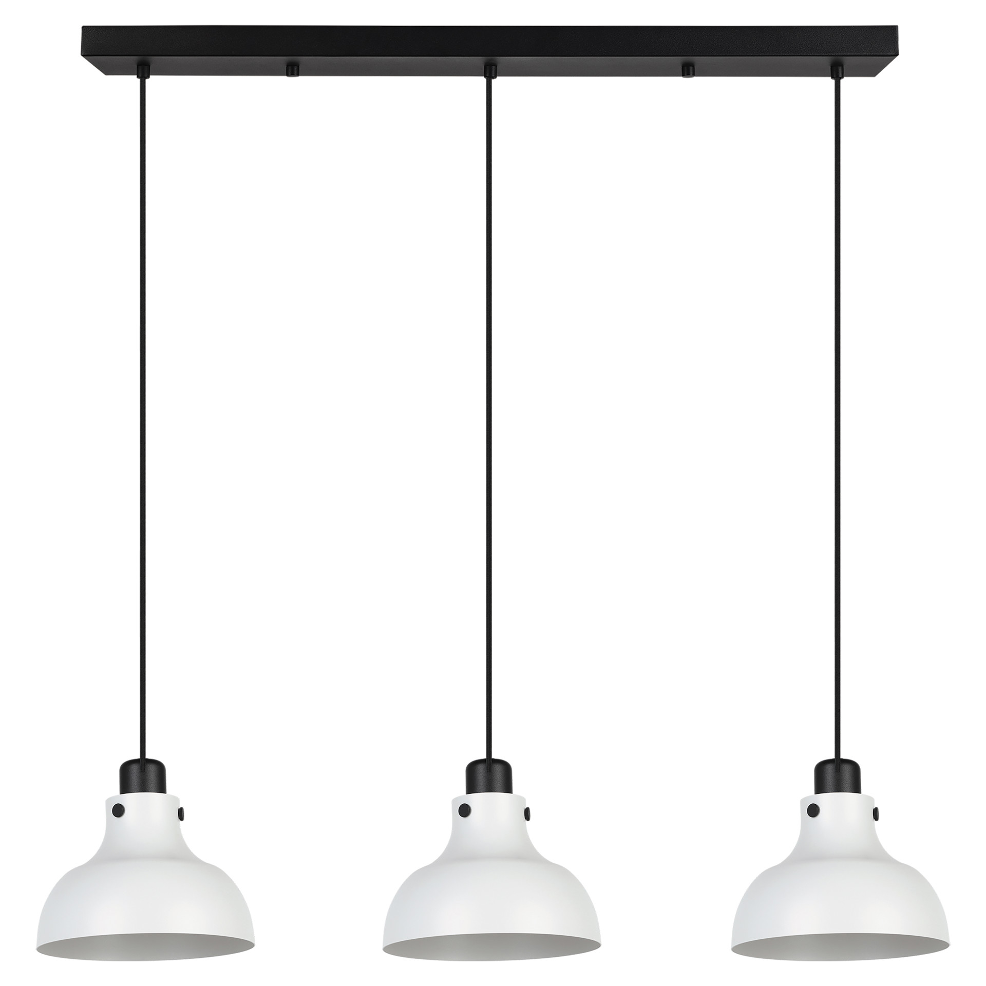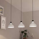 La suspension Matlock a trois abat-jours coniques en métal avec une finition gris pâle, chacun conçu avec des accents industriels noirs.