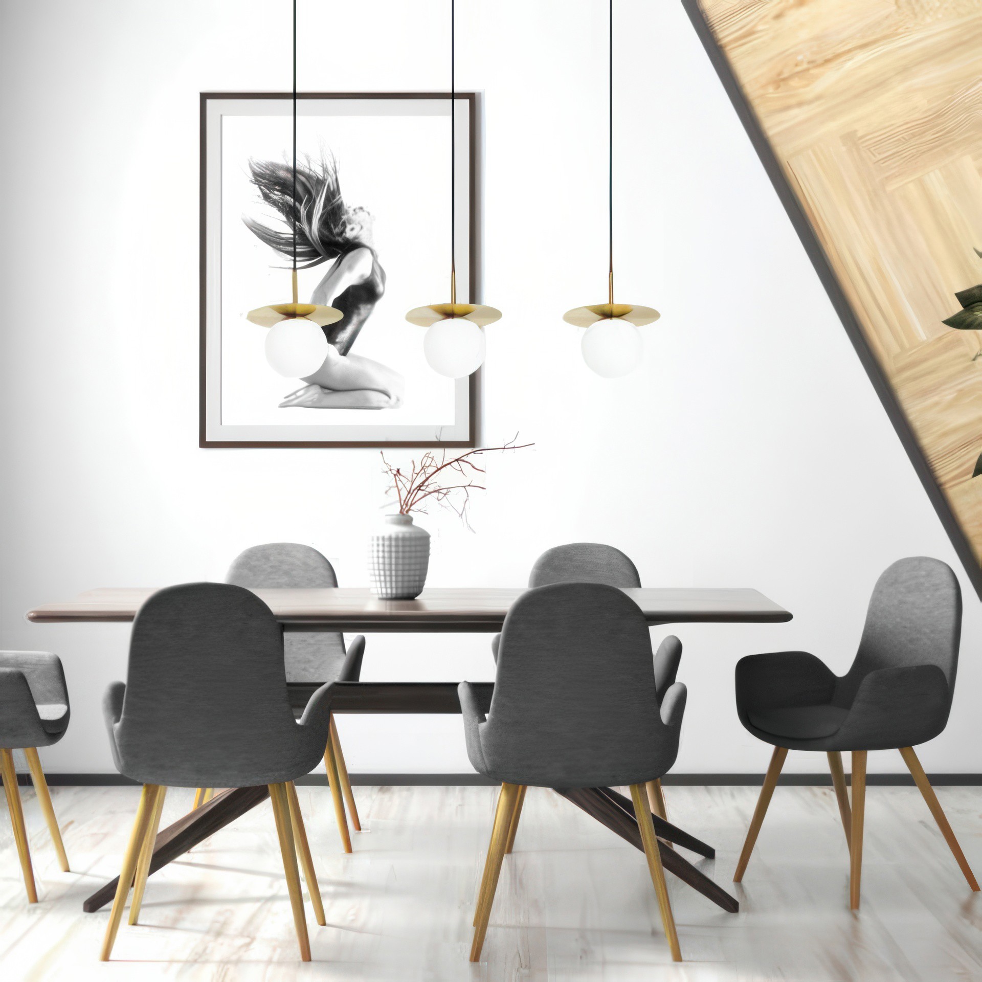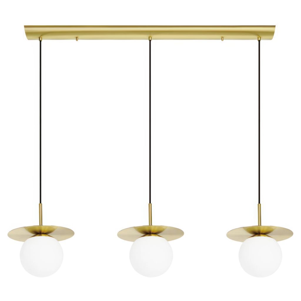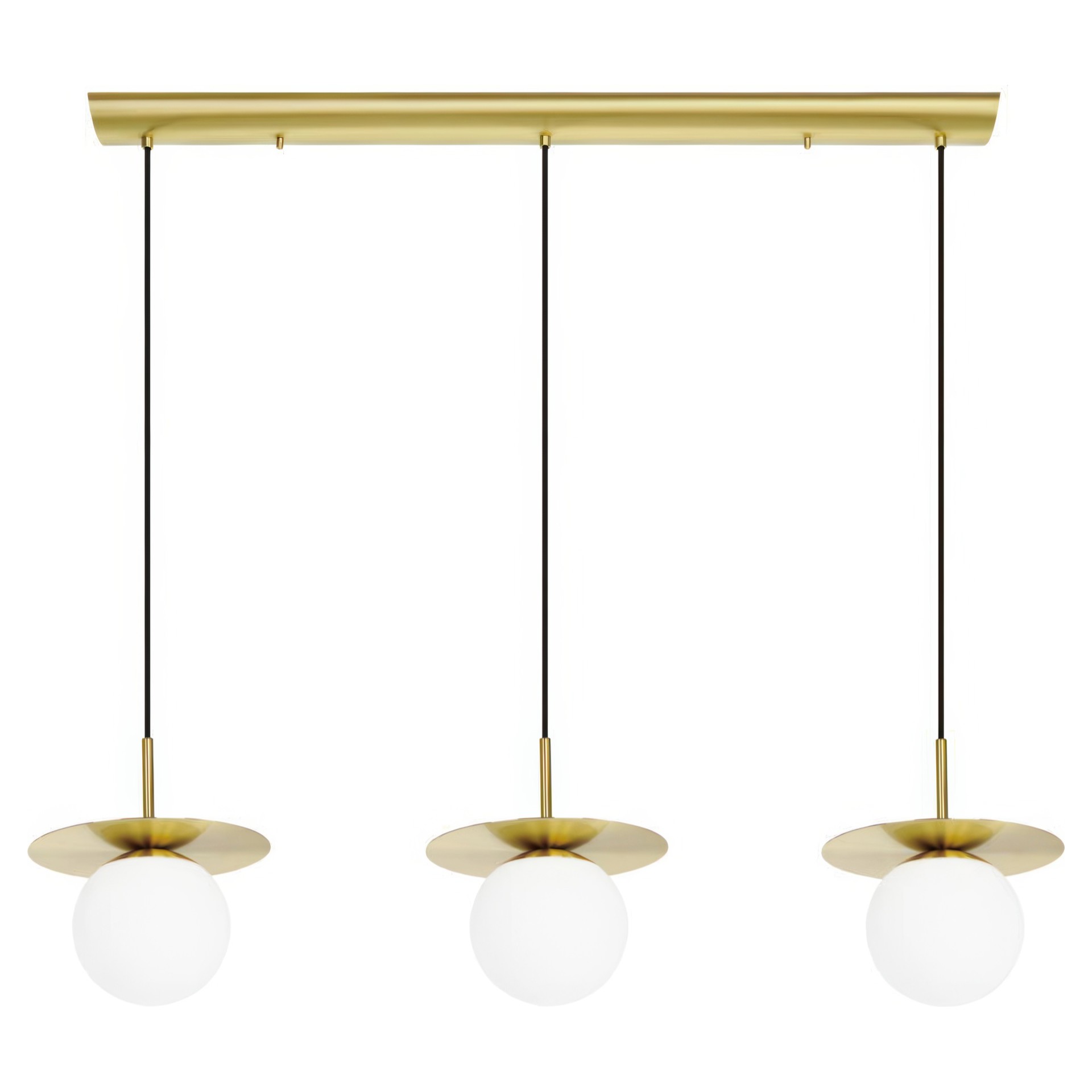 Composé d'un verre opale blanc qui est empilé sous une plaque en laiton brossé et suspendu d´une canopée de la même finition, ce luminaire suspendu intemporelle s'intègre avec élégance aux designs modernes et minimalistes.