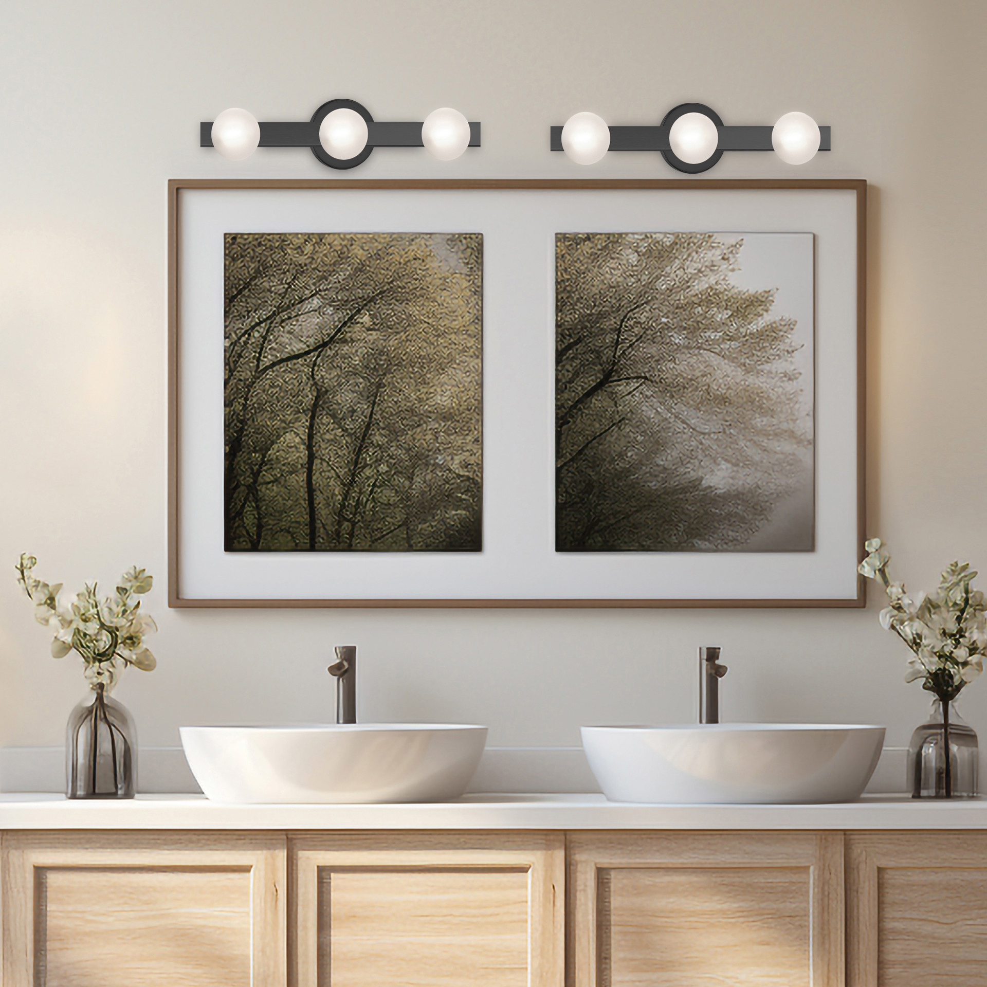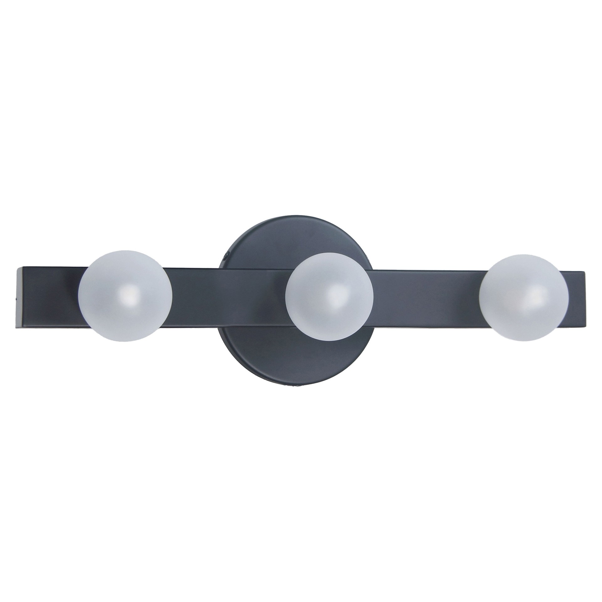 Applique murale moderne Raleigh peint en métal noir mat avec 3 ampoules, culot G9, 25 watts max. Intensité variable et homologuée UL pour l'humidité avec une garantie limitée d'un an.