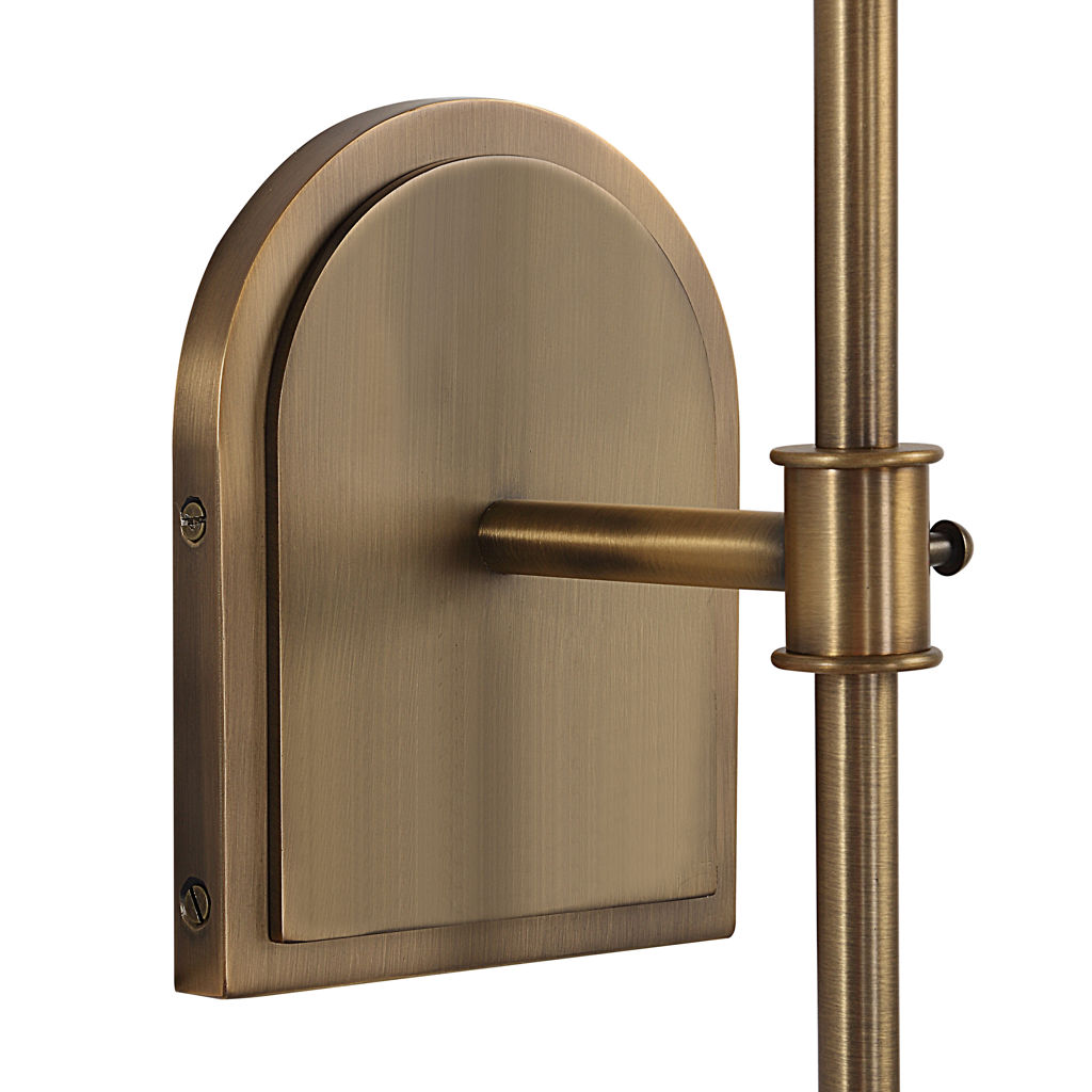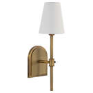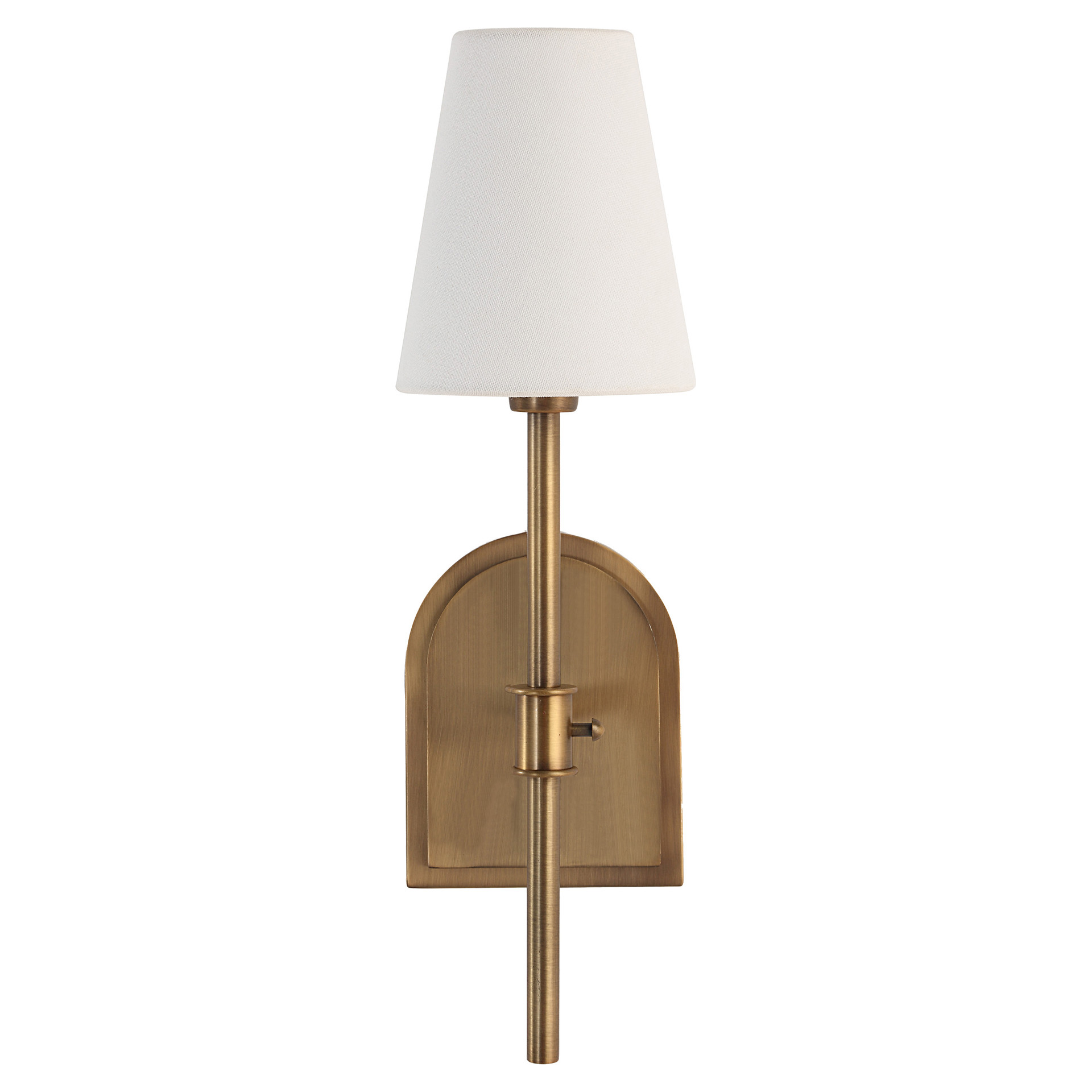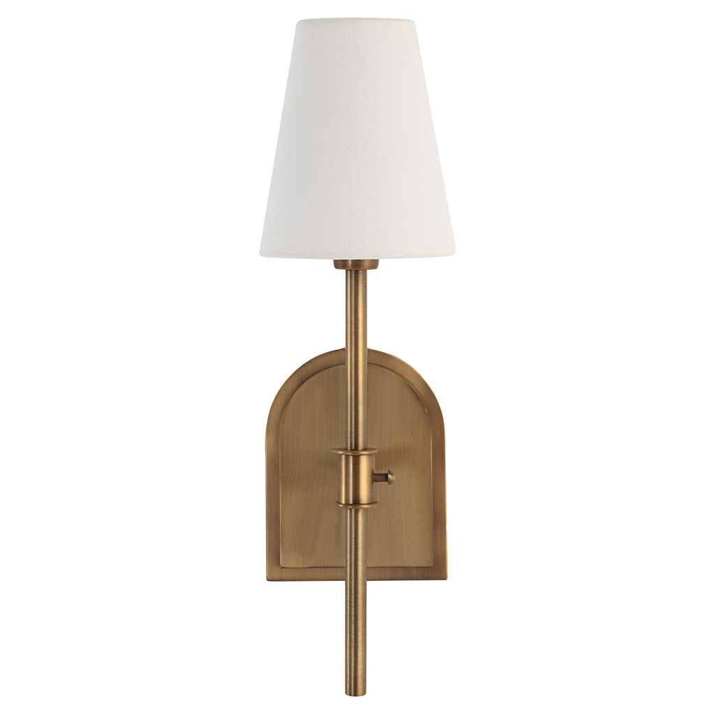 Fabriquée avec une finition plaquée laiton brossé antique foncé et un abat-jour en lin blanc cassé effilé, cette applique murale reçoit une mise à jour moderne avec une plaque arrière arquée pour offrir une esthétique à la fois intemporelle et tendance.