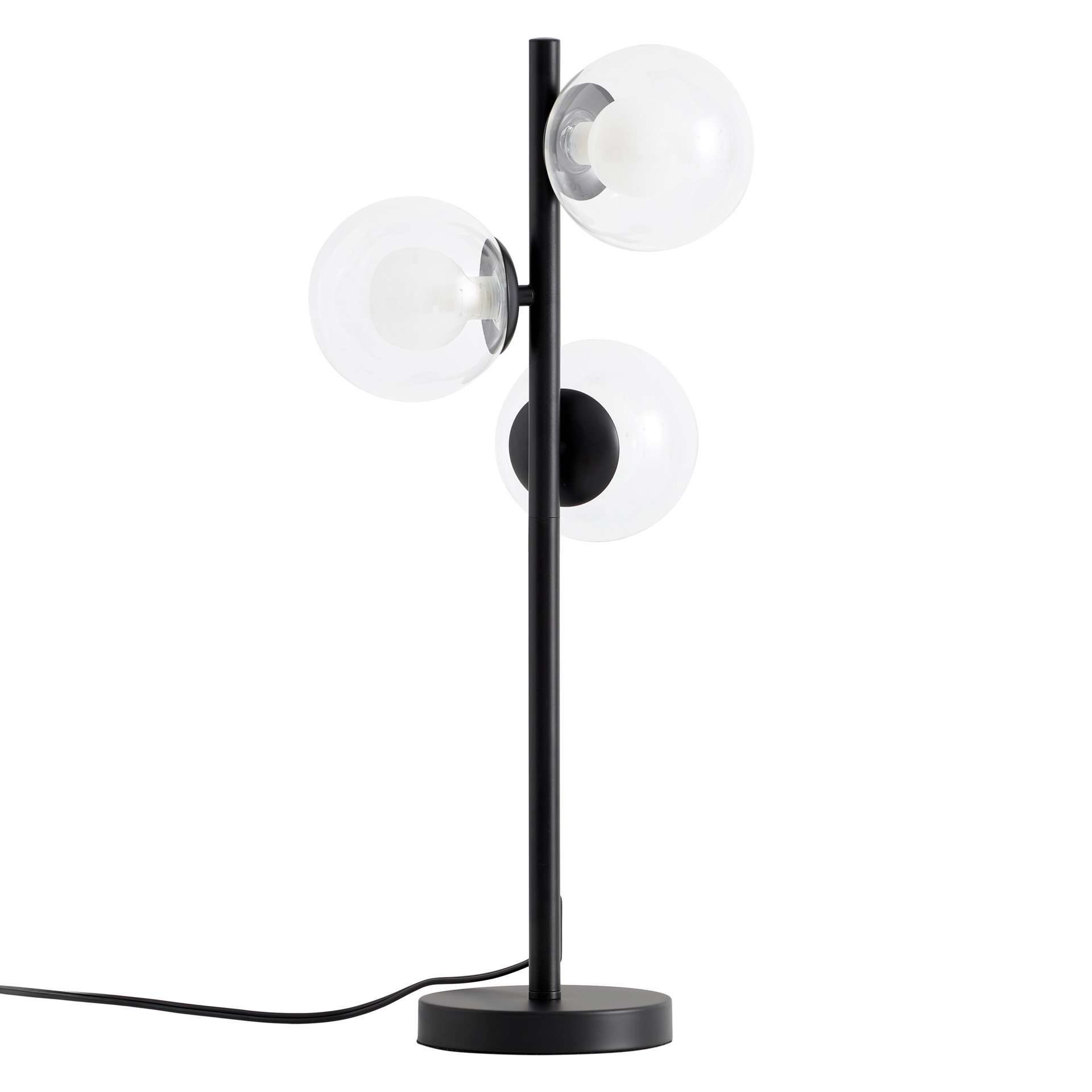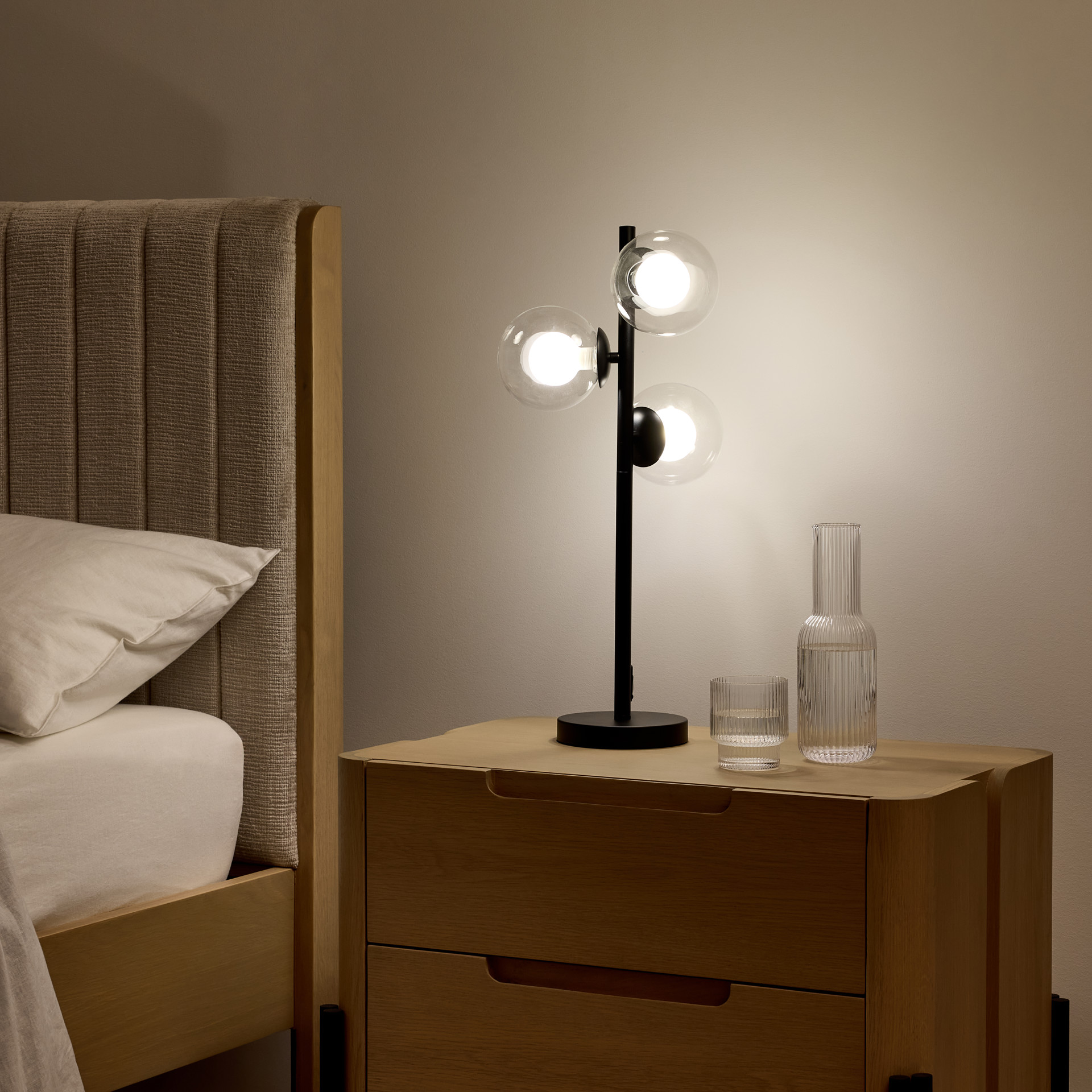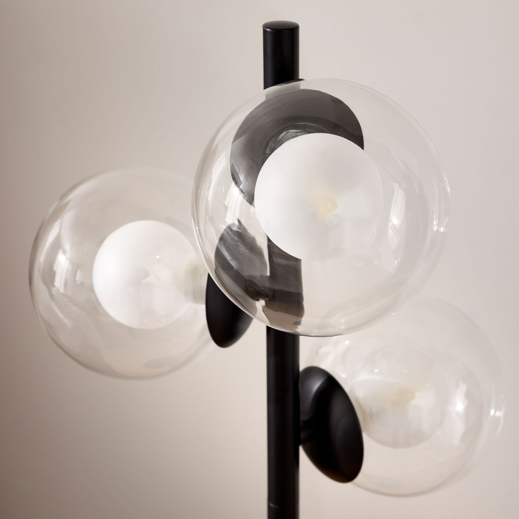 Cette lampe de table captive par sa composition verticale audacieuse qui superpose trois globes de verre transparent le long d'une tige métallique noire épurée. Chaque sphère lumineuse crée son propre halo chaleureux, multipliant les sources de lumière pour une ambiance enveloppante.