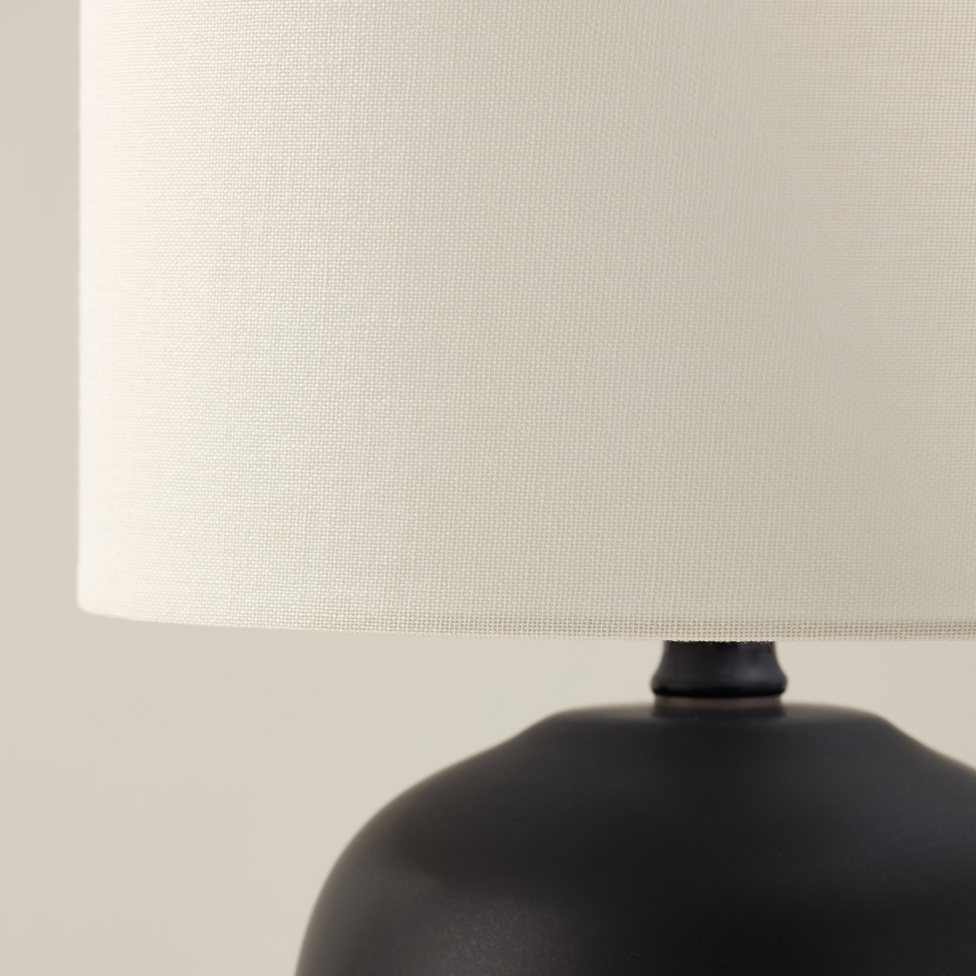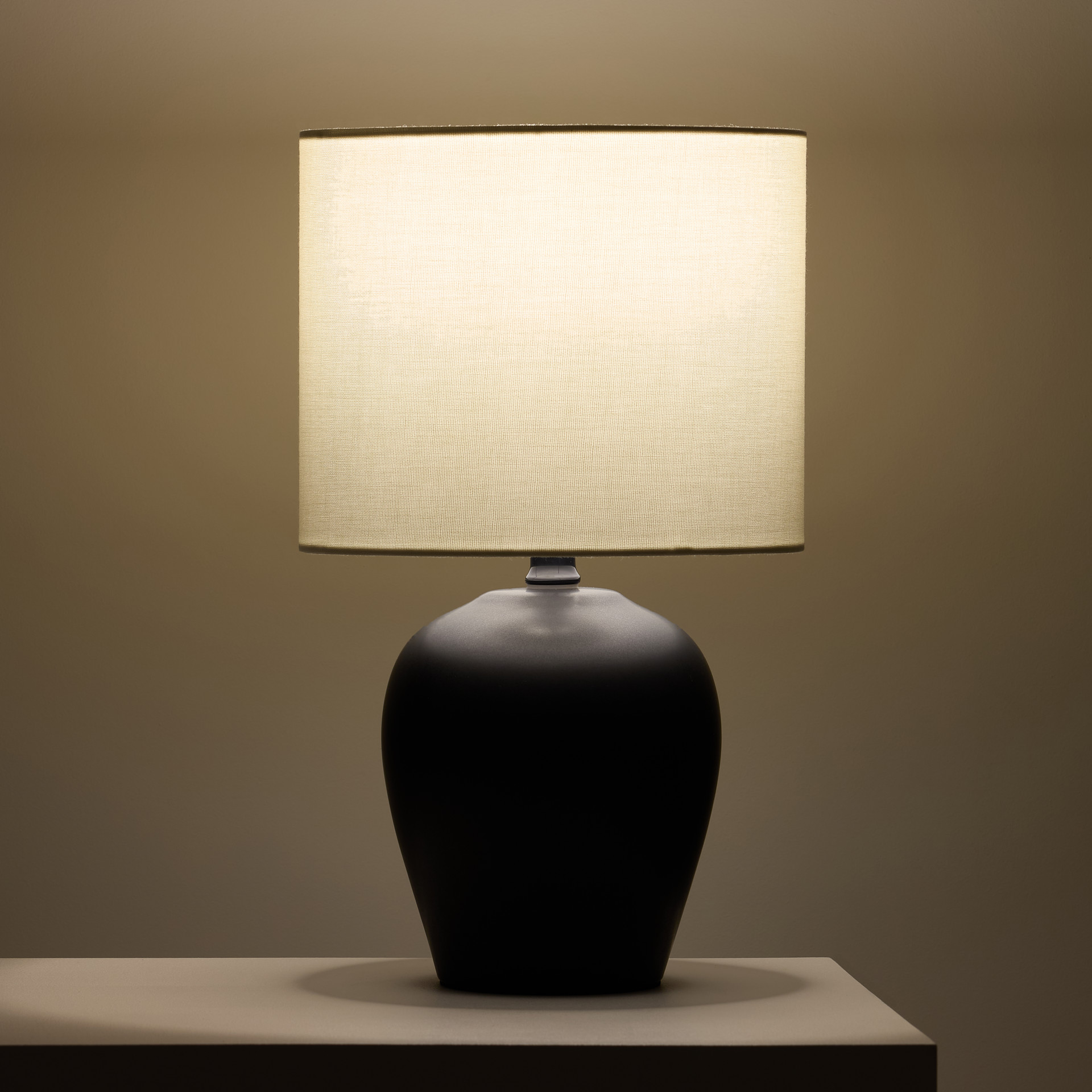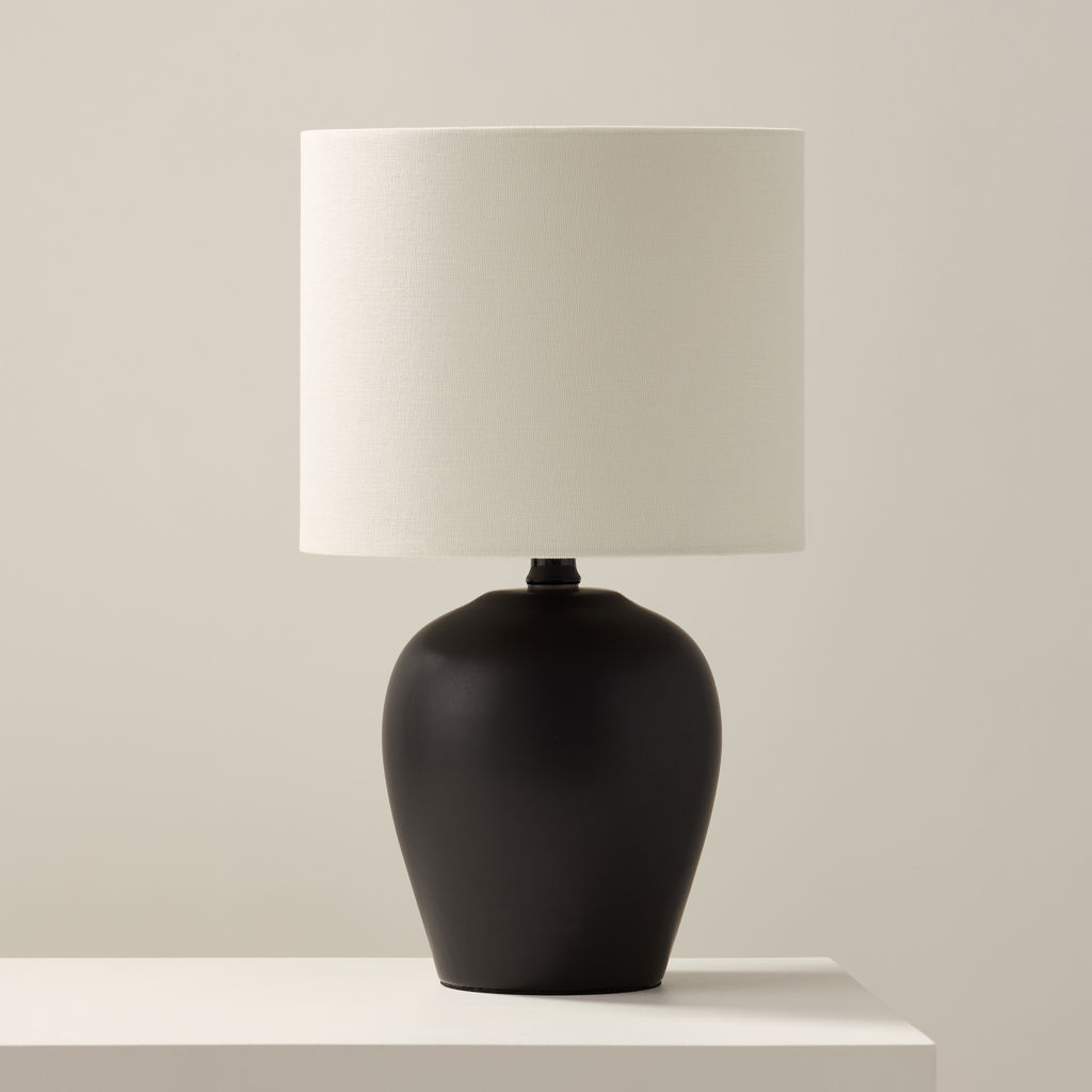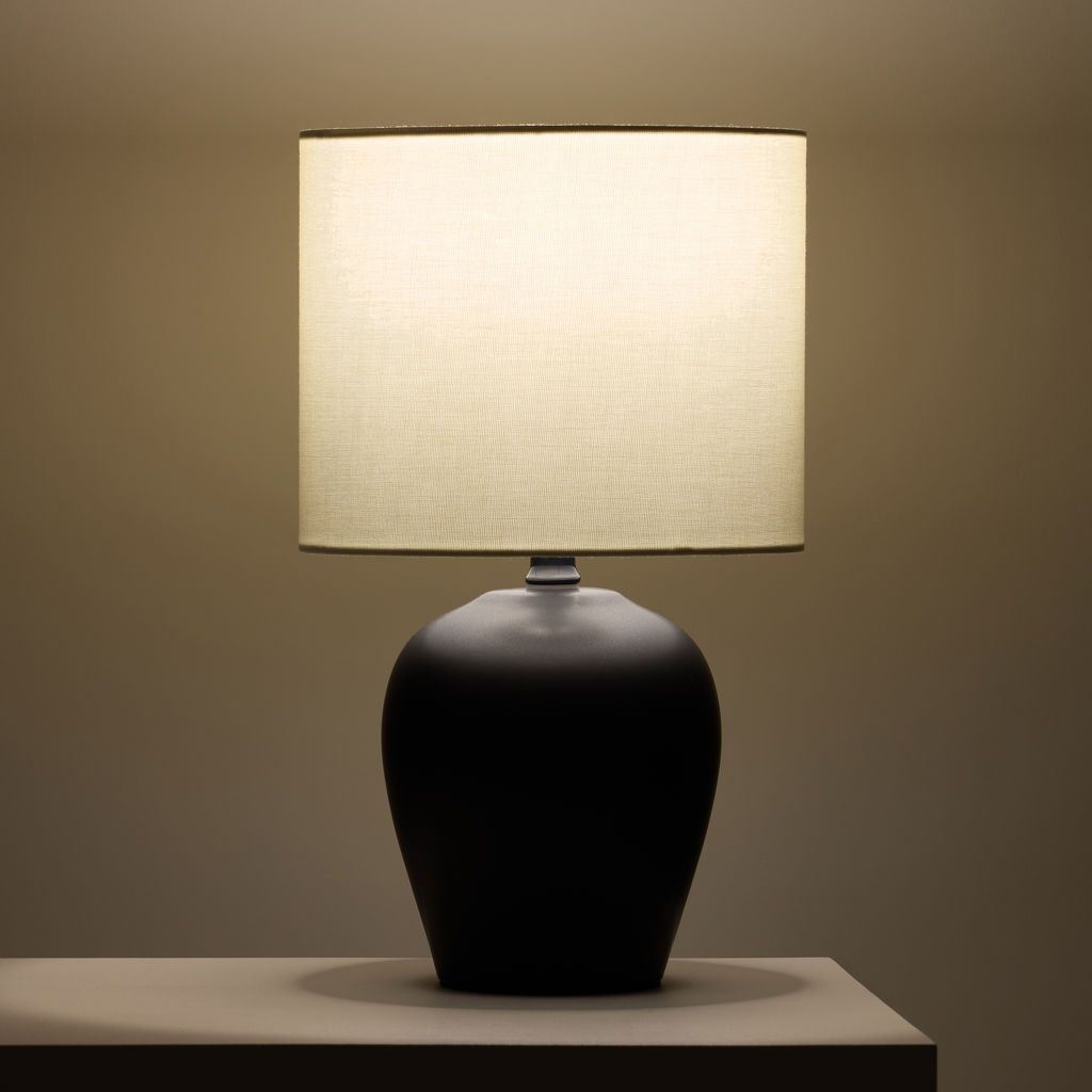 Avec sa base lisse en forme de jarre rond en céramique noire et son abat-jour en tissu ivoire, cette lampe de style transitionnel est un excellent moyen d'éclairer une chambre à coucher, un salon ou un bureau.