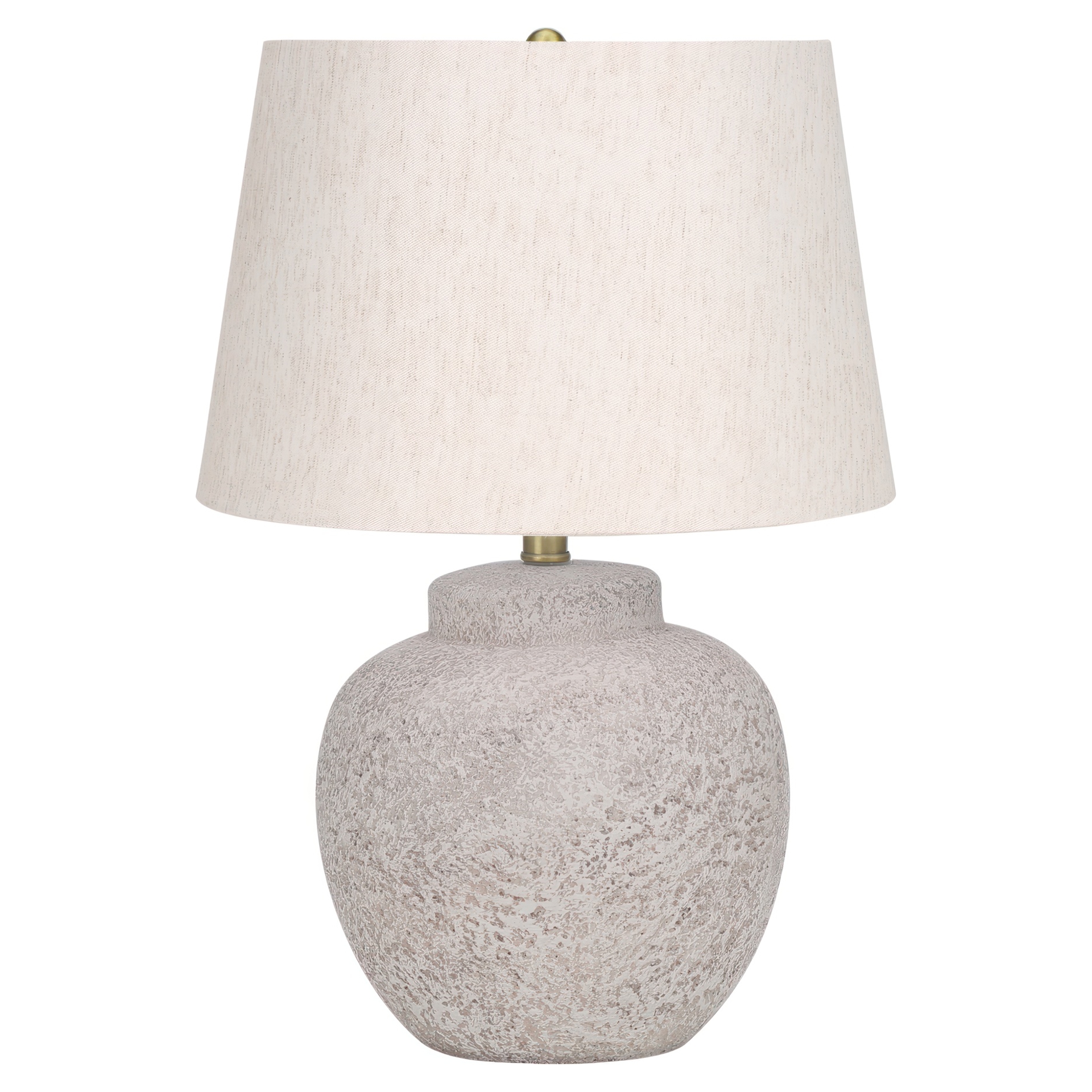 La base en béton crème en forme d'urne avec une finition texturée est complétée par un abat-jour empire en lin ivoire, et surmontée d'un fleuron rond en métal doré.