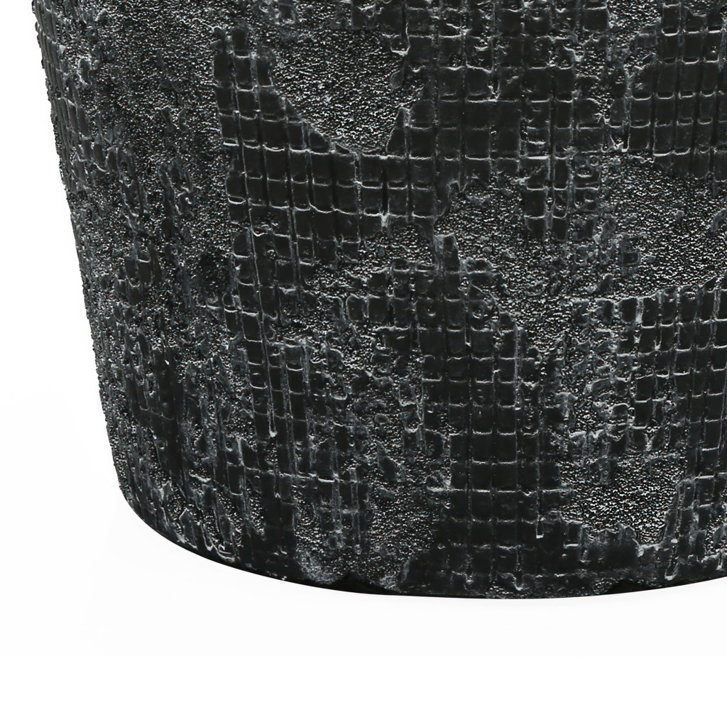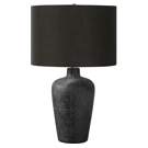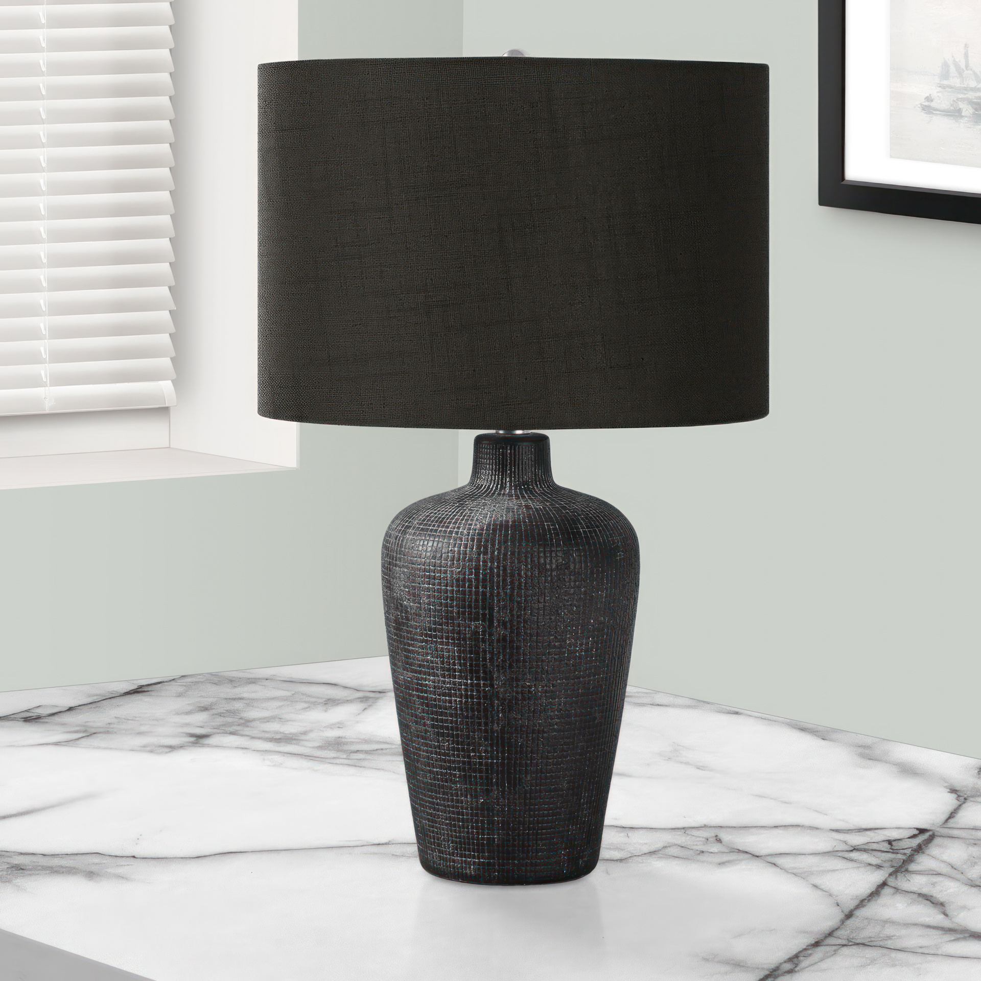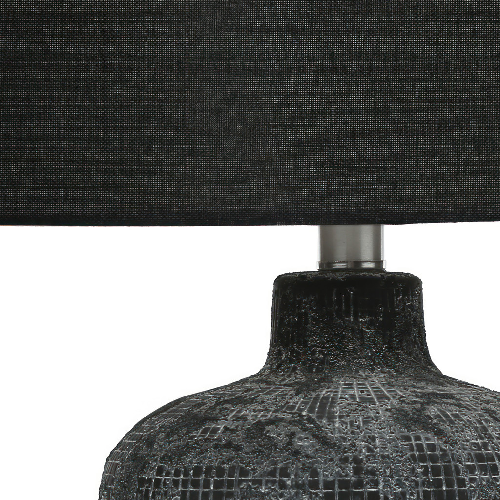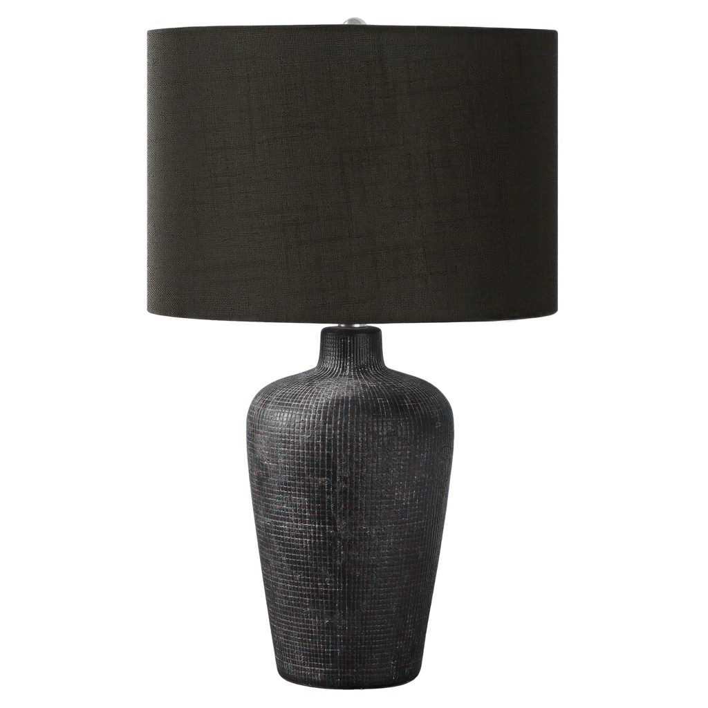 Un beau mélange de base en céramique noire texturée en forme de vase et d'abat-jour en tissu noir, terminé par un fleuron rond noir, cette lampe est un excellent moyen d'éclairer une chambre à coucher, un salon ou un bureau.