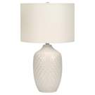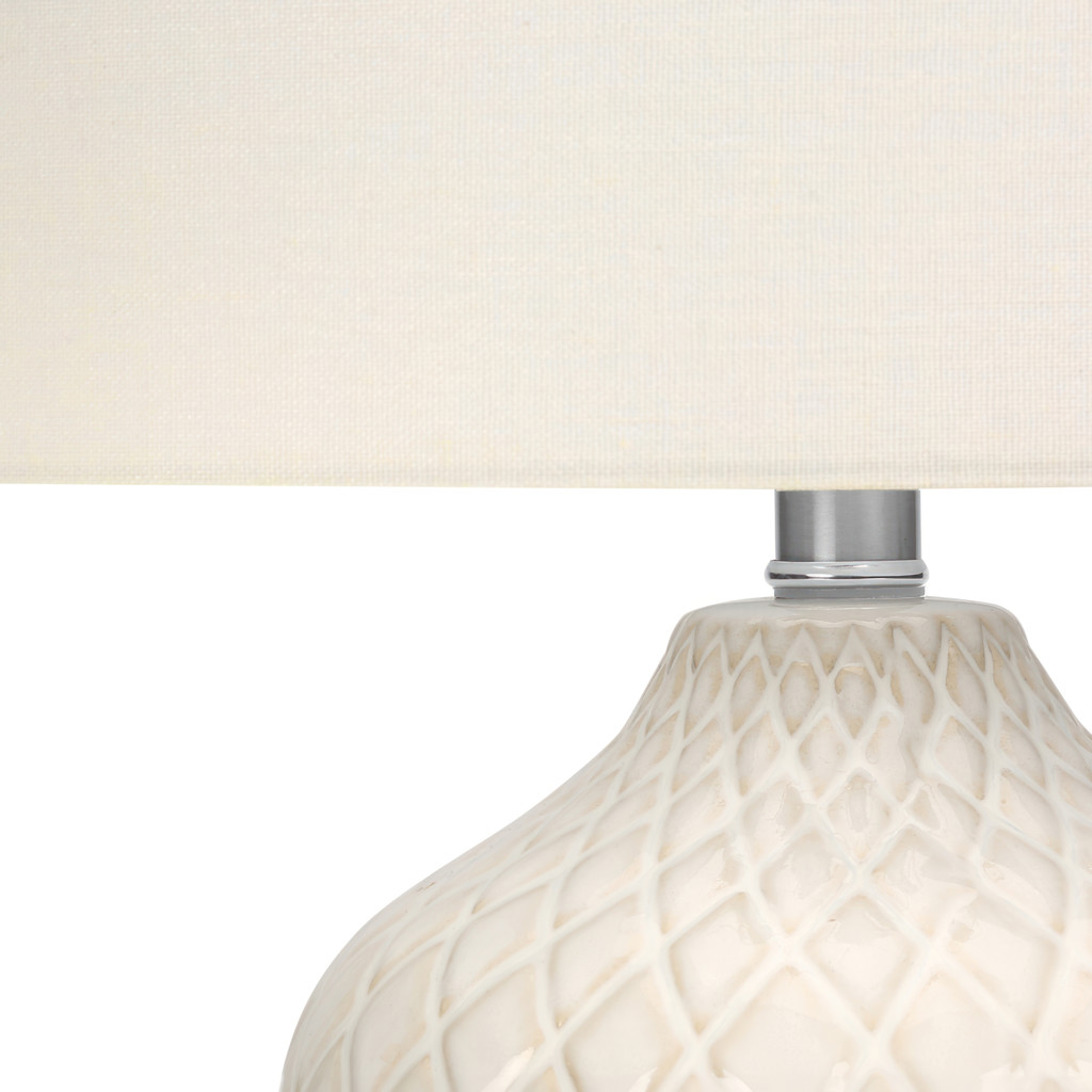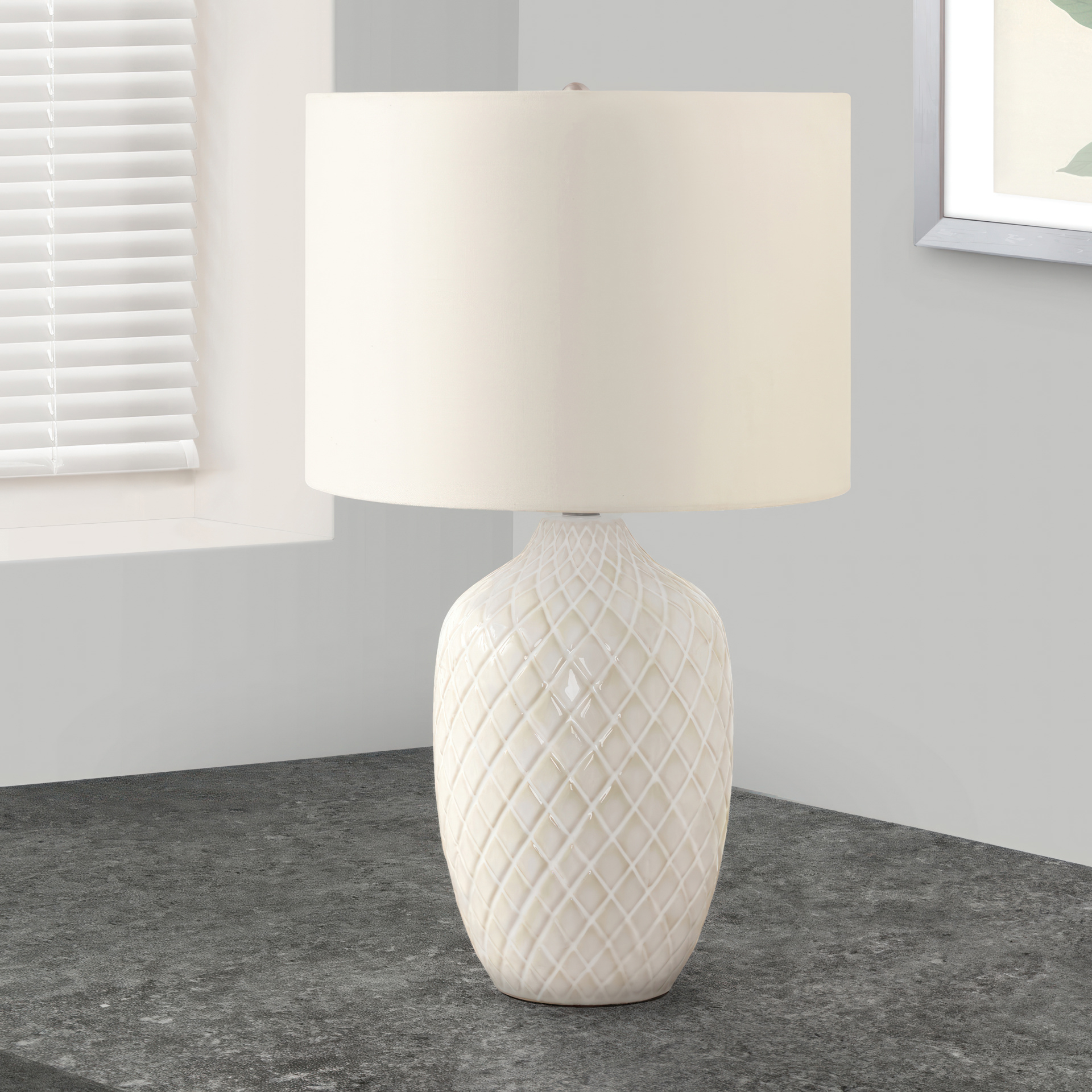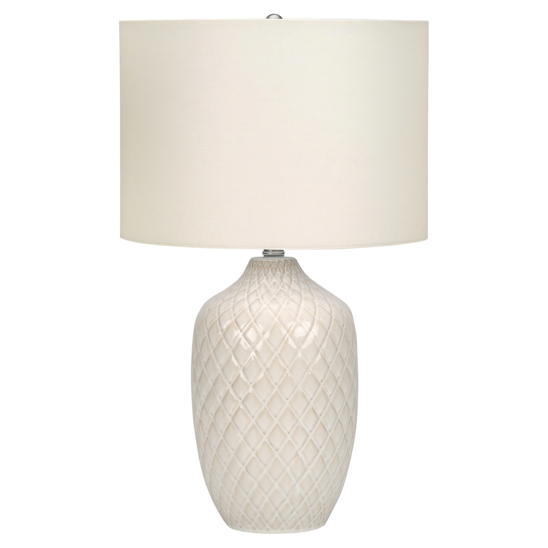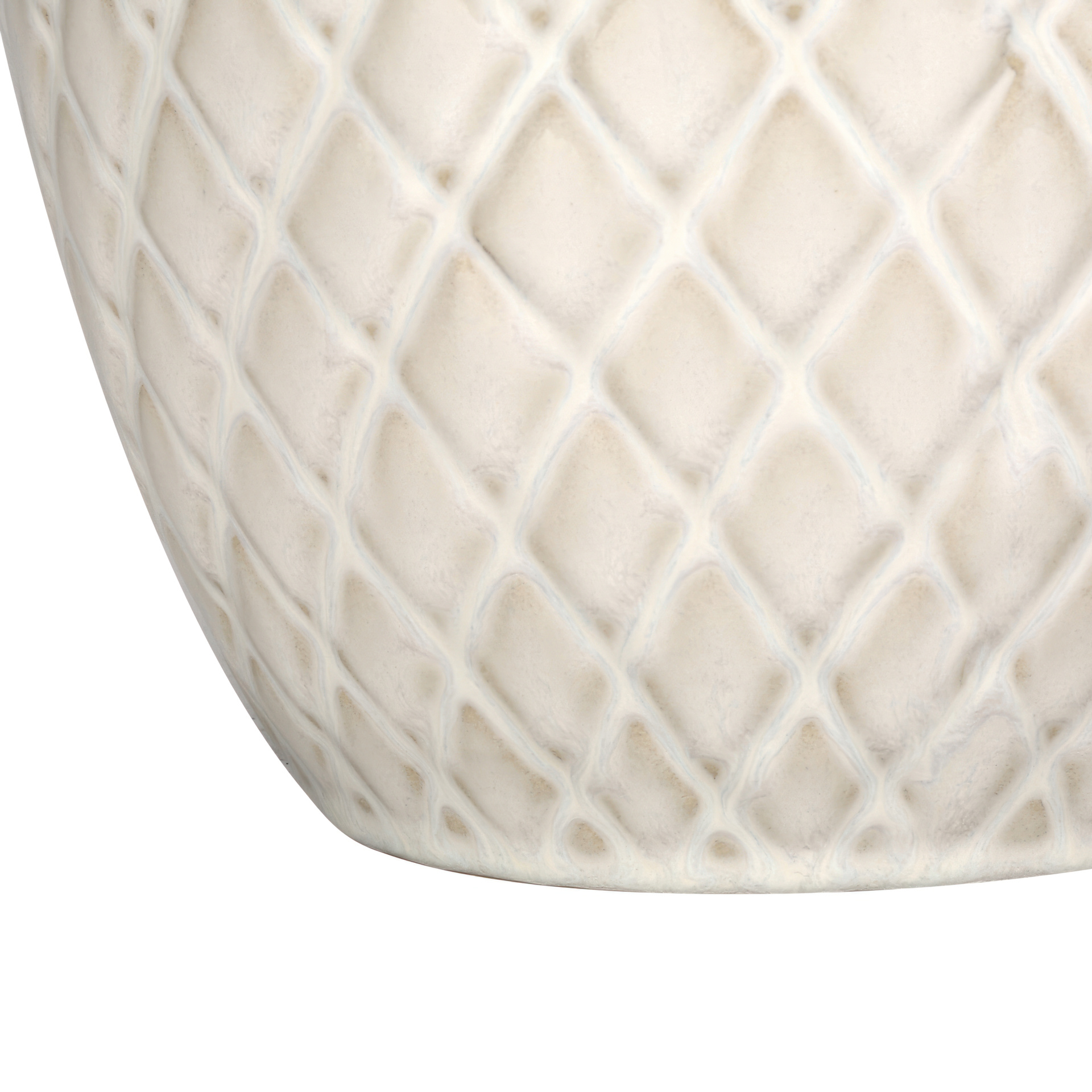 La lampe en forme de pot de gingembre de 25 pouces de haut comprend une base en céramique crème émaillée avec une texture géométrique en diamant et un abat-jour ivoire en lin, terminé par un embout argenté sur le dessus.