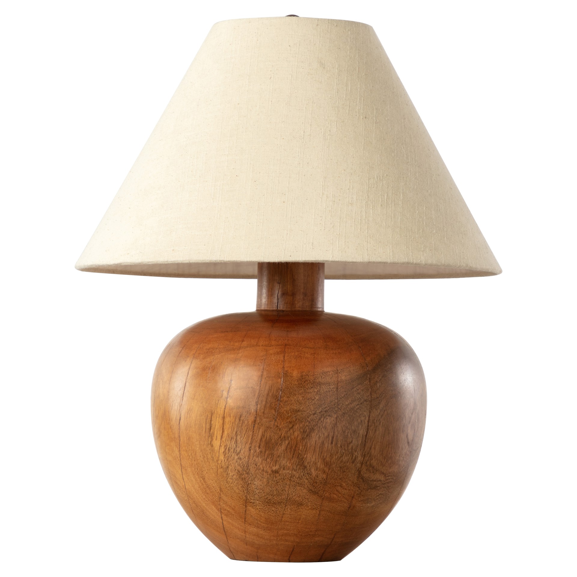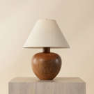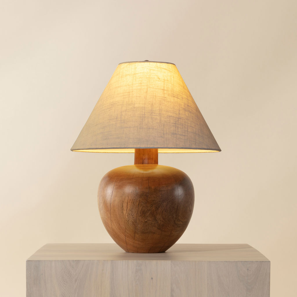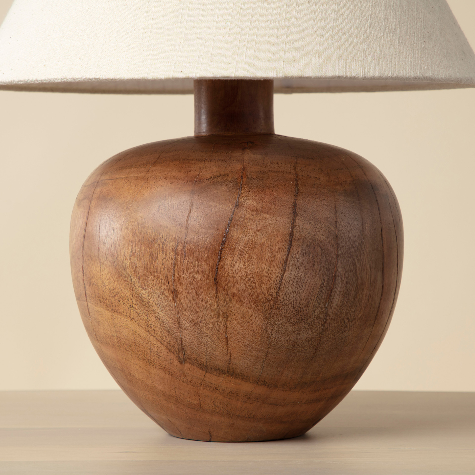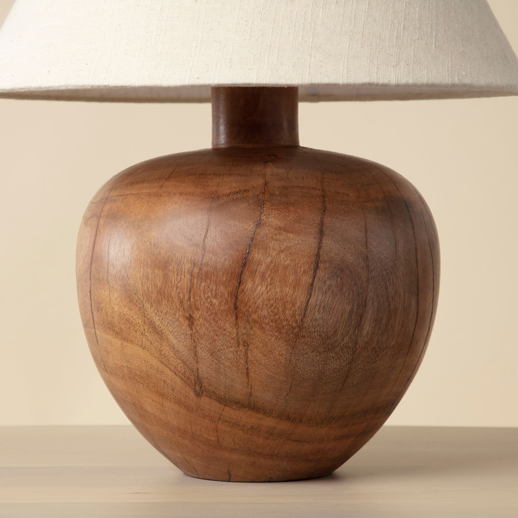 Surmontée d'un abat-jour en lin beige qui met en valeur la beauté naturelle du bois.