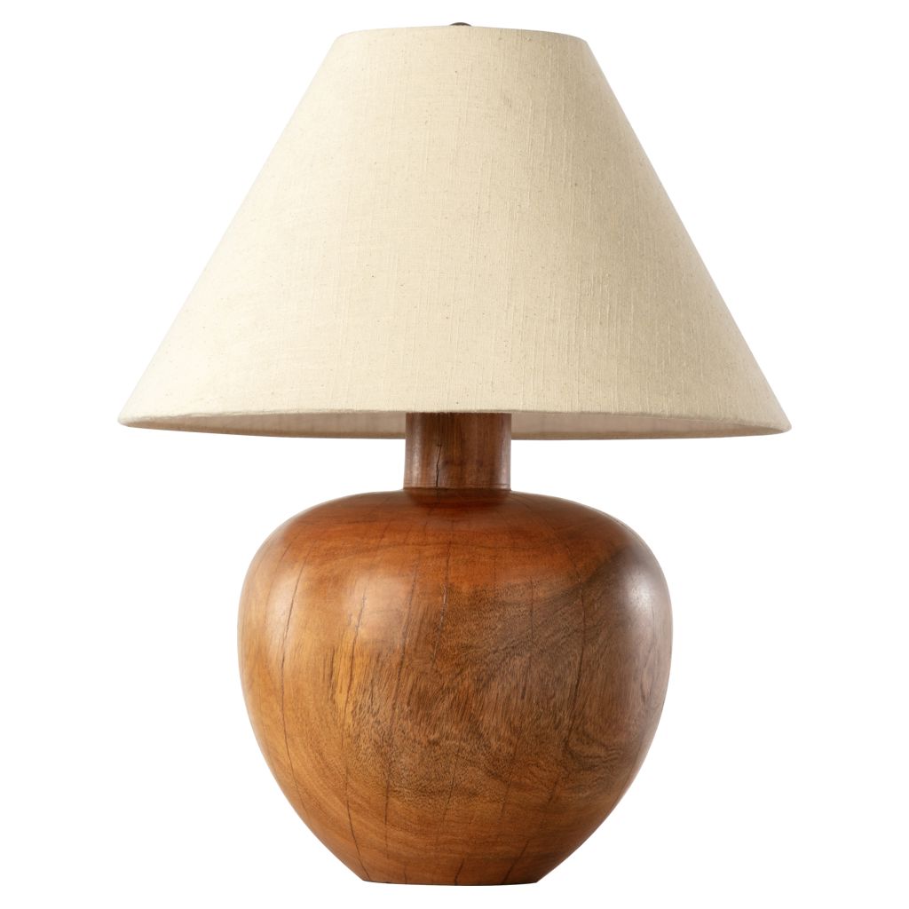 Fabriquée à la main en bois d'acacia avec une base sculptée, la lampe de table Dira apporte le charme rustique de l'extérieur à n'importe quelle pièce.