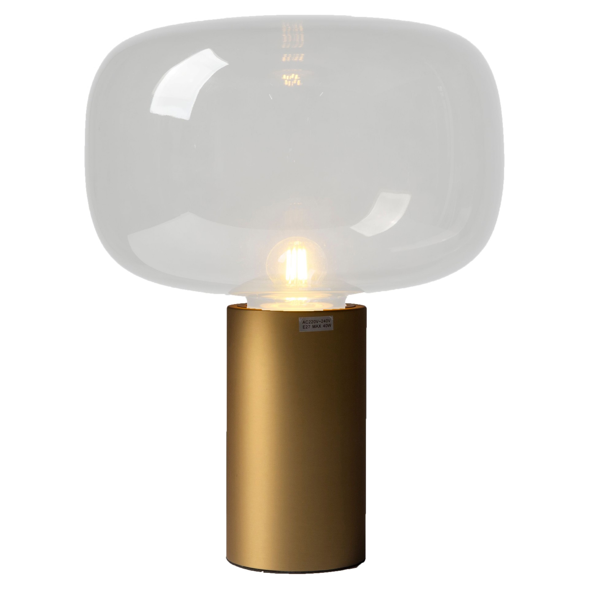 La lampe est dotée d'un abat-jour en verre transparent soufflé à la main qui fournit une lueur chaleureuse et invitante, créant une atmosphère chaleureuse dans n'importe quel espace. La base en laiton ajoute à l'esthétique élégante et moderne de la lampe, ce qui en fait un complément parfait aux intérieurs contemporains.