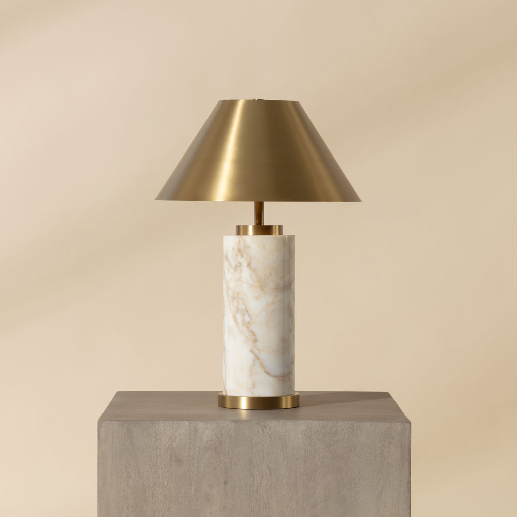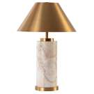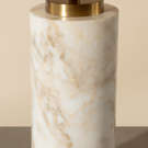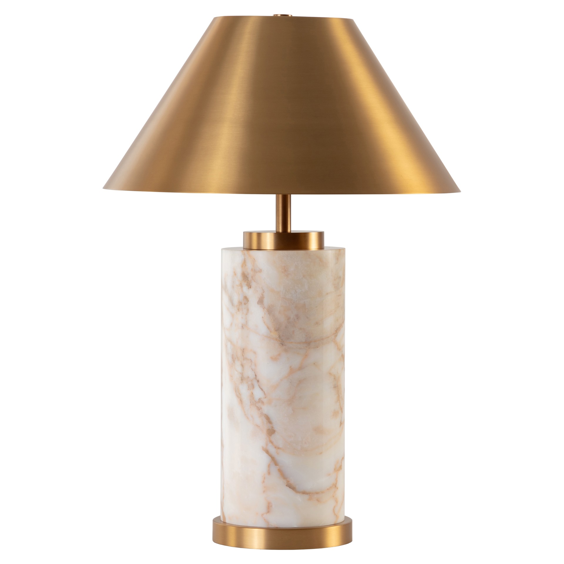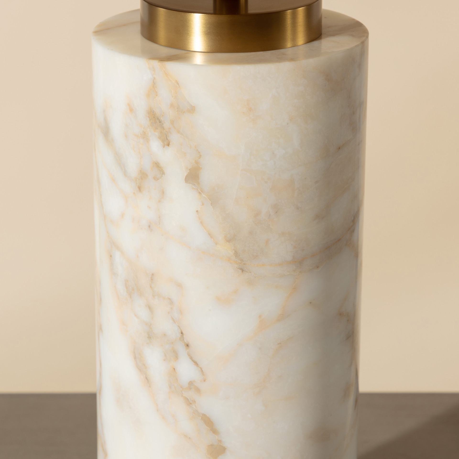 La lampe de table Cilla présente une opulente combinaison de matériaux luxueux. Son socle cylindrique en marbre italien riche met en valeur des nuances de couleurs variées et des veinures organiques, conférant à chaque lampe un caractère unique.