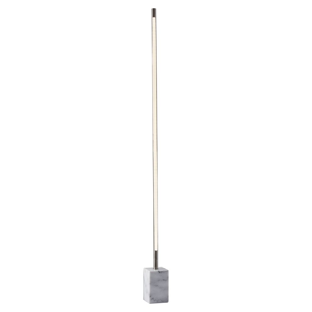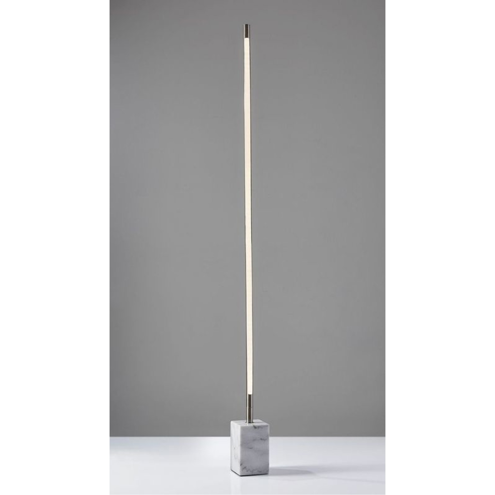 Un long tube de 1 po émet 2 500 lumens de lumière entièrement dimmable qui se reflète sur le mur, remplissant la pièce d'une lueur chaude et ambiante. Une grosse base en marbre gris de forme rectangulaire ajoute une touche d'élégance à ce style moderne.