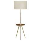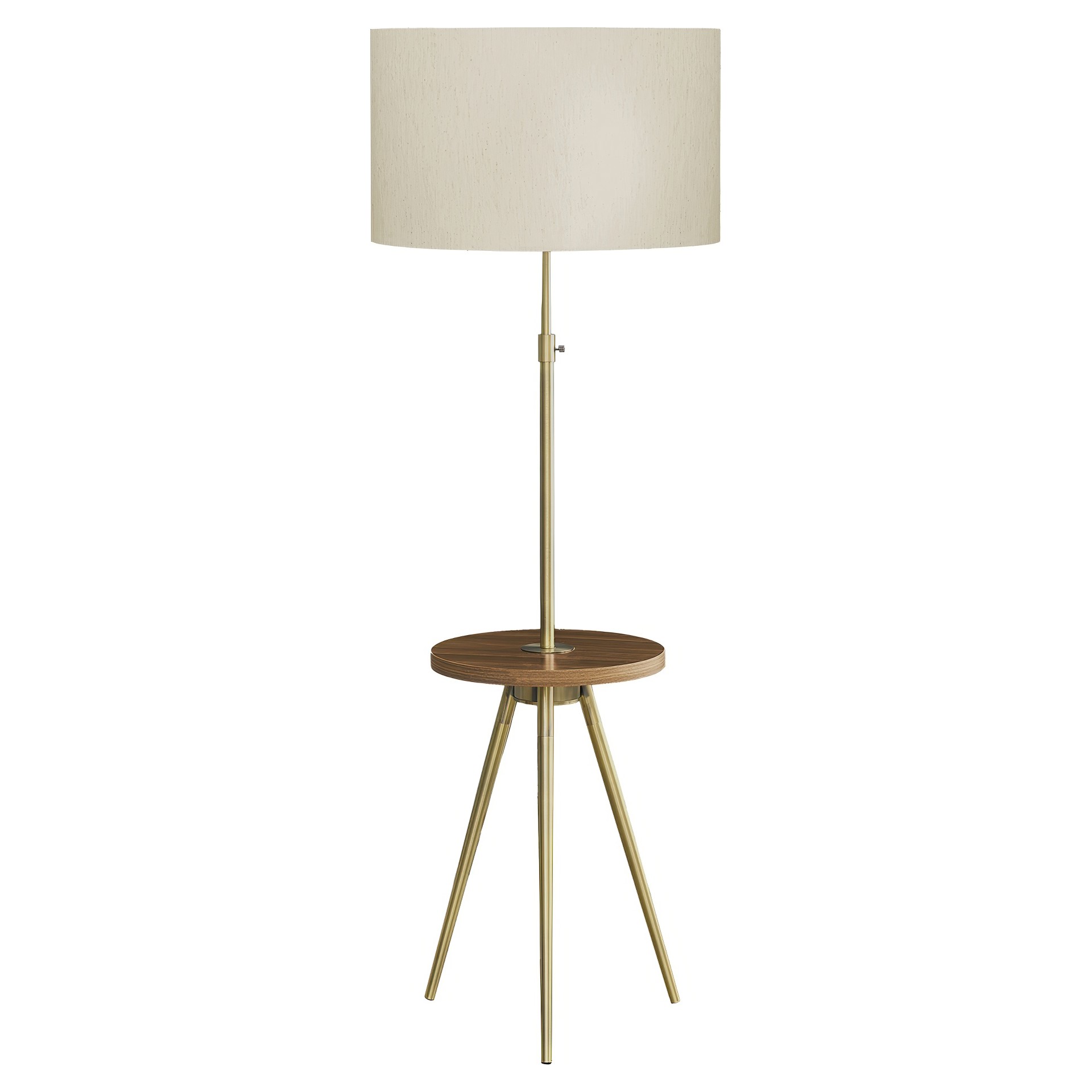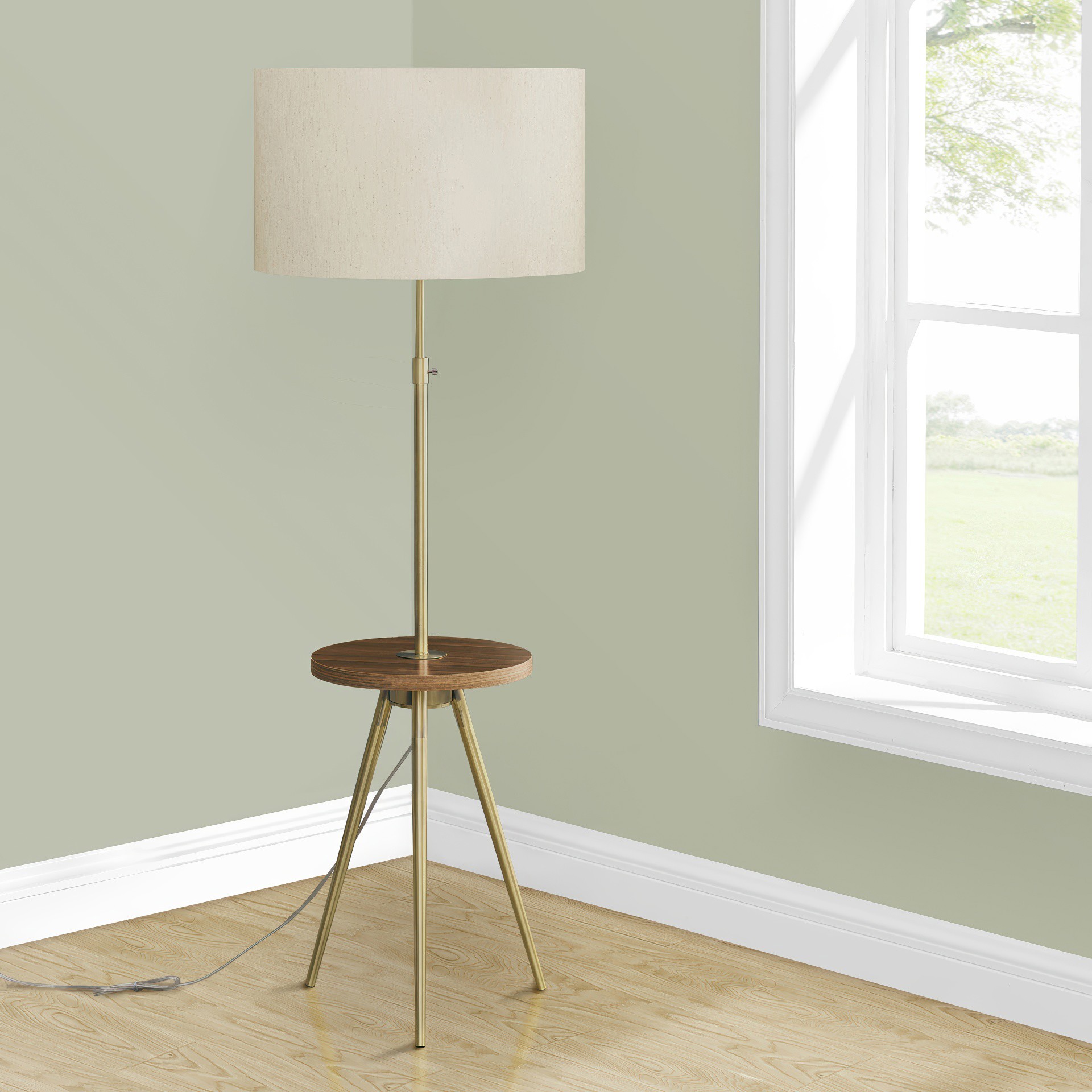 Apportez une ambiance sans effort à votre espace de vie avec notre lampadaire trépied élégant et moderne de 66 pouces de haut en métal doré avec étagère intégrée en stratifié noyer et surmonté d'un abat-jour en tissu lin ivoire en forme de tambour.