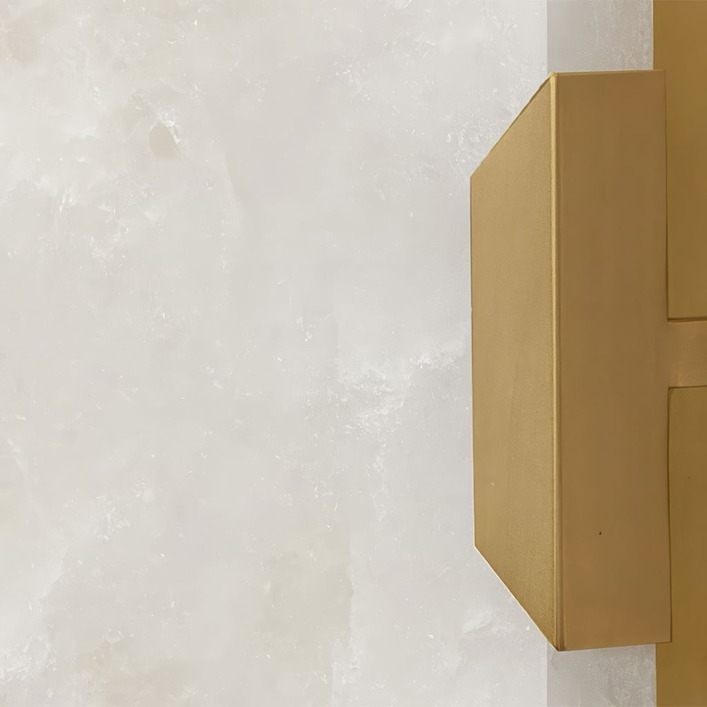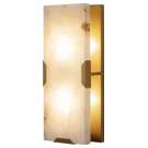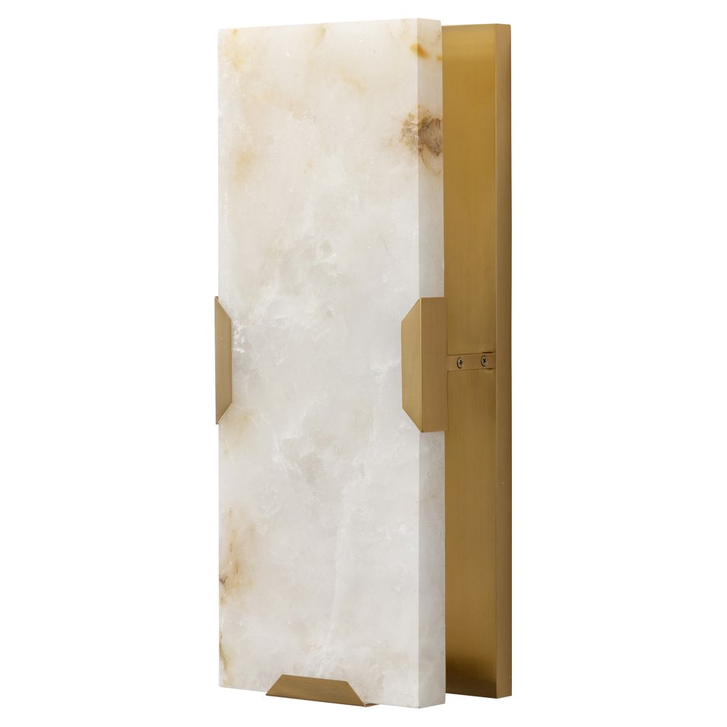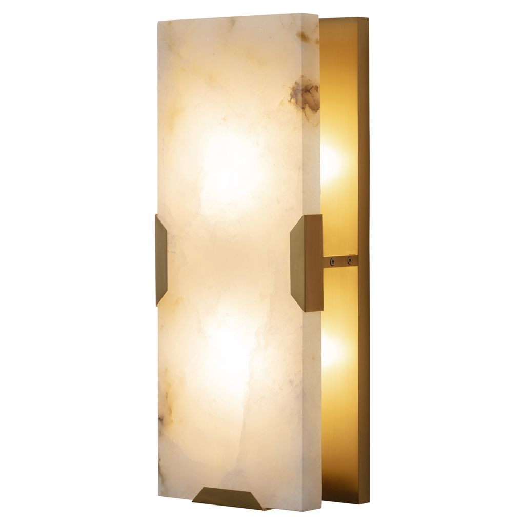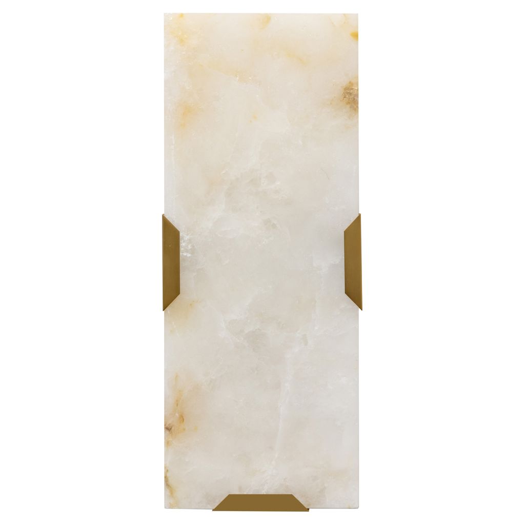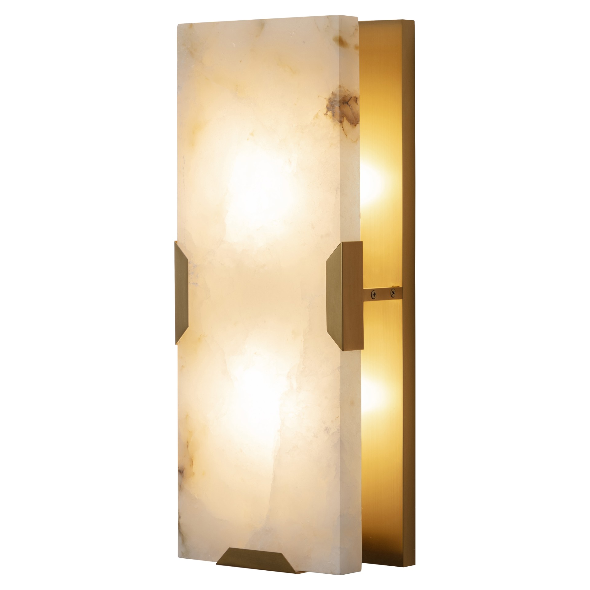 L'applique Rovira est une expression artistique de la beauté de la pierre naturelle. Un épais panneau d'albâtre sculpté à la main importé d'Espagne est fixé sur une base en fer doré brossé pour un design éblouissant.