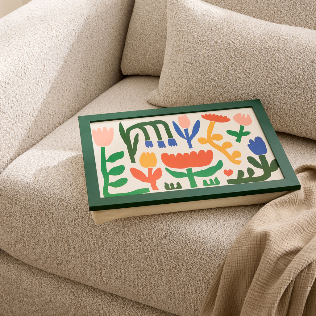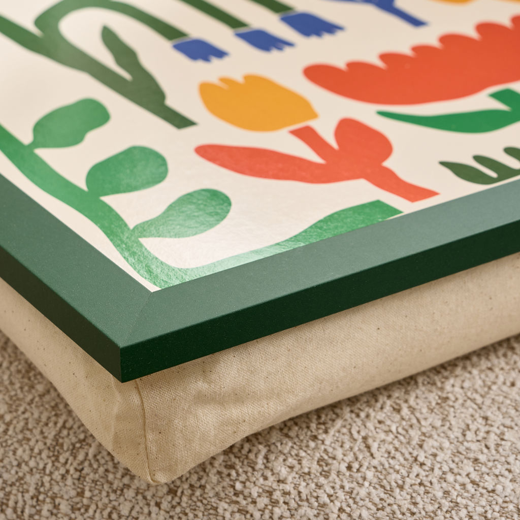 Plateau de lecture coussiné en bois et tissu canvas avec des motifs de fleurs.