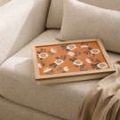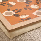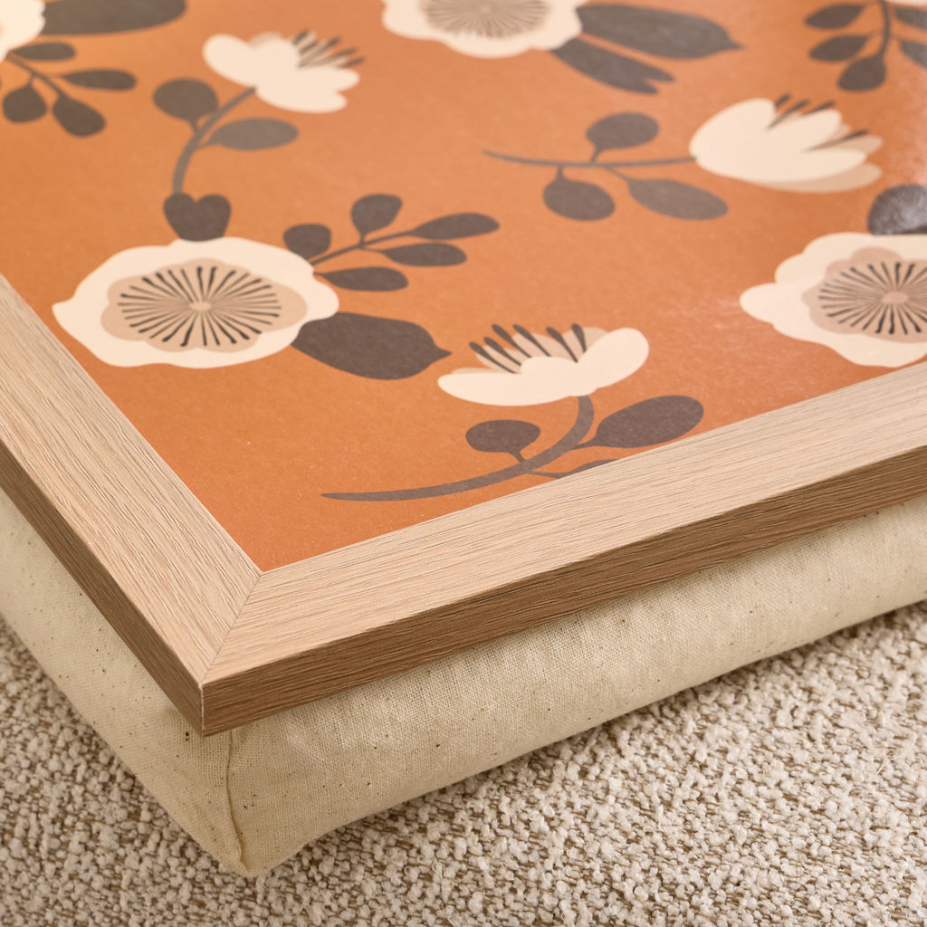 Plateau de lecture coussiné en bois et tissu canvas avec des motifs de fleurs.