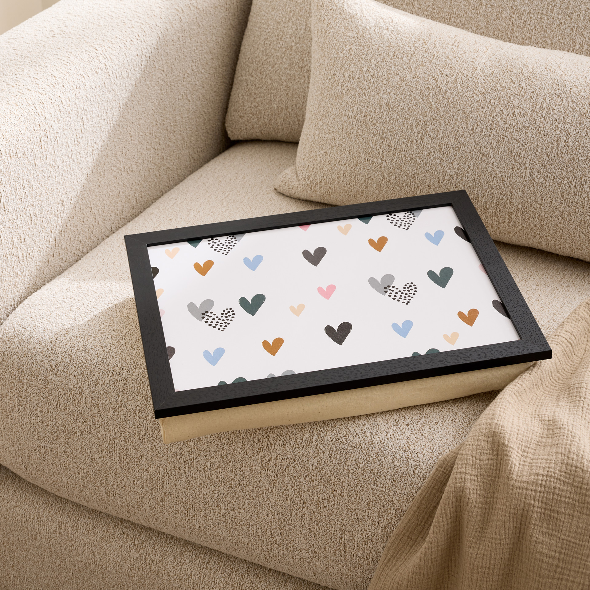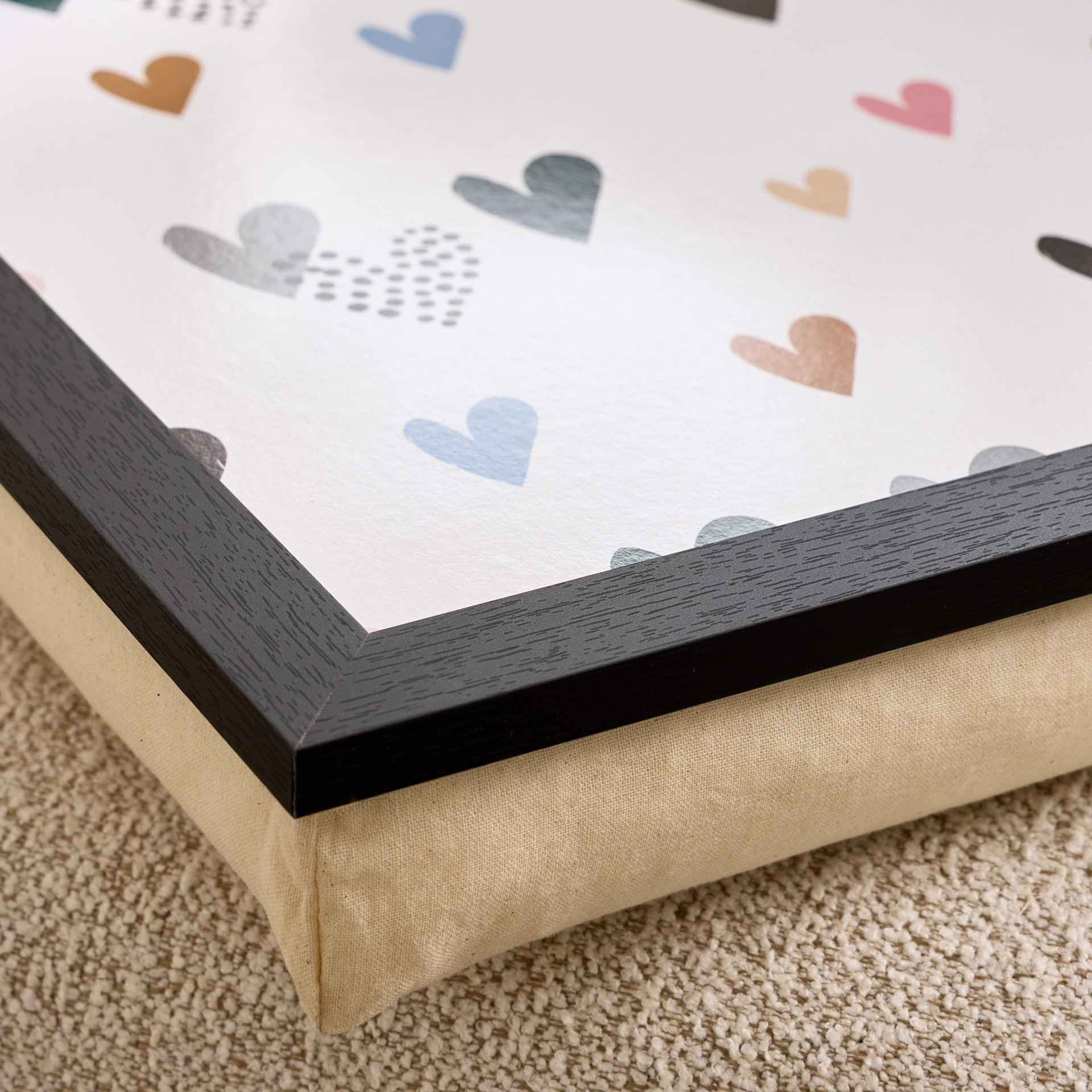 Plateau de lecture coussiné en bois et tissu canvas avec des motifs de coeurs.