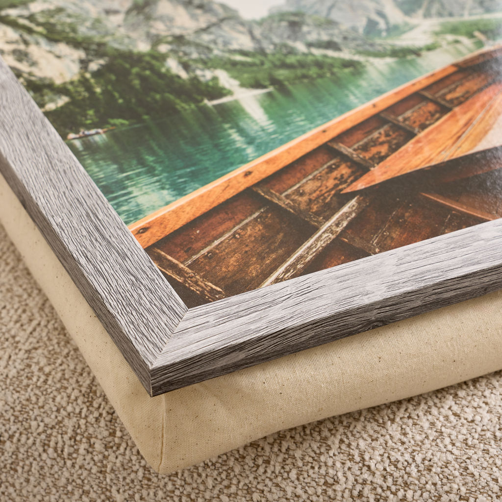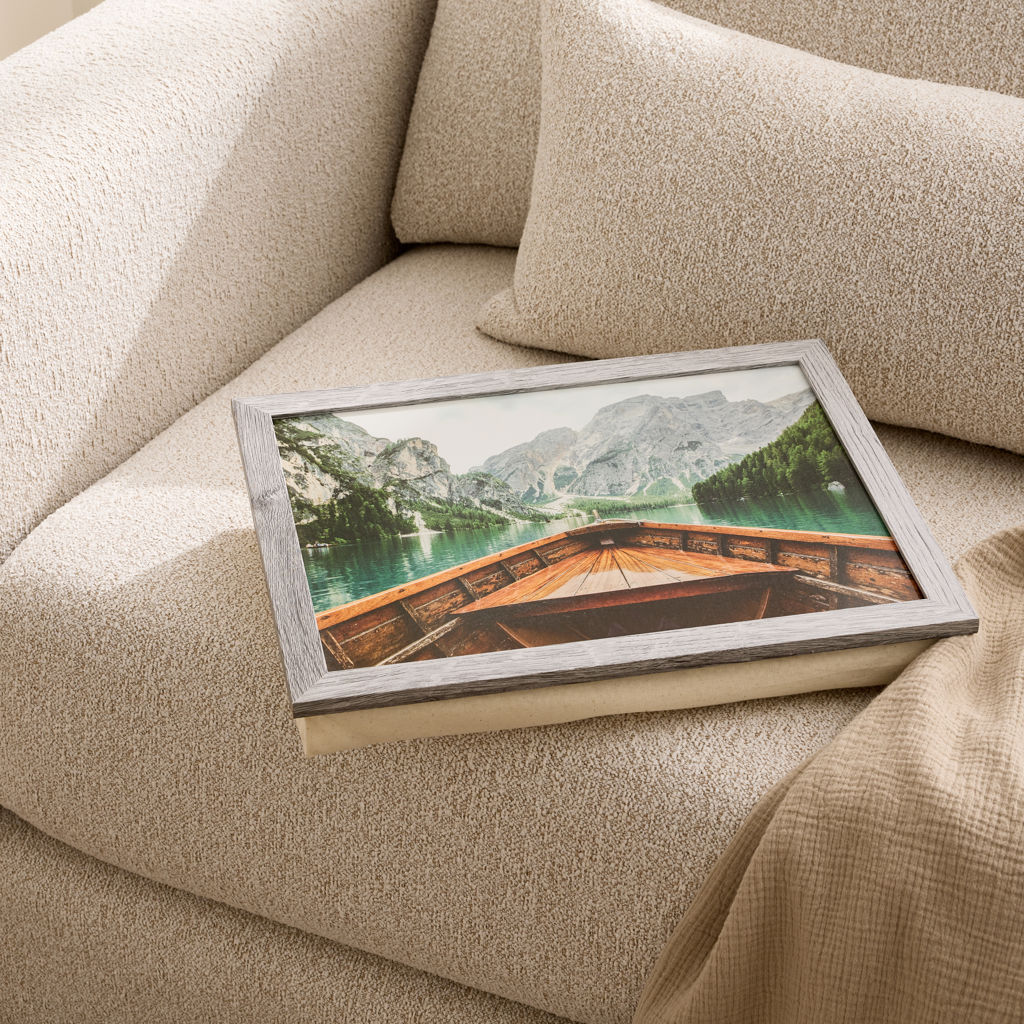 Plateau de lecture coussiné en bois et tissu canvas avec un image de barque.