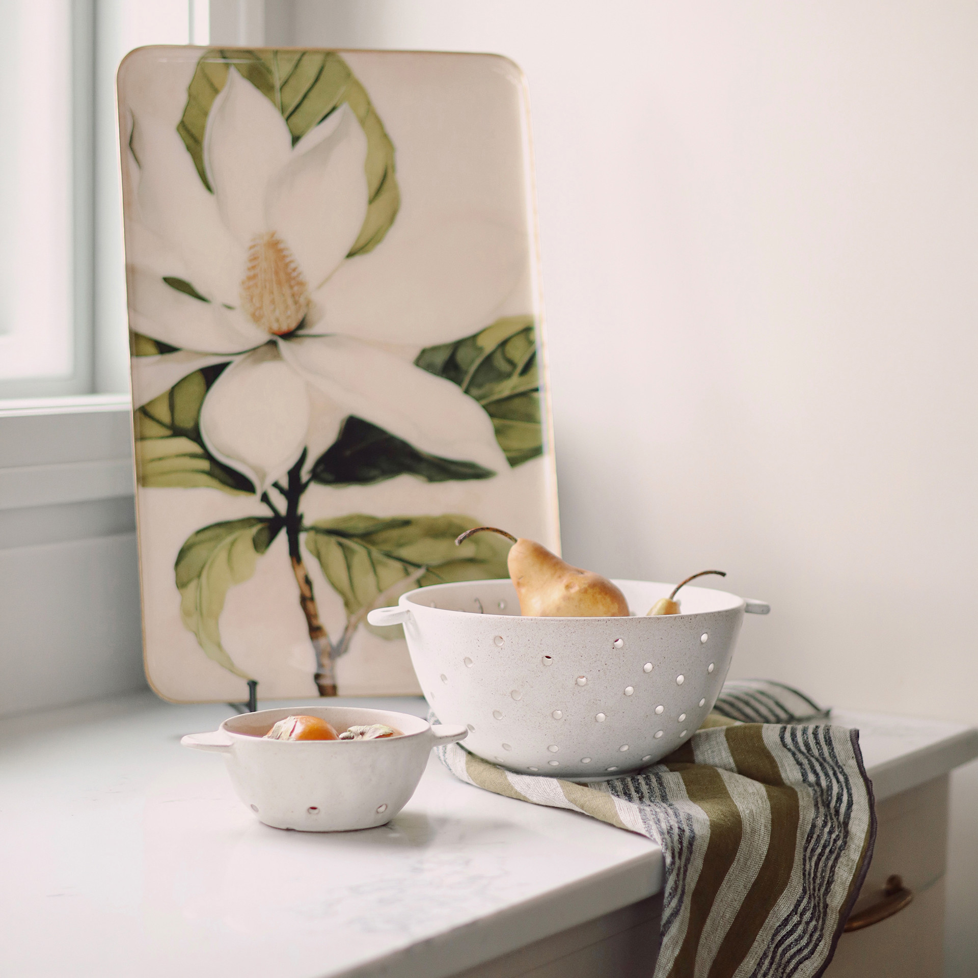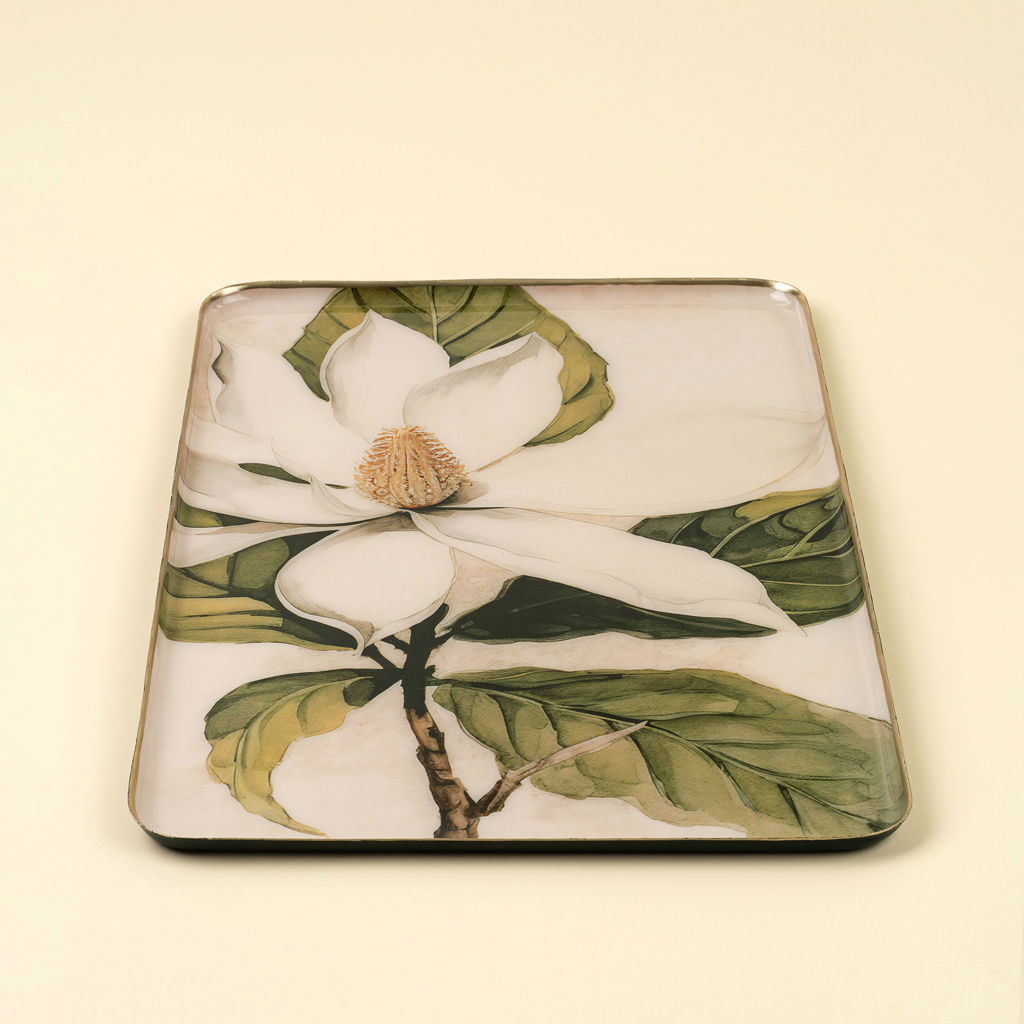 Élégant et saisissant, ce plateau décoratif émaillé orné d'une fleur de magnolia apporte une beauté intemporelle à votre intérieur grâce à une illustration botanique grand format inspirée des estampes anciennes.