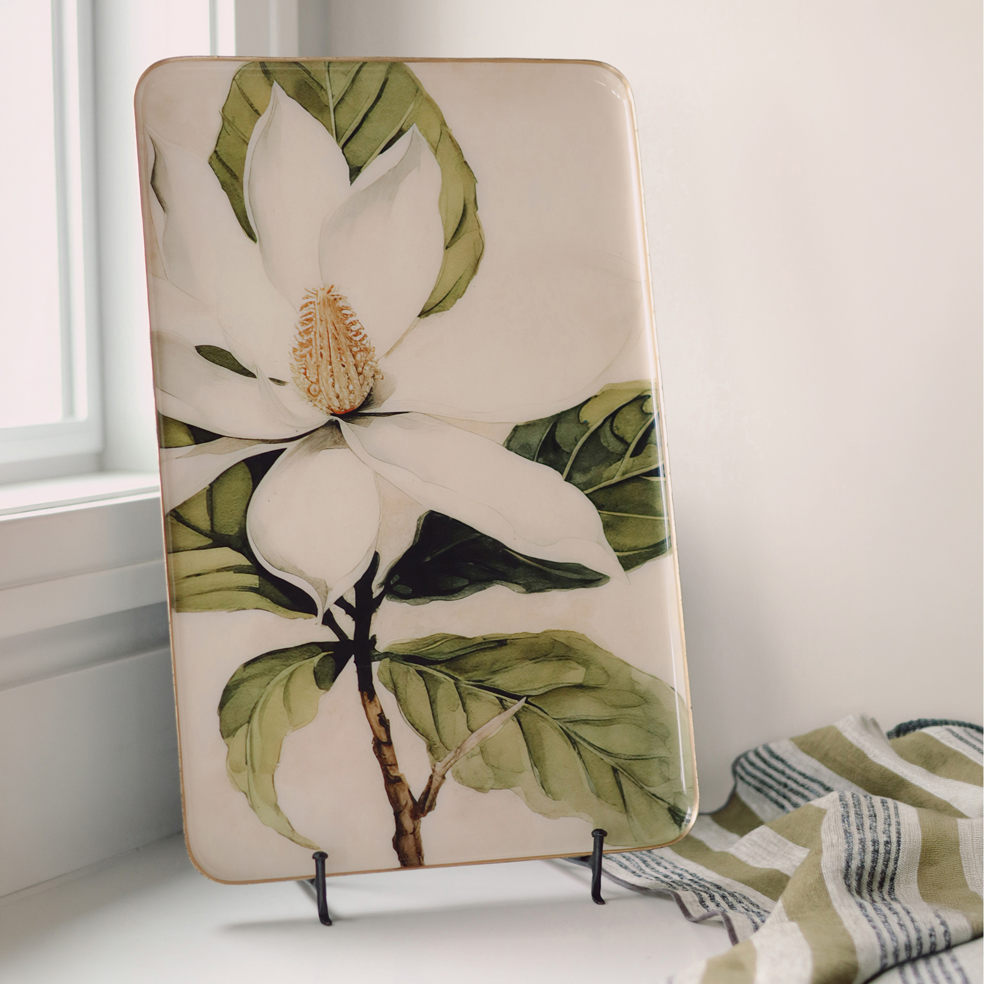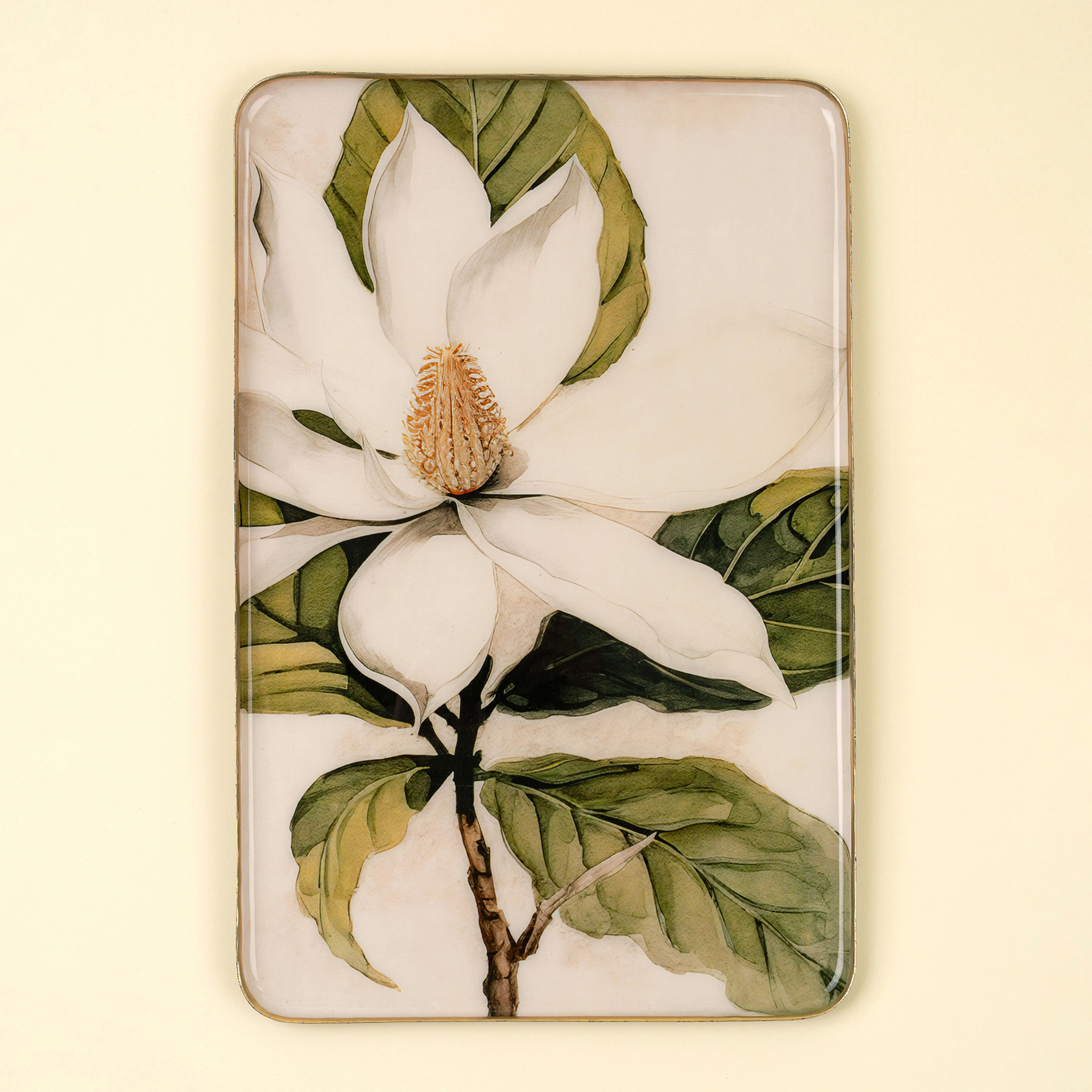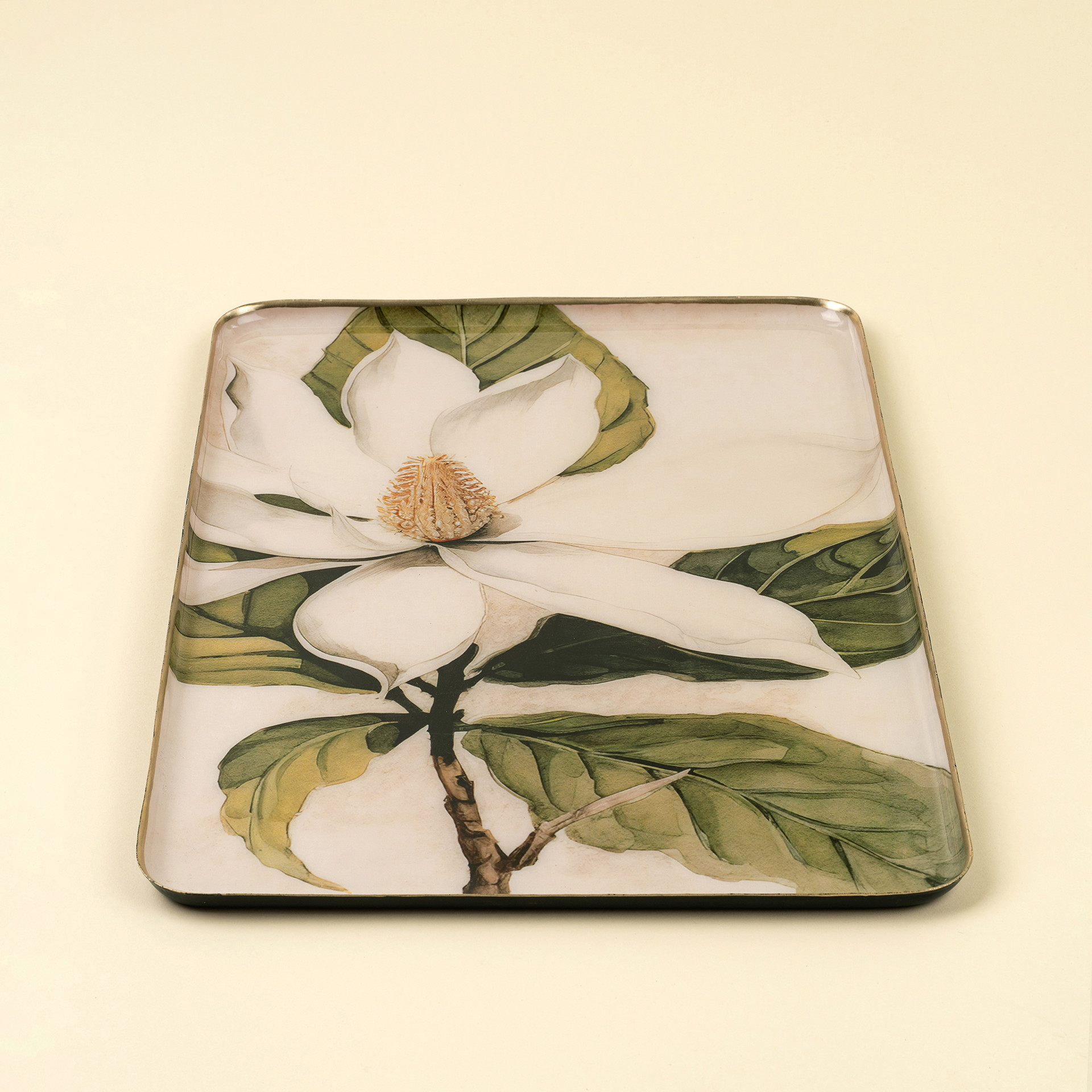 Le motif de magnolia, doux et pictural, dégage une impression de raffinement et d'expressivité, faisant de ce plateau décoratif une pièce remarquable, qu'il soit posé sur un meuble ou exposé comme une uvre d'art.