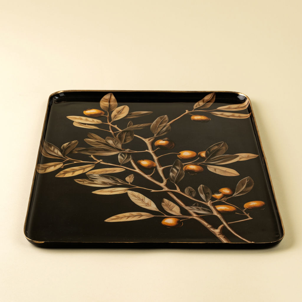 Orné d'un motif de branche d'olivier d'inspiration vintage sur fond noir profond, ce plateau émaillé allie beauté et fonctionnalité, apportant une note distinctive à votre décoration intérieure au quotidien.