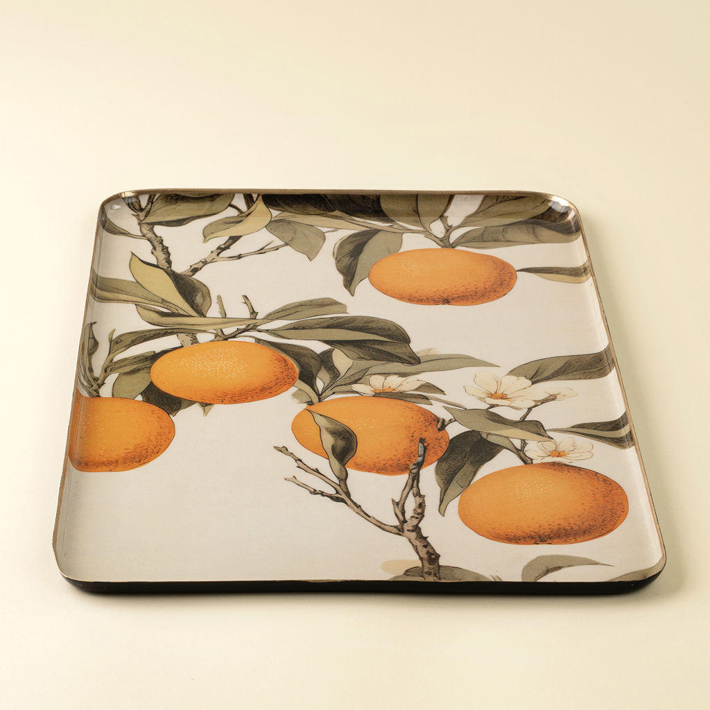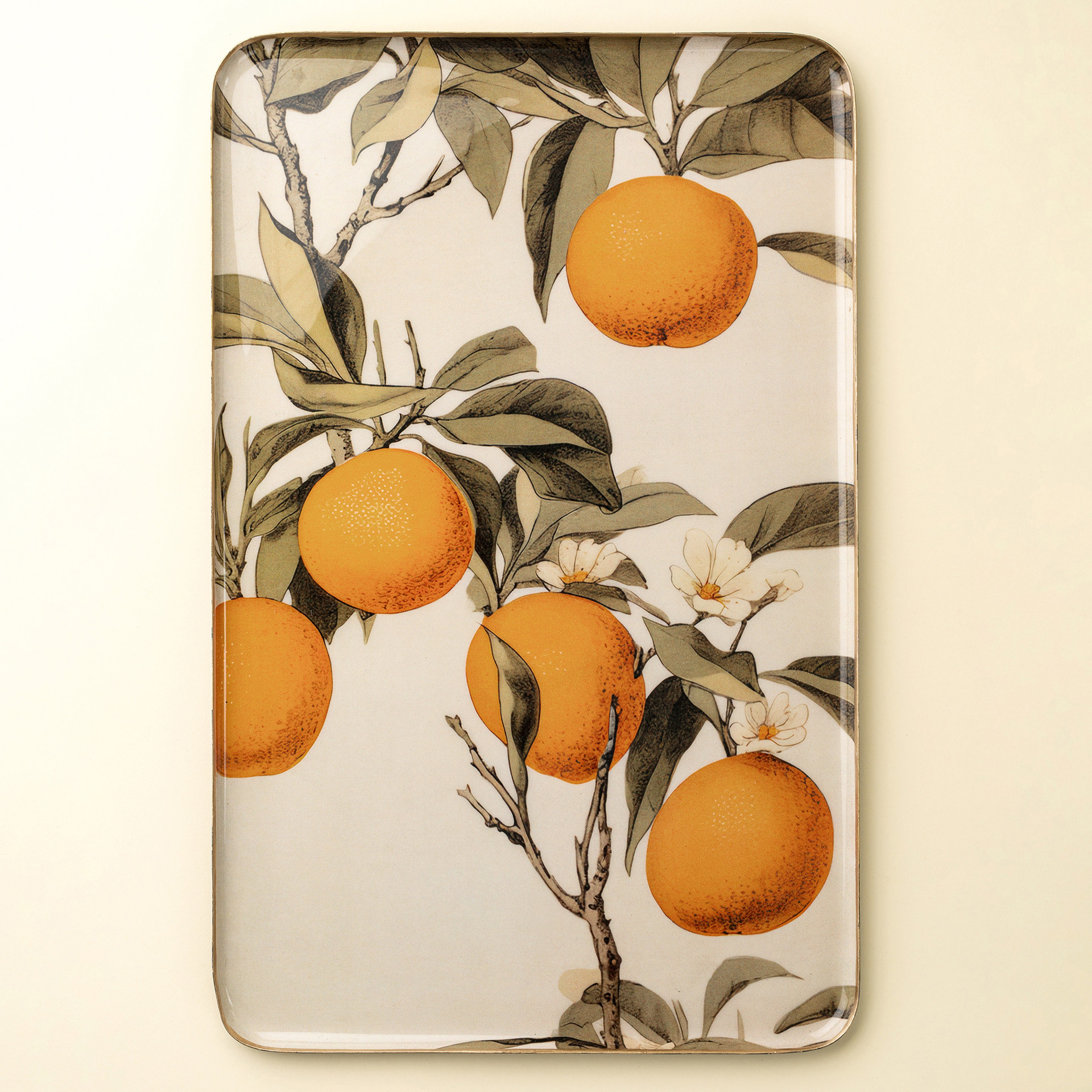 Inspiré d'illustrations botaniques anciennes, ce plateau arbore des motifs d'agrumes éclatants, à la fois classiques et joyeux, offrant une façon originale d'ajouter de la couleur et du caractère à vos espaces du quotidien.