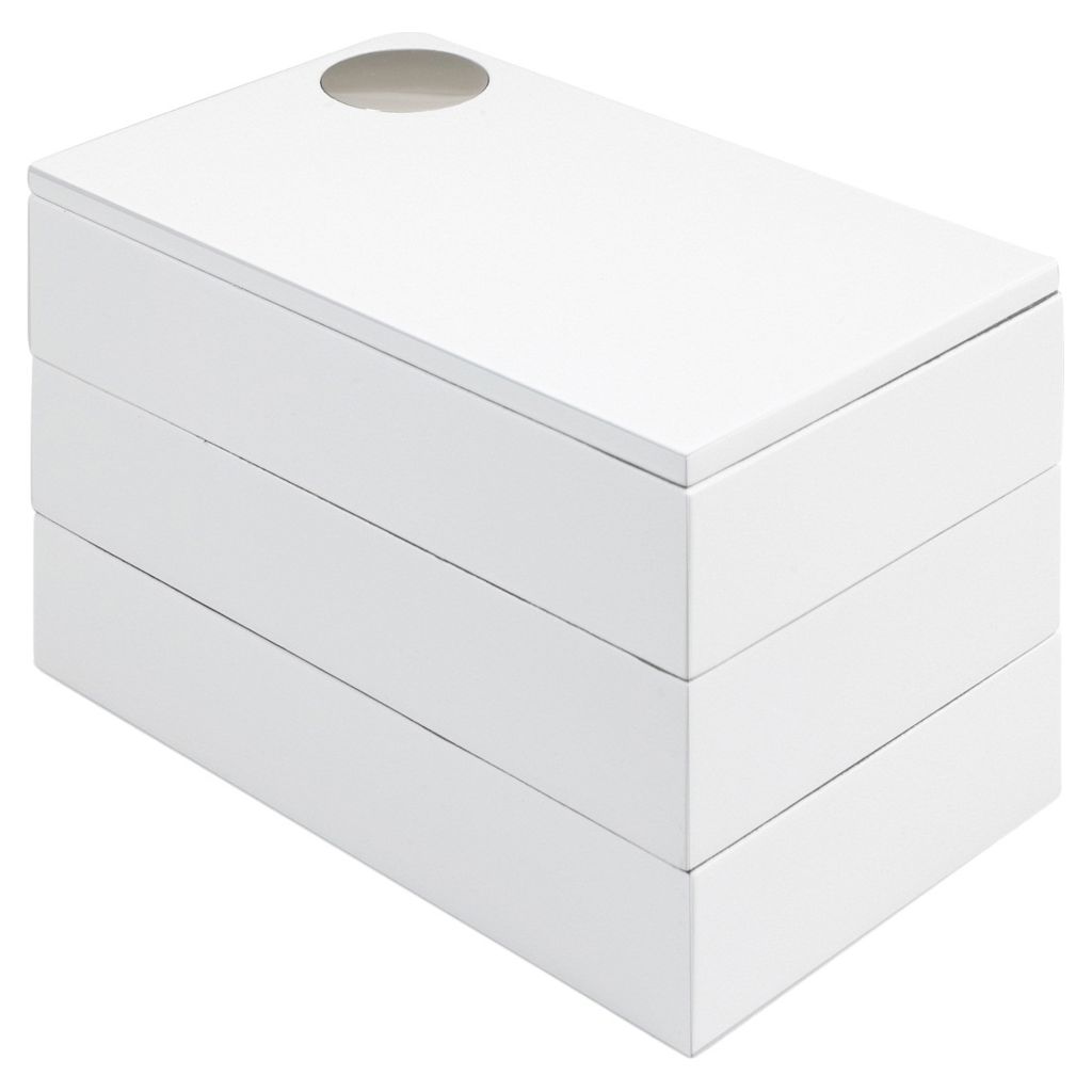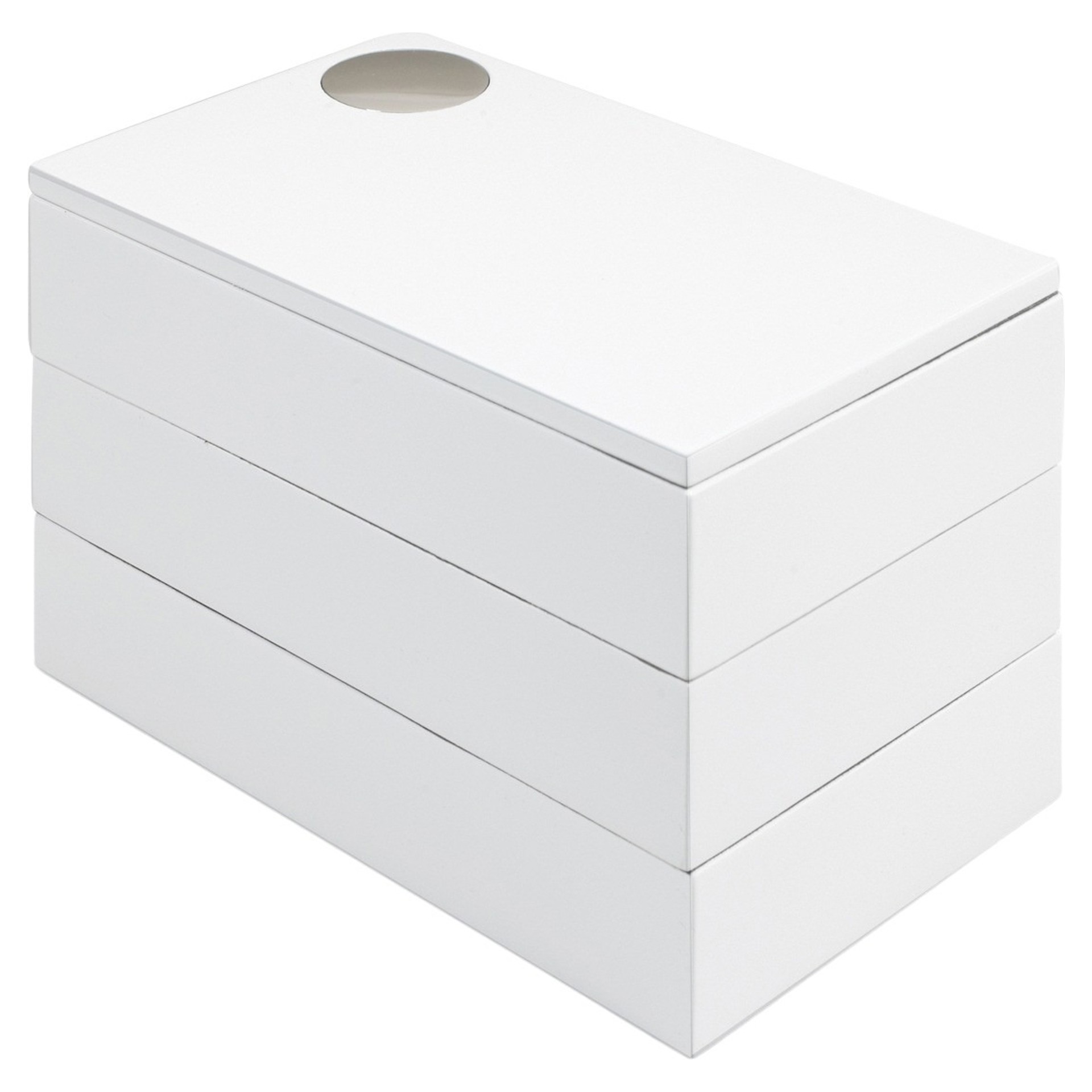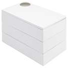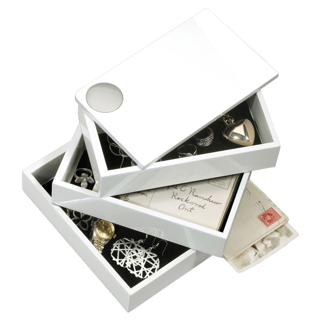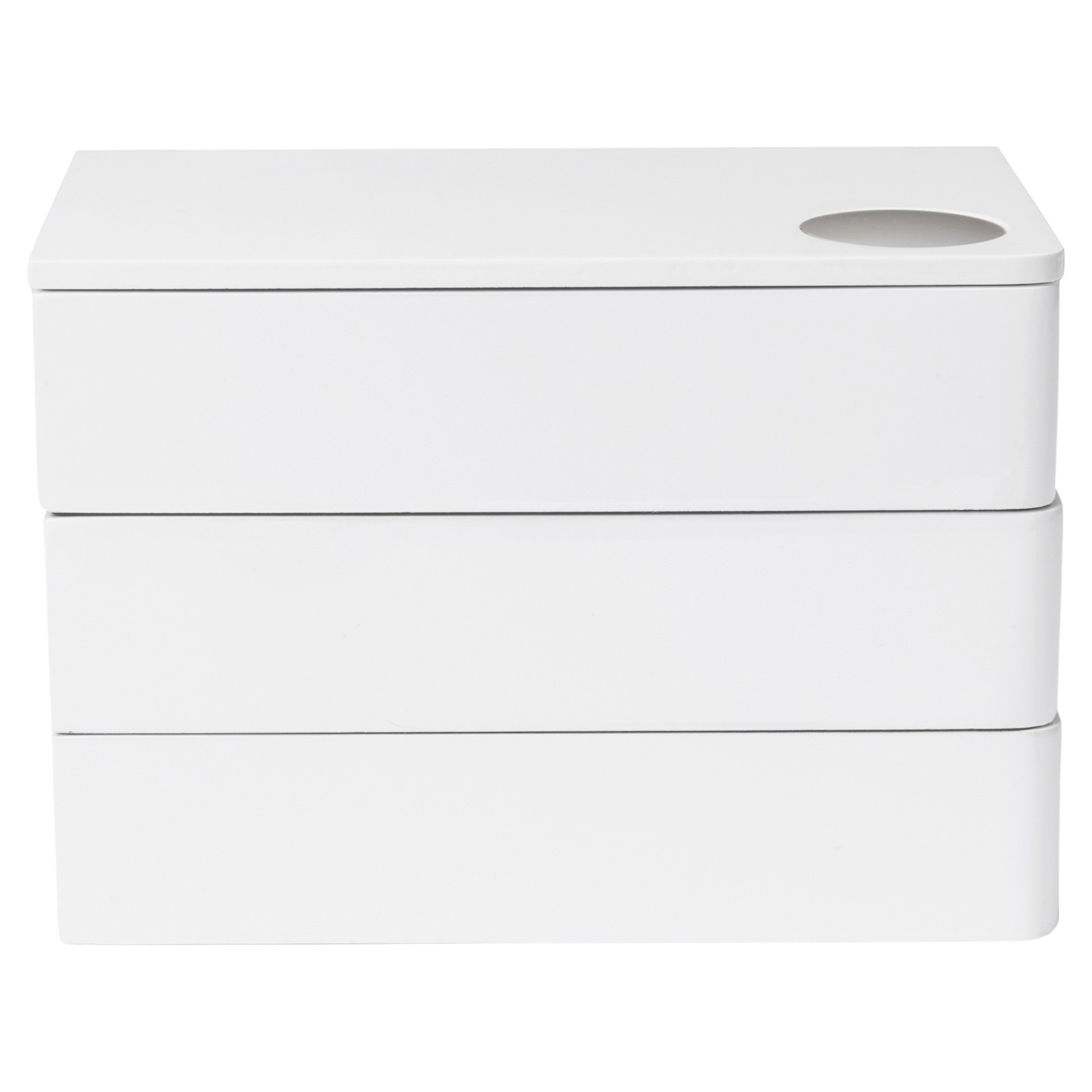 Utilisez Spindle pour conserver tous vos bijoux préférés au même endroit, ce qui les rend faciles d'accès. Trois compartiments cachés vous permettent de ranger vos bagues, boucles d'oreilles, bracelets, montres, colliers et autres accessoires dans différentes configurations, selon ce qui vous convient le mieux. Chaque tiroir est doublé d'un tissu doux pour empêcher vos bijoux de se déplacer ou d'être endommagés. Le design pivotant simple et moderne de Spindle est un ajout attrayant à votre commode, table de chevet, bureau ou partout où vous choisissez de le mettre. La broche a une finition blanche très brillante et une doublure en tissu doux en dessous pour éviter que vos meubles ne se rayent.