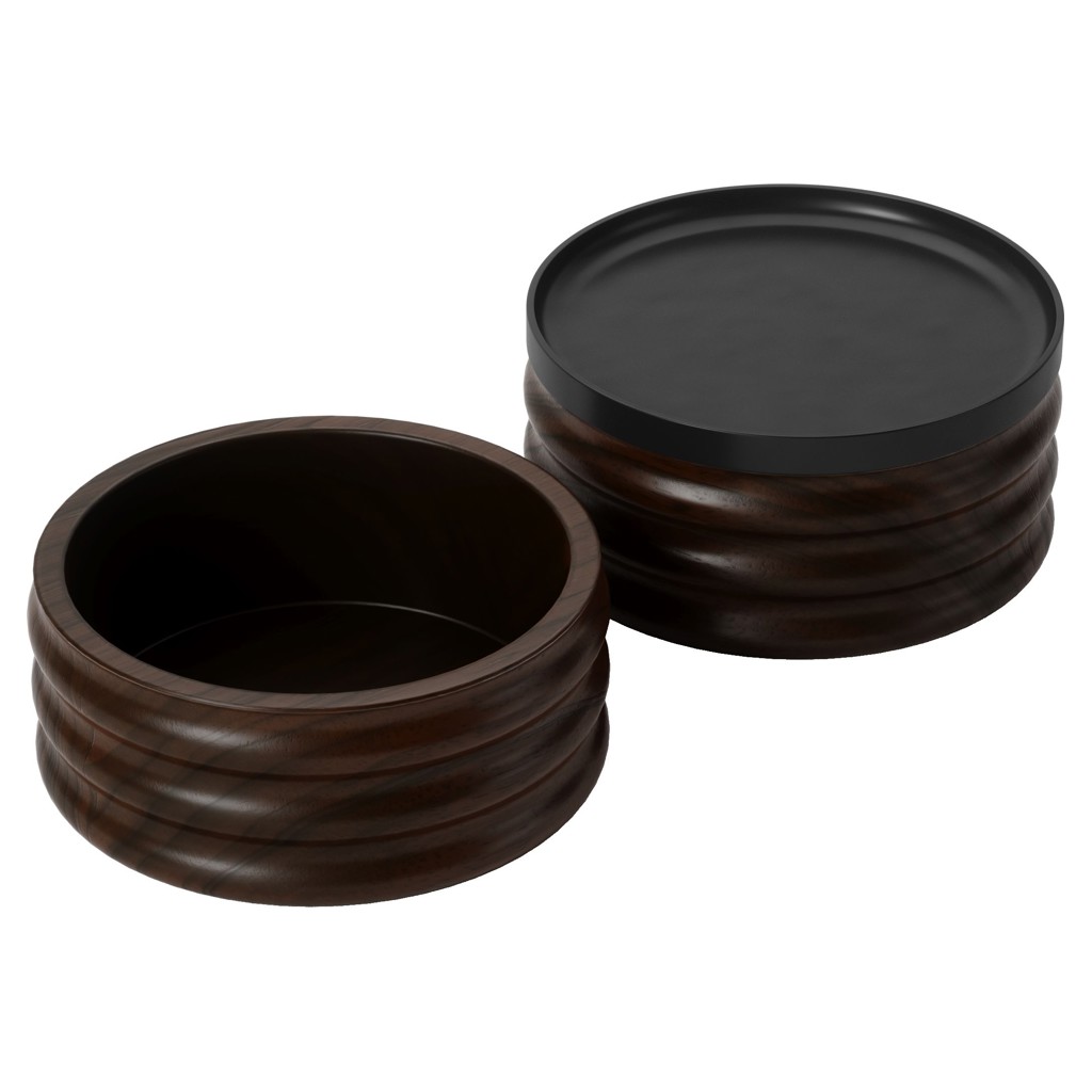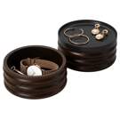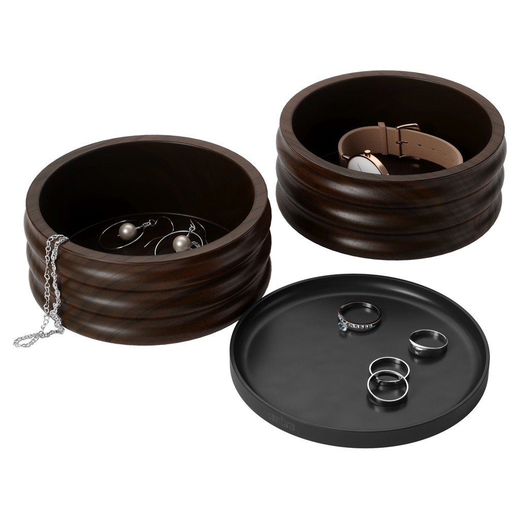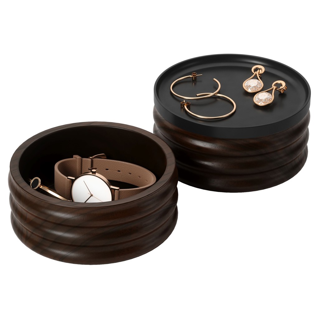 Le couvercle en métal plaqué du Tesora sert également de plateau pour ranger et exposer des accessoires facilement accessibles. Sa conception empilable à deux niveaux en fait une solution de rangement polyvalente qui peut être empilée les unes sur les autres pour gagner de la place ou conservée séparément.