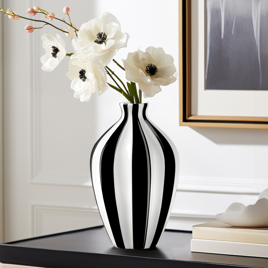 Ajoutez du caractère et du style avec cette interprétation moderne d’un vase en céramique classique. Inspiré à la fois du design parisien et du mouvement Bauhaus, son motif intemporel noir et blanc s’intègre parfaitement aux intérieurs contemporains pour évoquer élégance et sophistication.