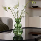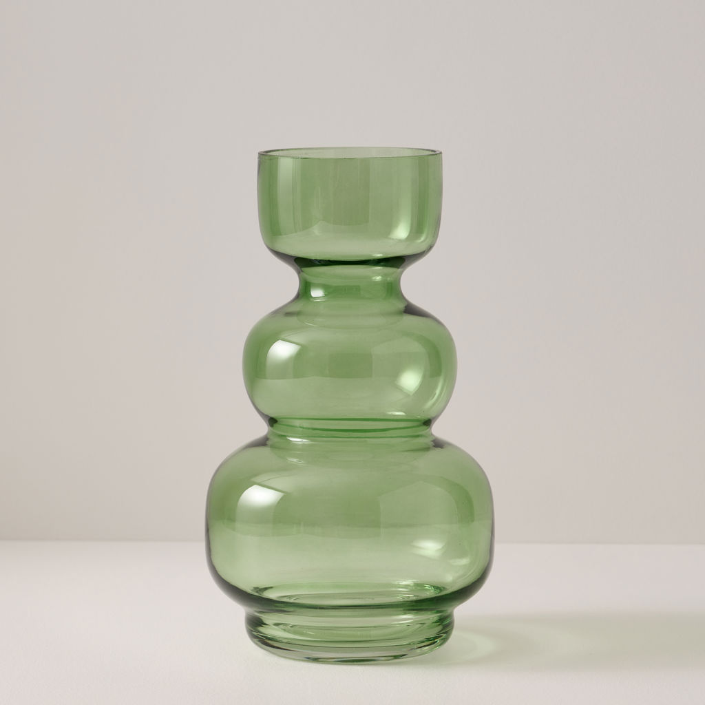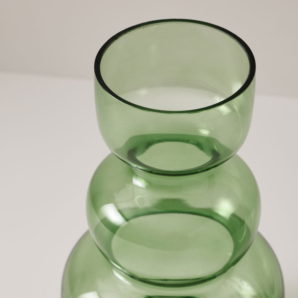 Faites une déclaration audacieuse avec ce vase en verre vert unique en forme d'ampoule multiple, conçu pour rehausser votre décoration intérieure.