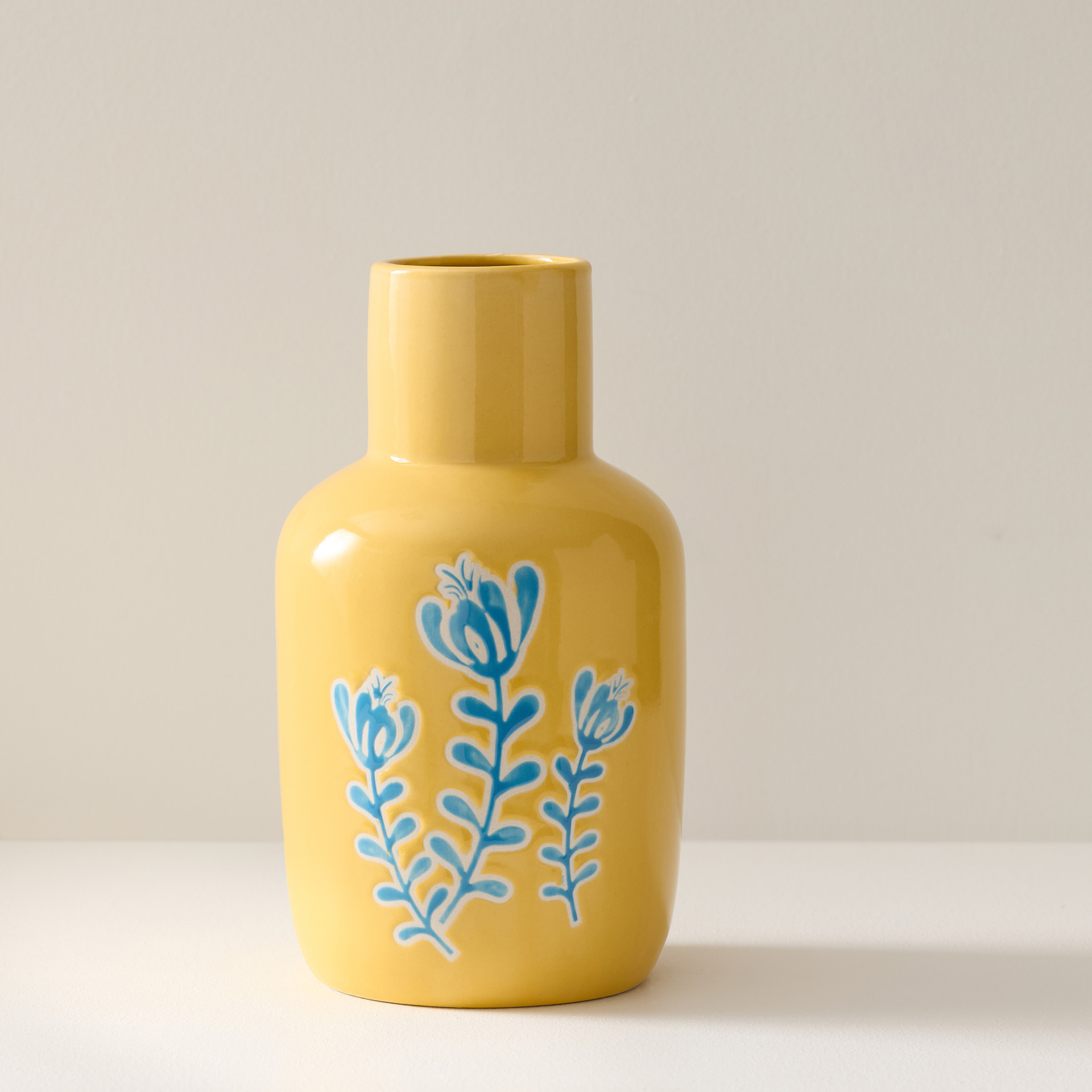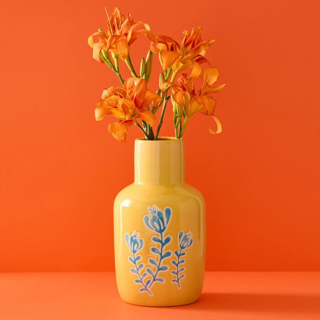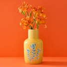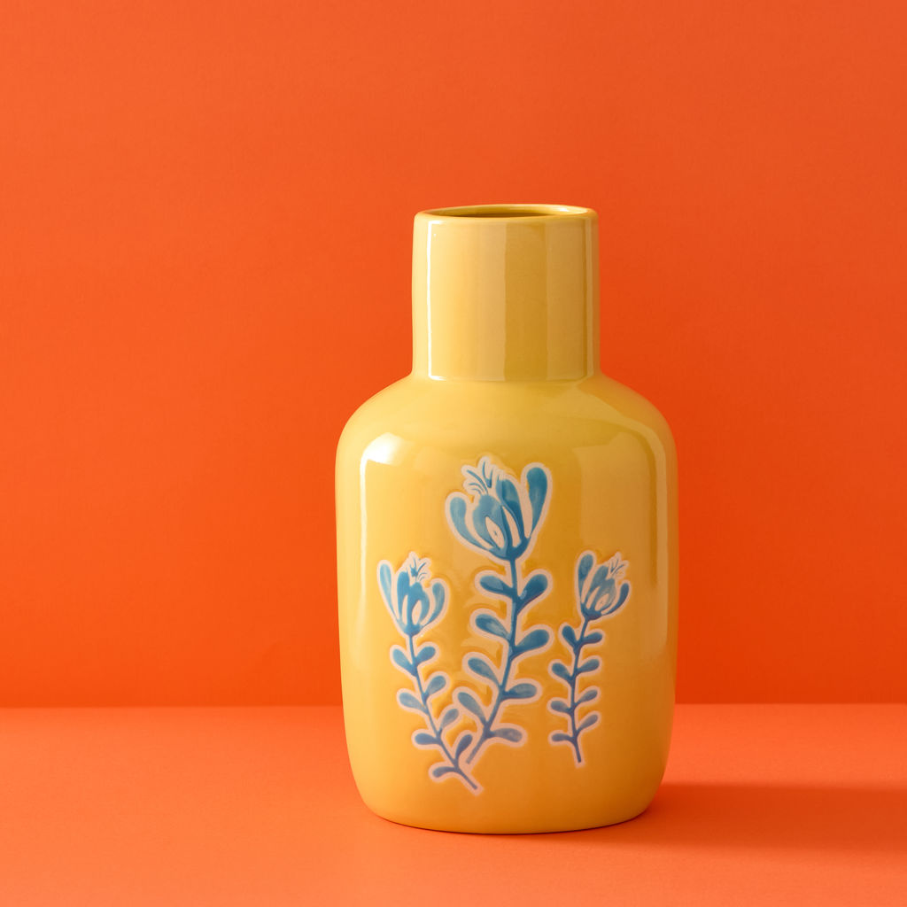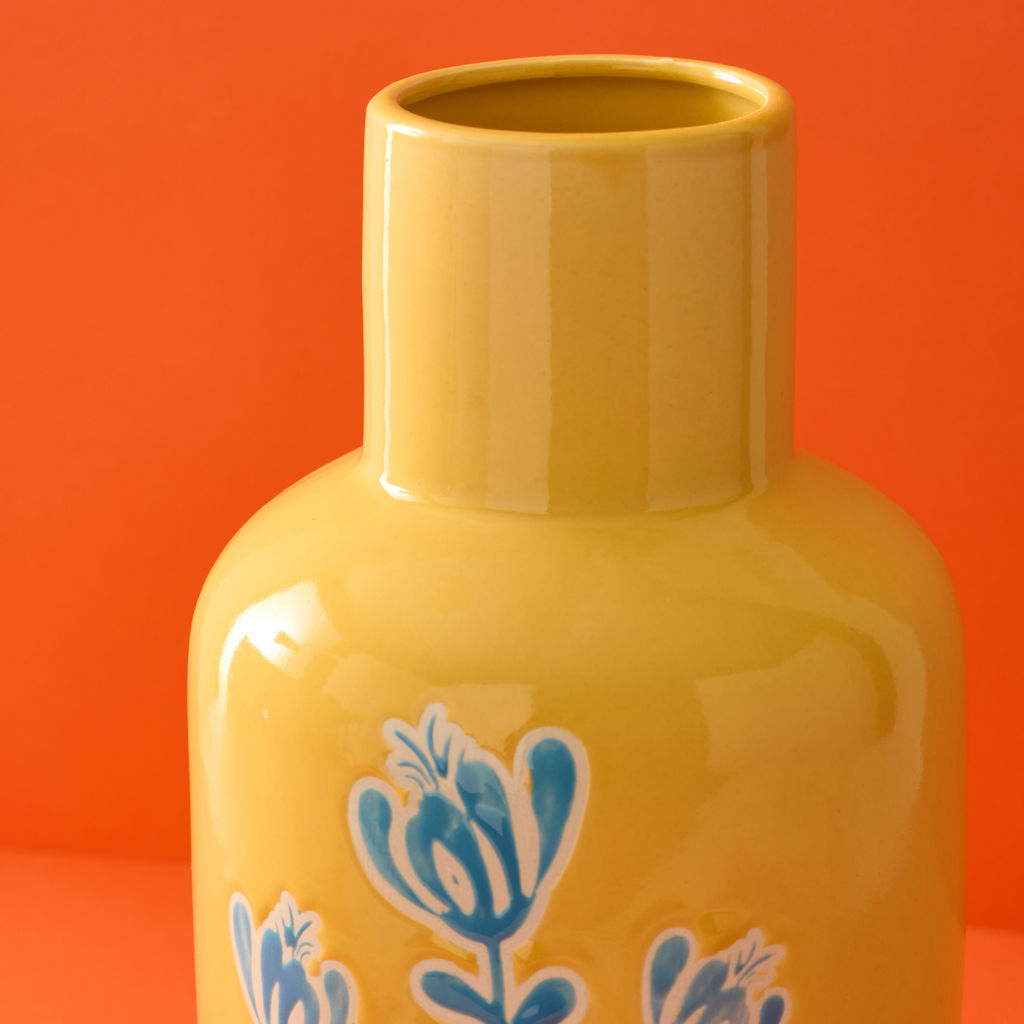 Cet élégant vase en céramique présente un jaune vif et joyeux, décoré avec des motifs floraux bleus qui créent un contraste charmant.