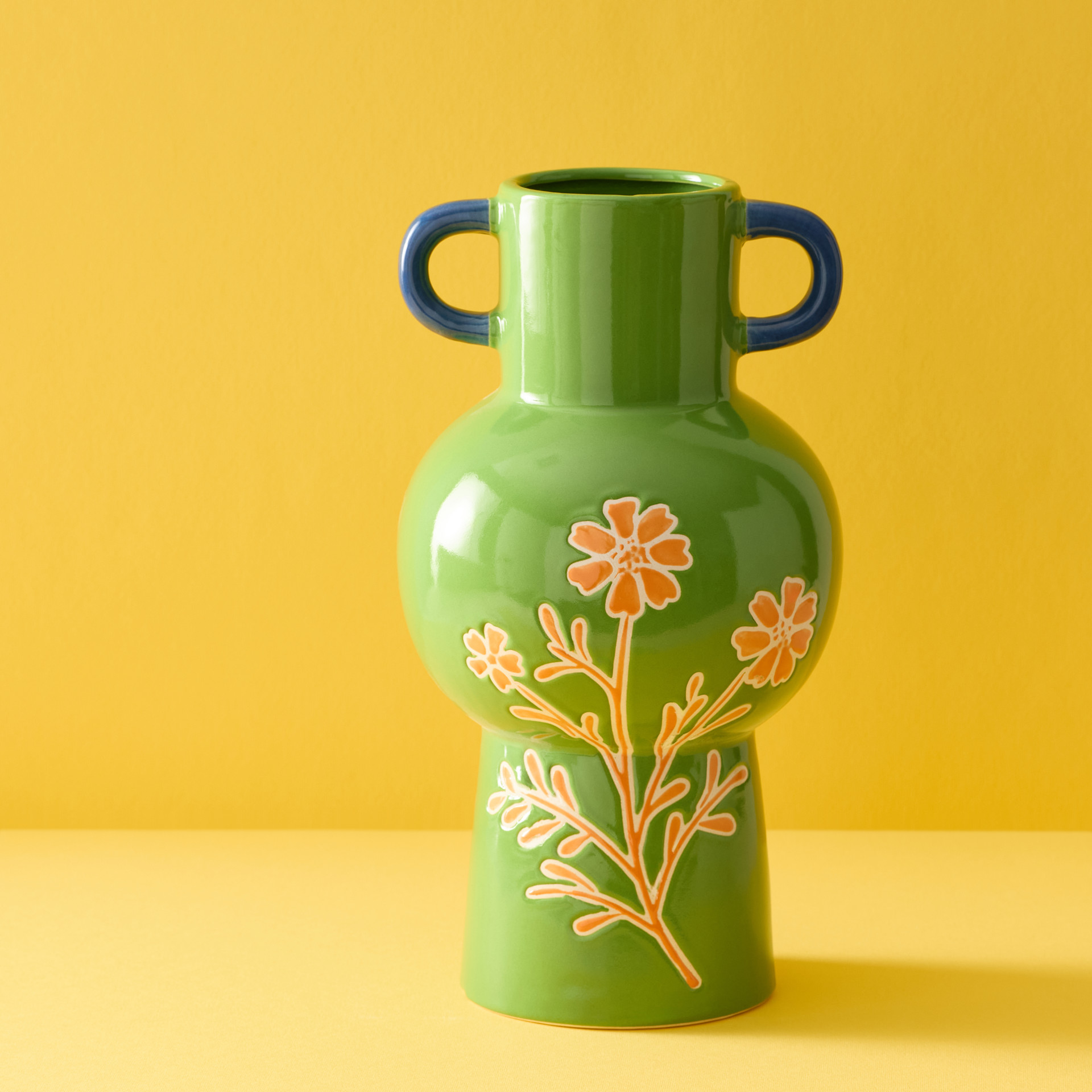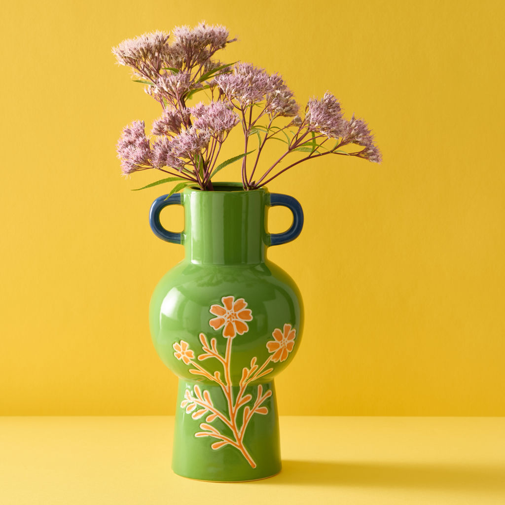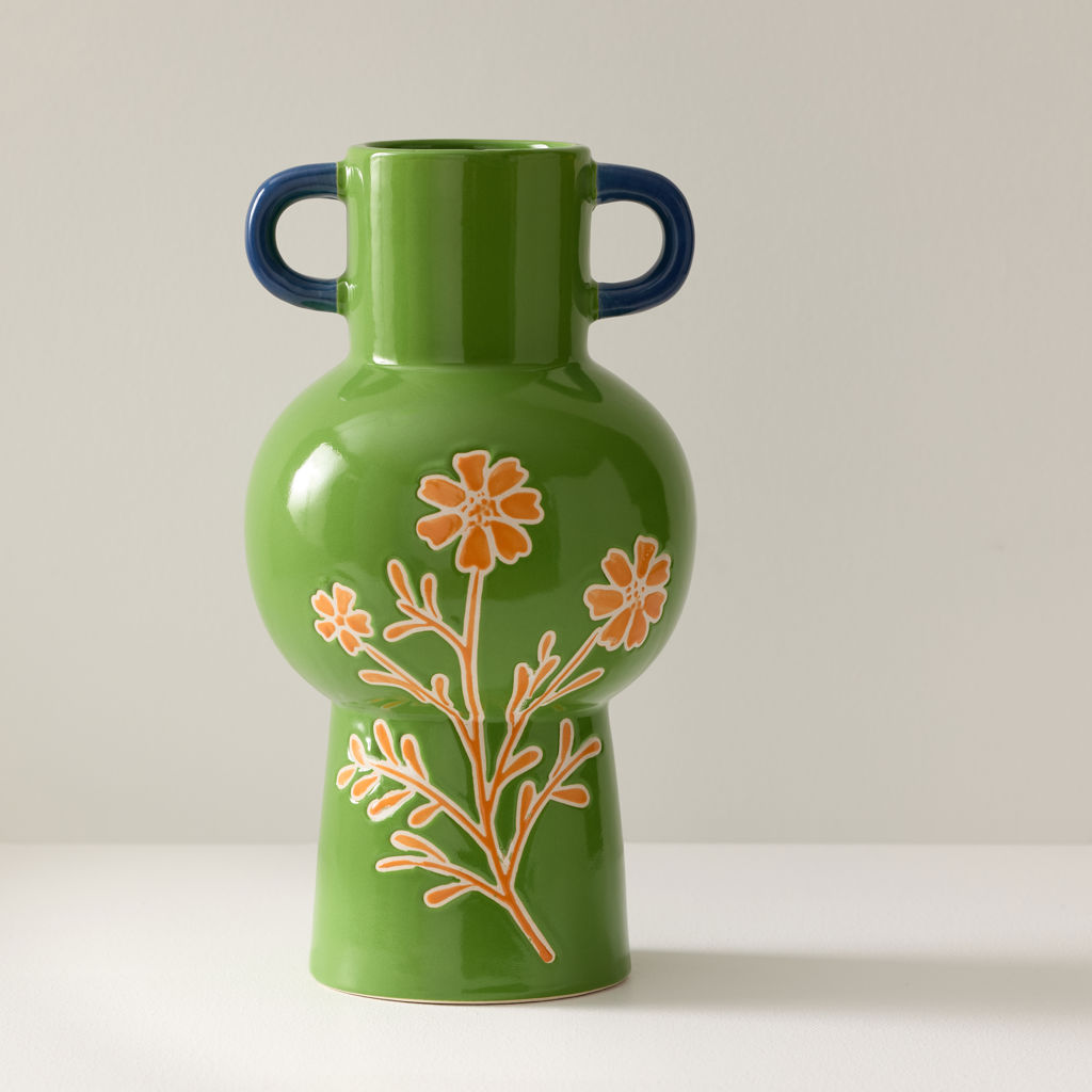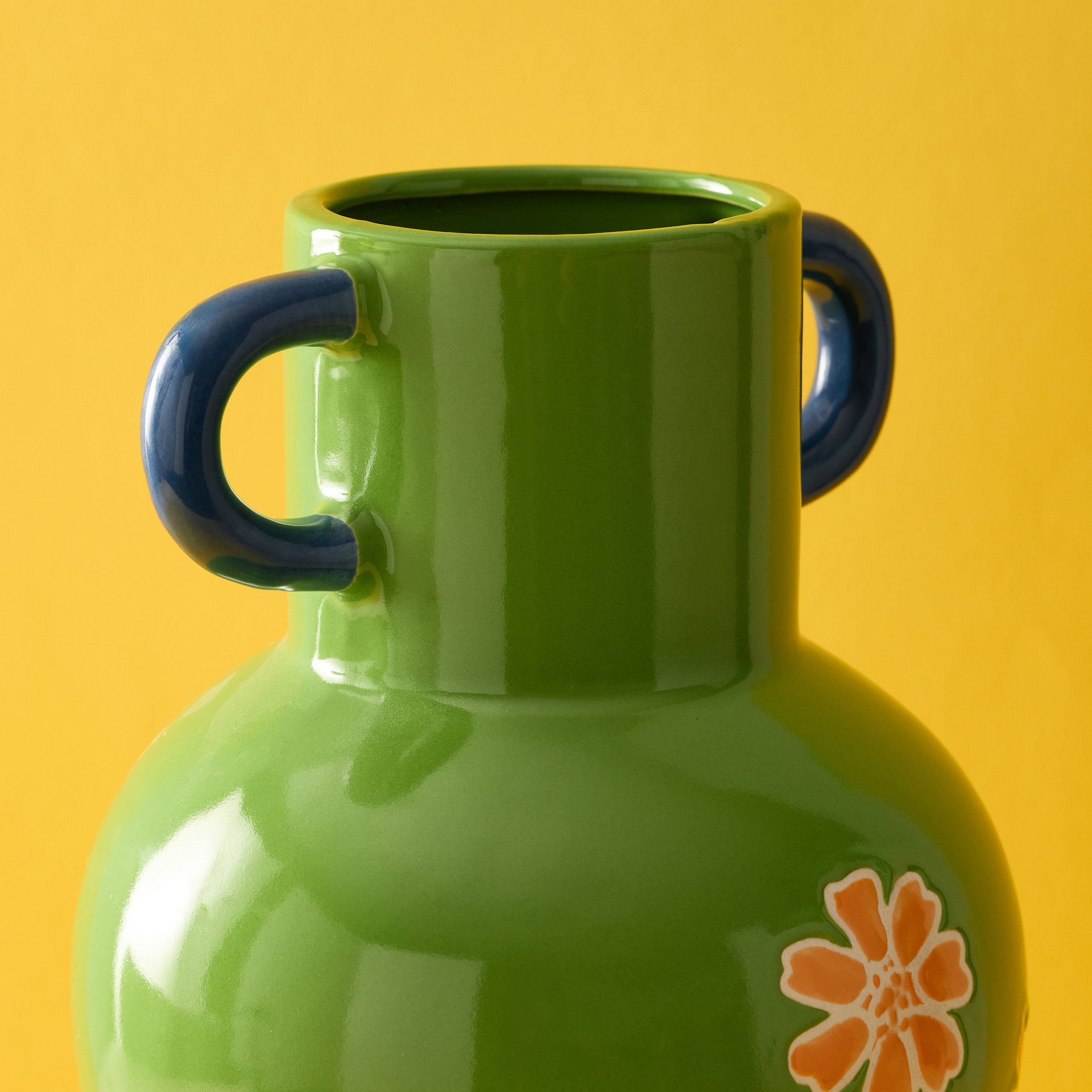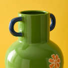 Ce vase en céramique attire l'attention avec sa couleur verte vive et ses poignées contrastantes en bleu profond.