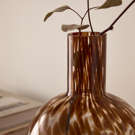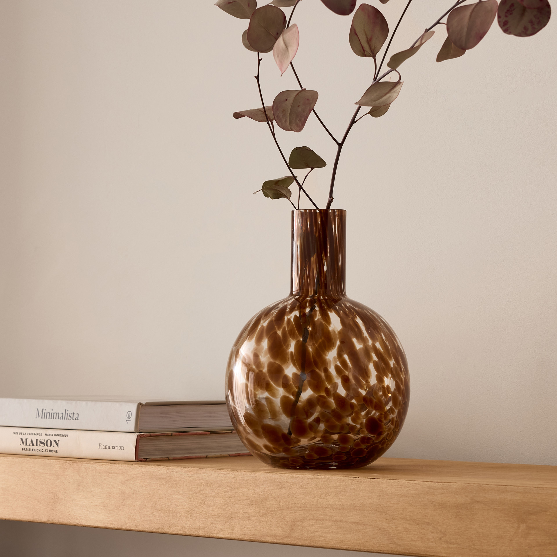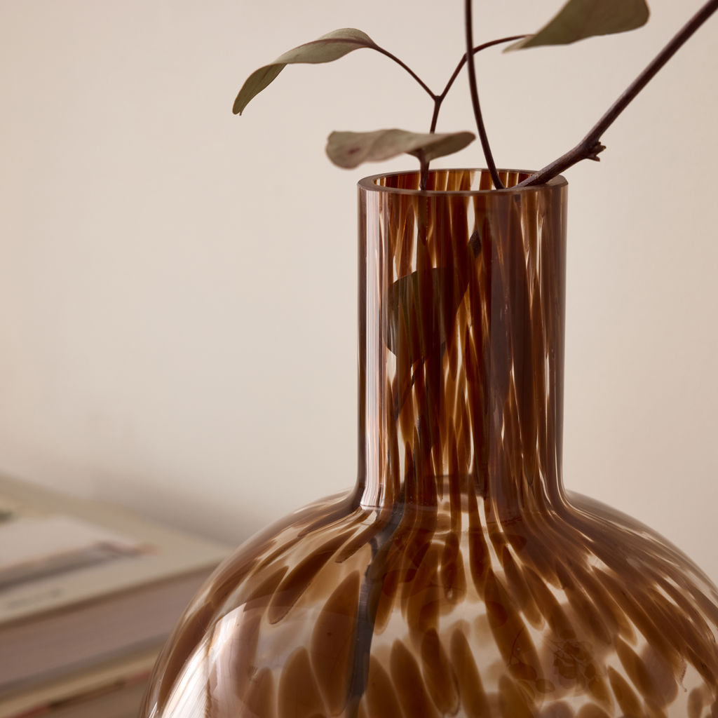 Petit vase rond en verre clair moucheté brun.