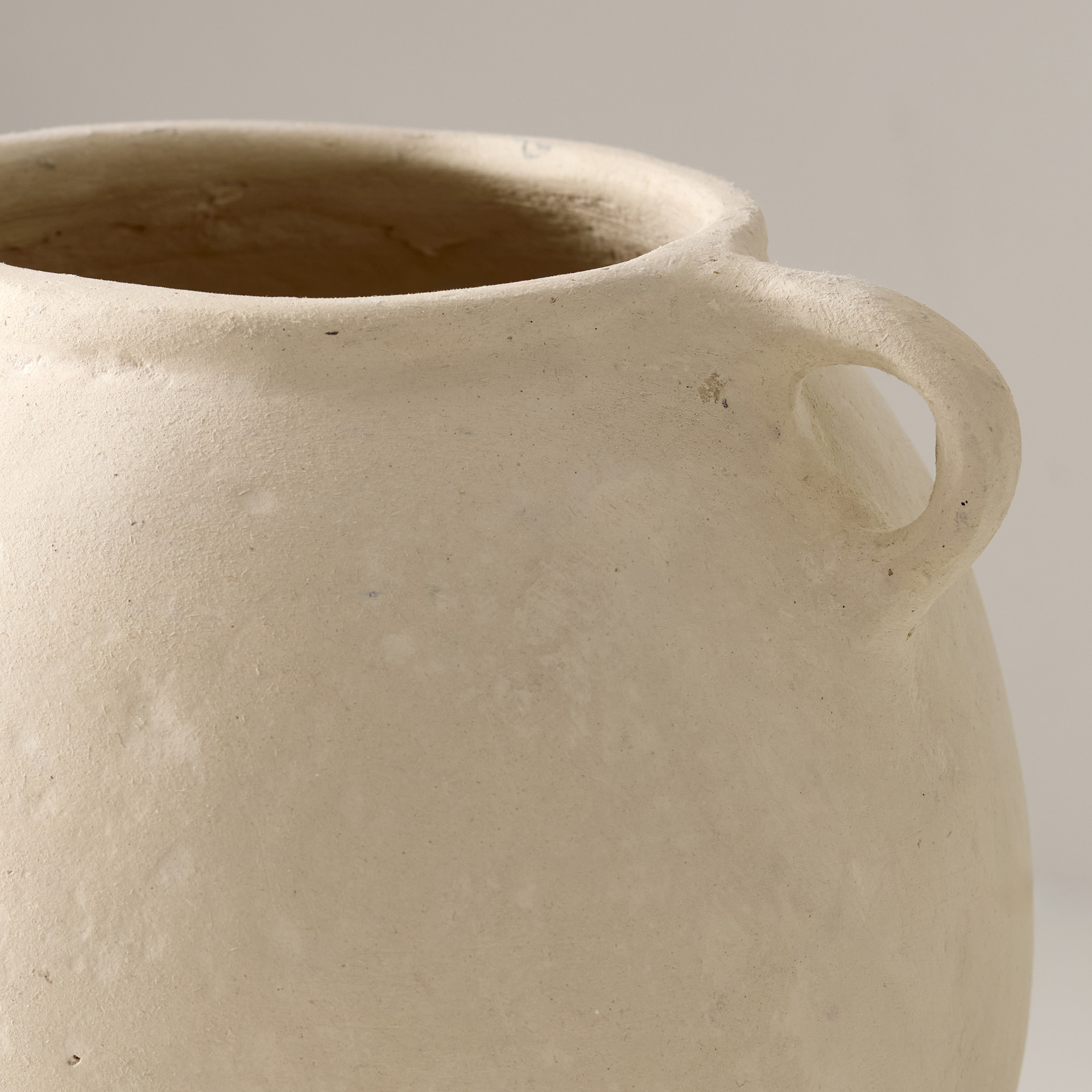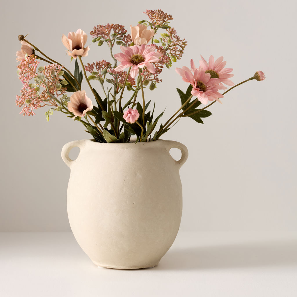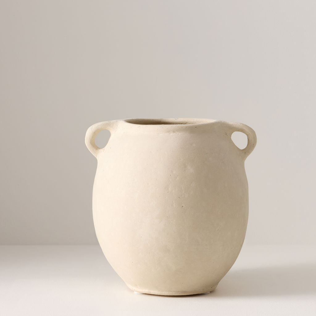 Magnifique vase en papier mâché avec poignées fait à la main au design épuré. La surface présente une texture légèrement irrégulière donnant un aspect artisanal et naturel. Il évoque un style minimaliste, chaleureux et intemporel, parfait pour une décoration douce et élégante.