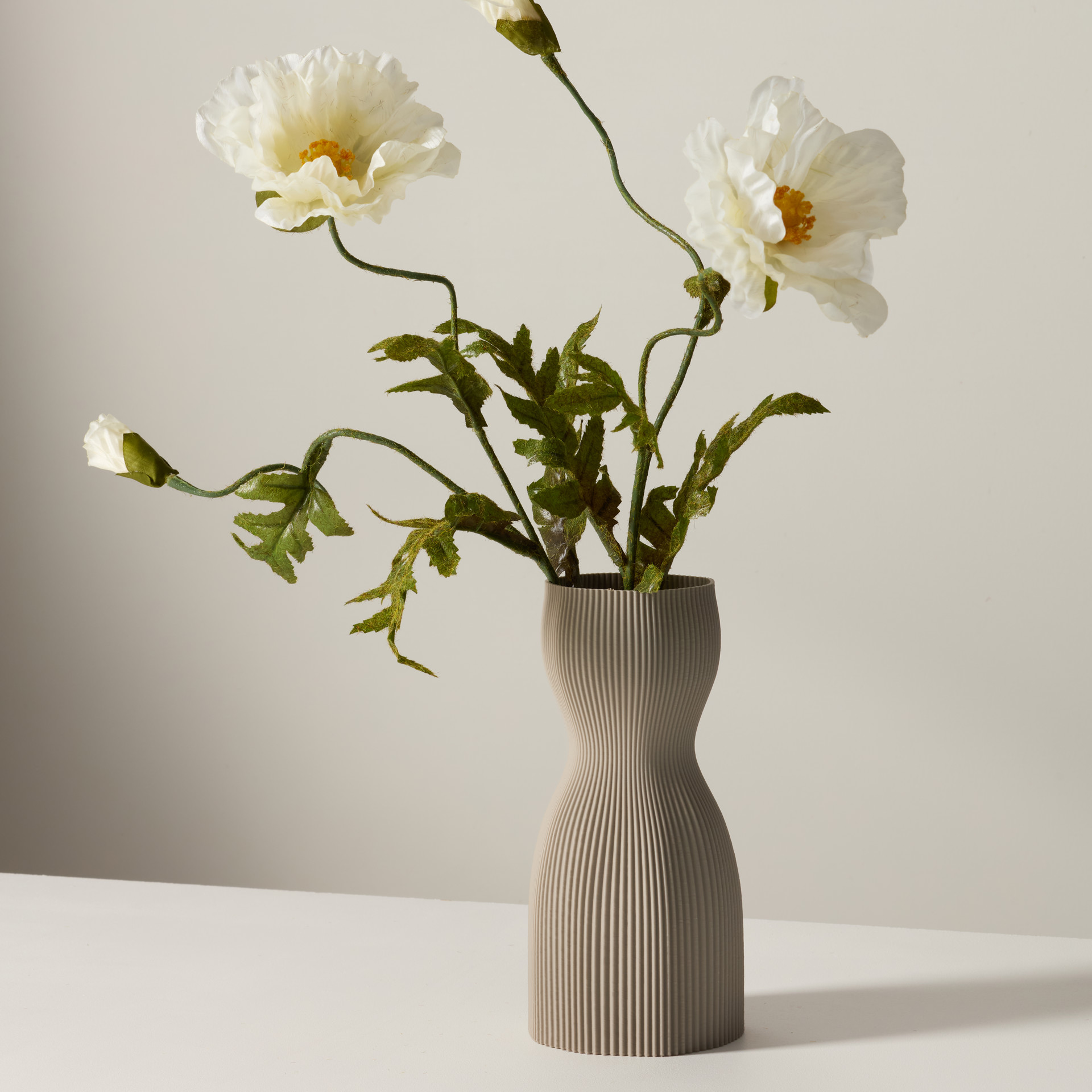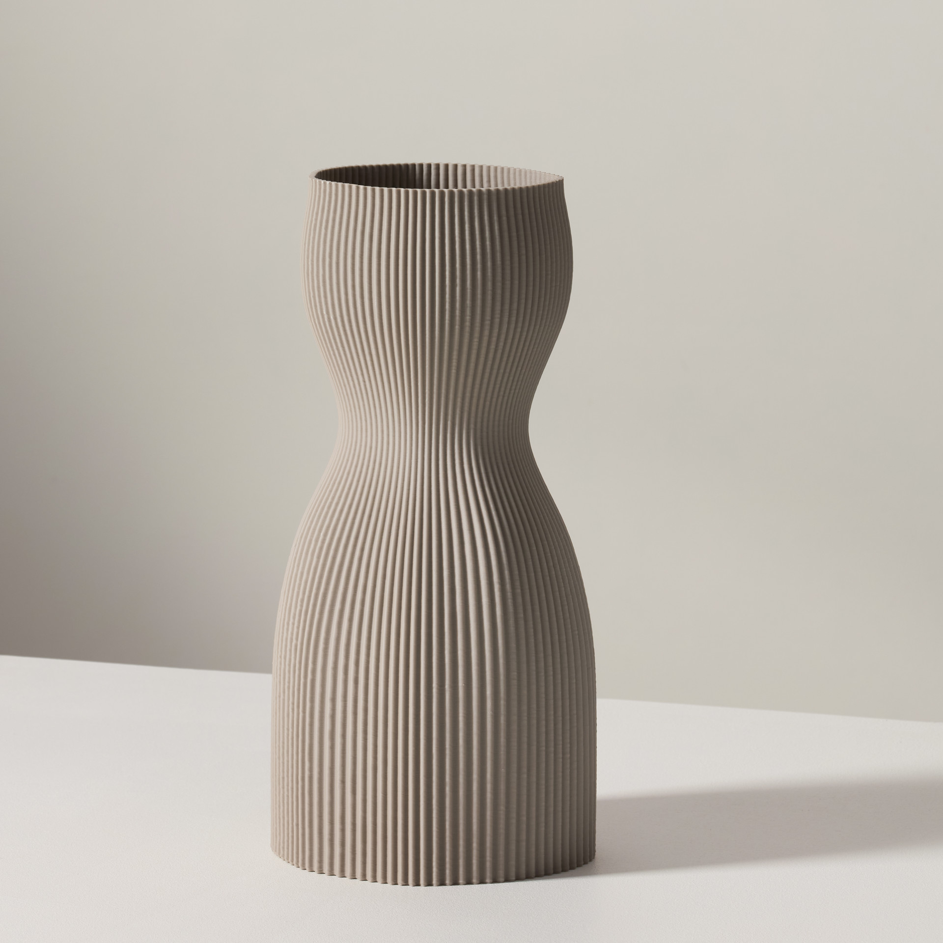 Le vase organique présente une forme marquée par de fines variations organiques ainsi qu'une texture composée de fines lignes, alliant élégance et fluidité.