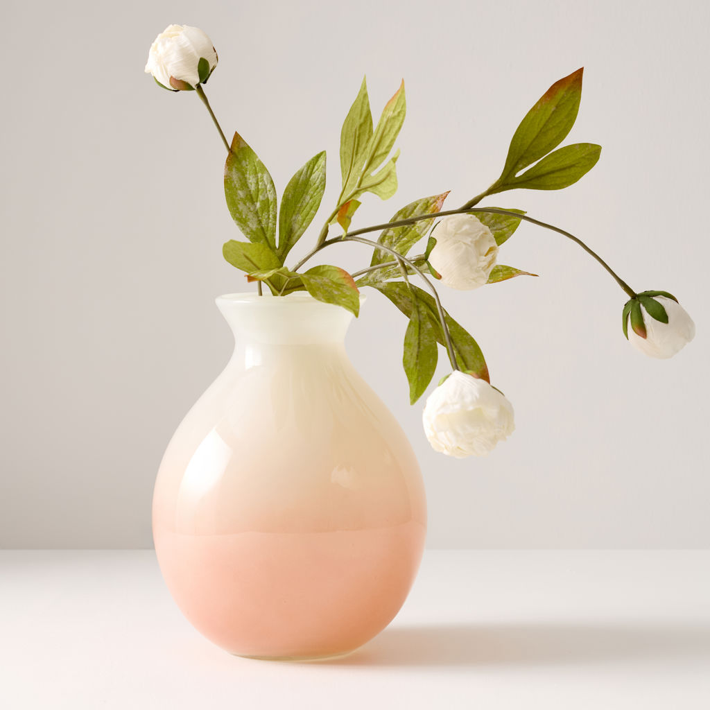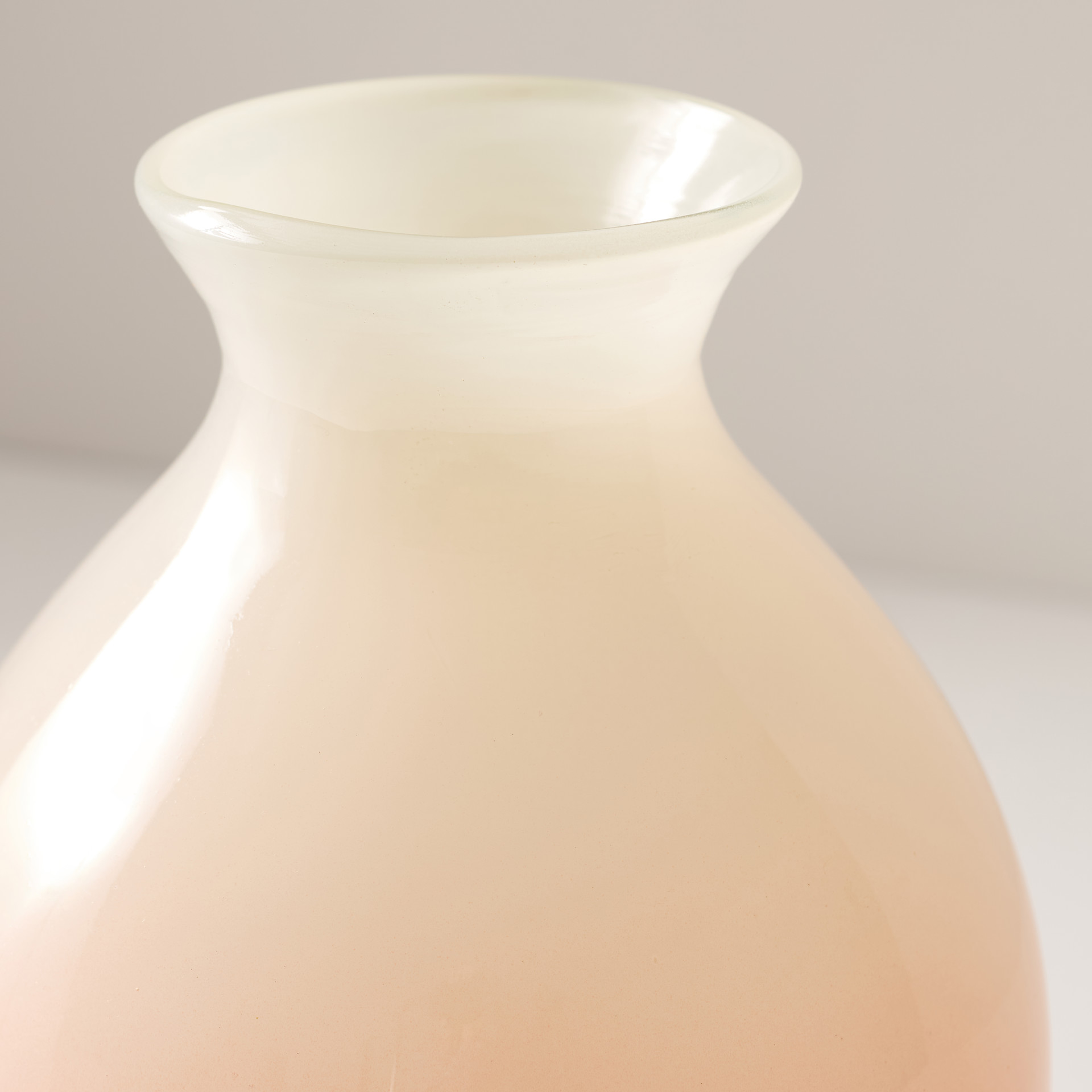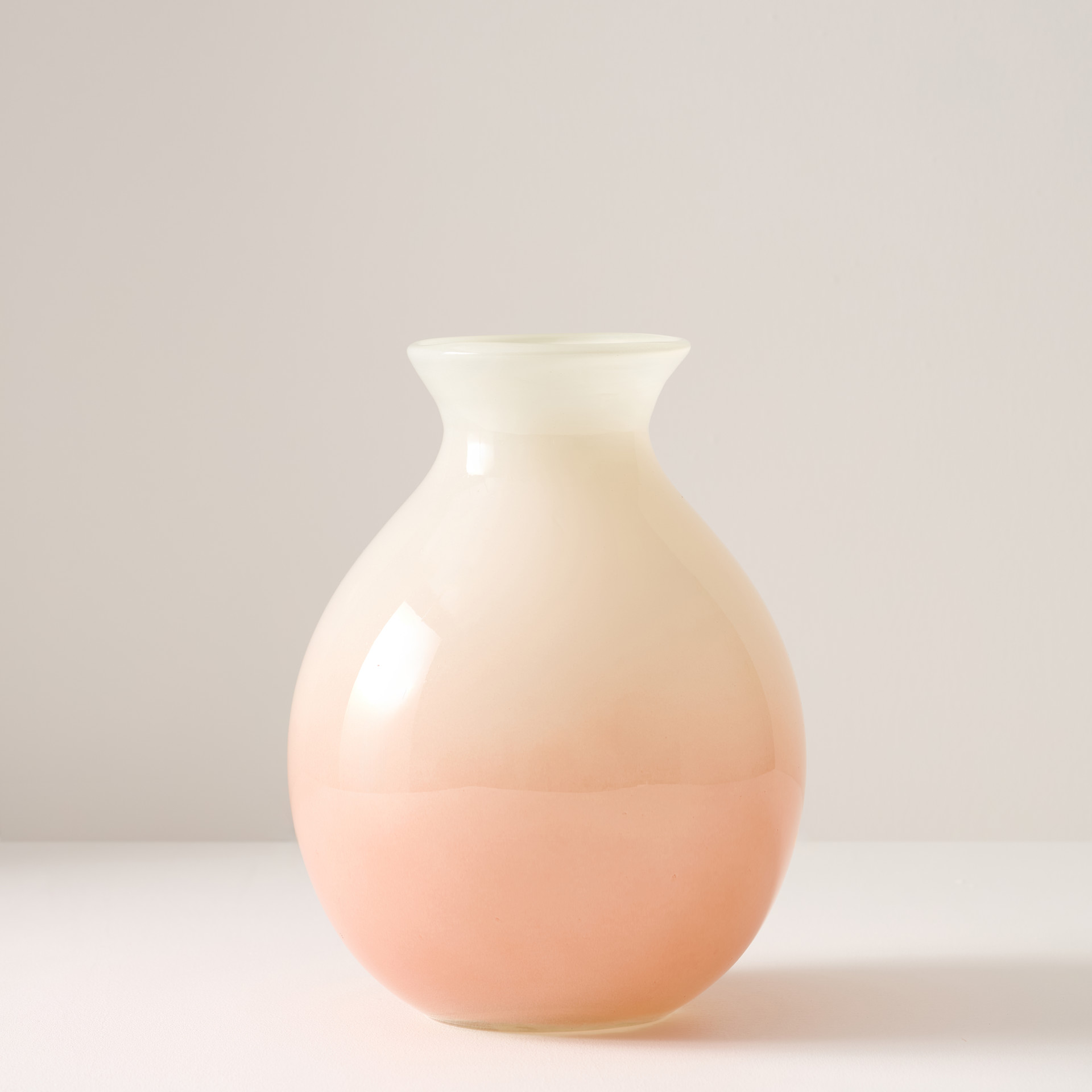 Apportez une touche d'élégance naturelle à votre décoration avec ce vase en verre soufflé, orné d'un magnifique dégradé allant de l'ambre au beige. Sa forme arrondie et son col évasé en font une pièce maîtresse idéale pour mettre en valeur vos bouquets ou pour être exposée seule comme un objet d'art.
