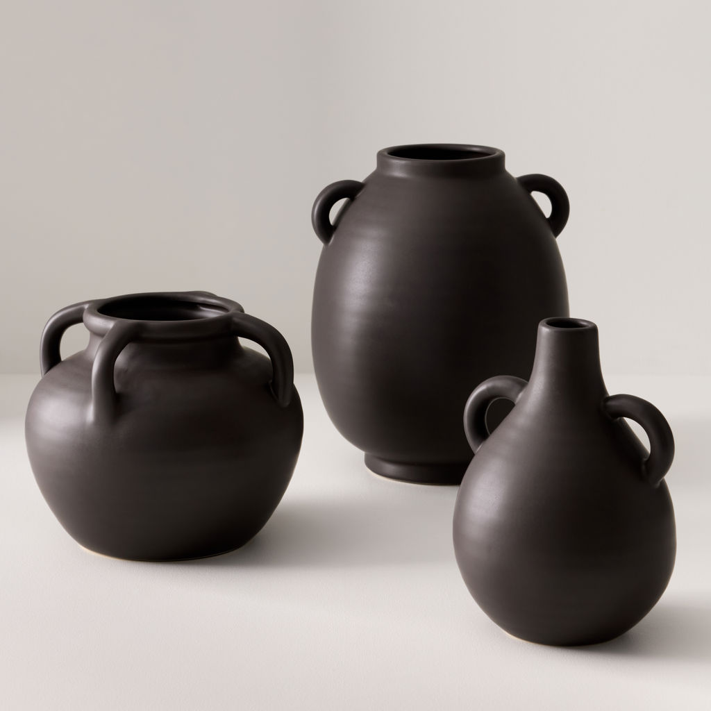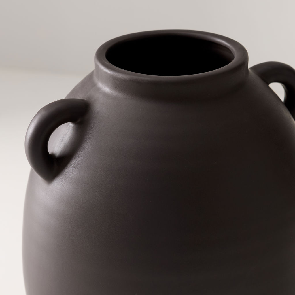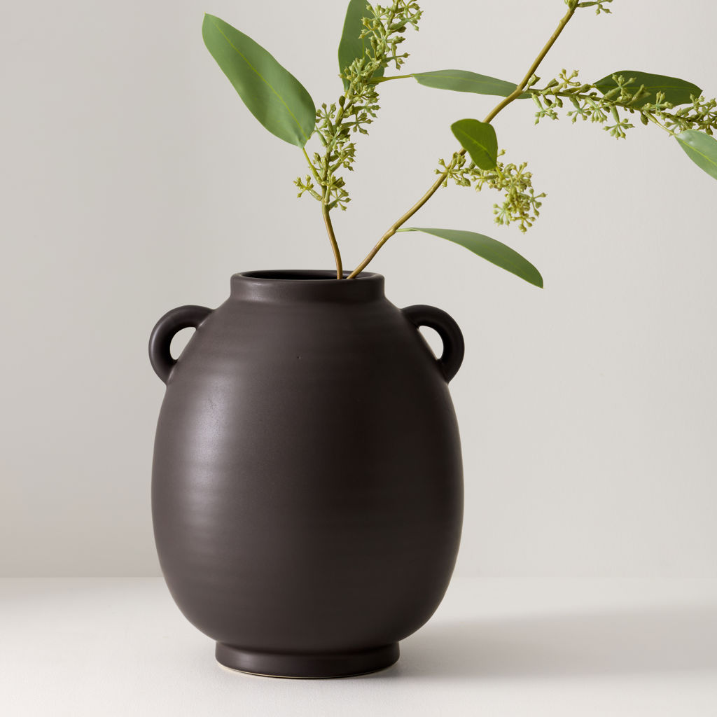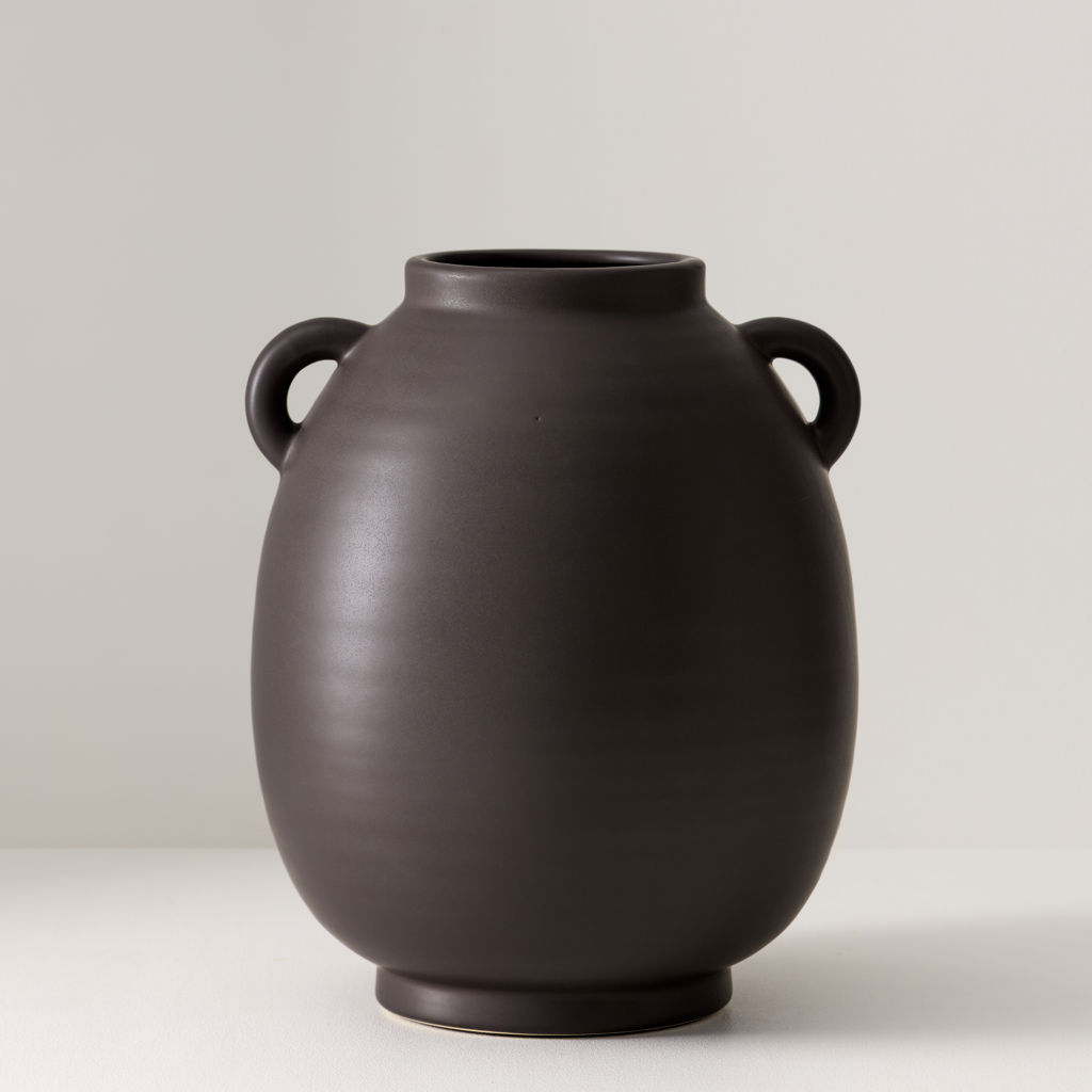 Doté d'une finition mate captivante, ce vase en céramique de forme ovale se distingue par son attrait artisanal distinctif et ses poignées uniques accentuant sa forme. Idéal pour mettre en valeur une seule tige ou un petit bouquet, son design allie parfaitement fonctionnalité et expression artistique.