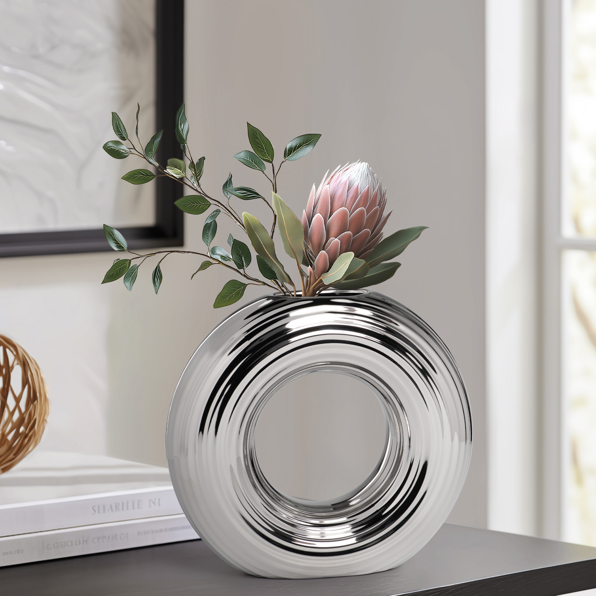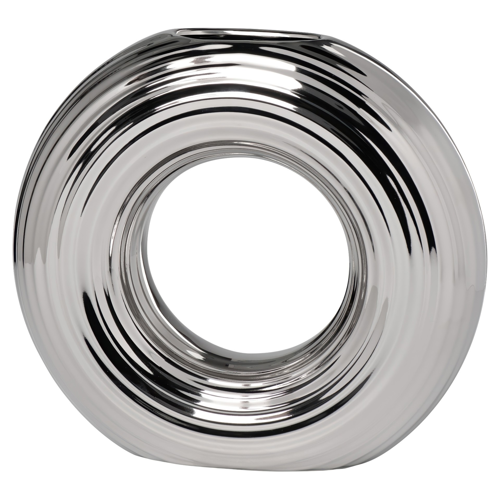 Ce vase rond en céramique en forme d'anneau fait une déclaration audacieuse avec son design d'inspiration Art déco. Fini dans un argent élégant, il offre un ajout raffiné mais frappant à tout espace moderne.