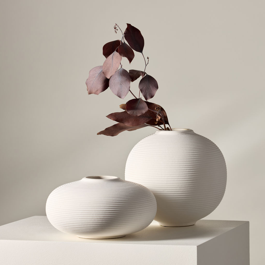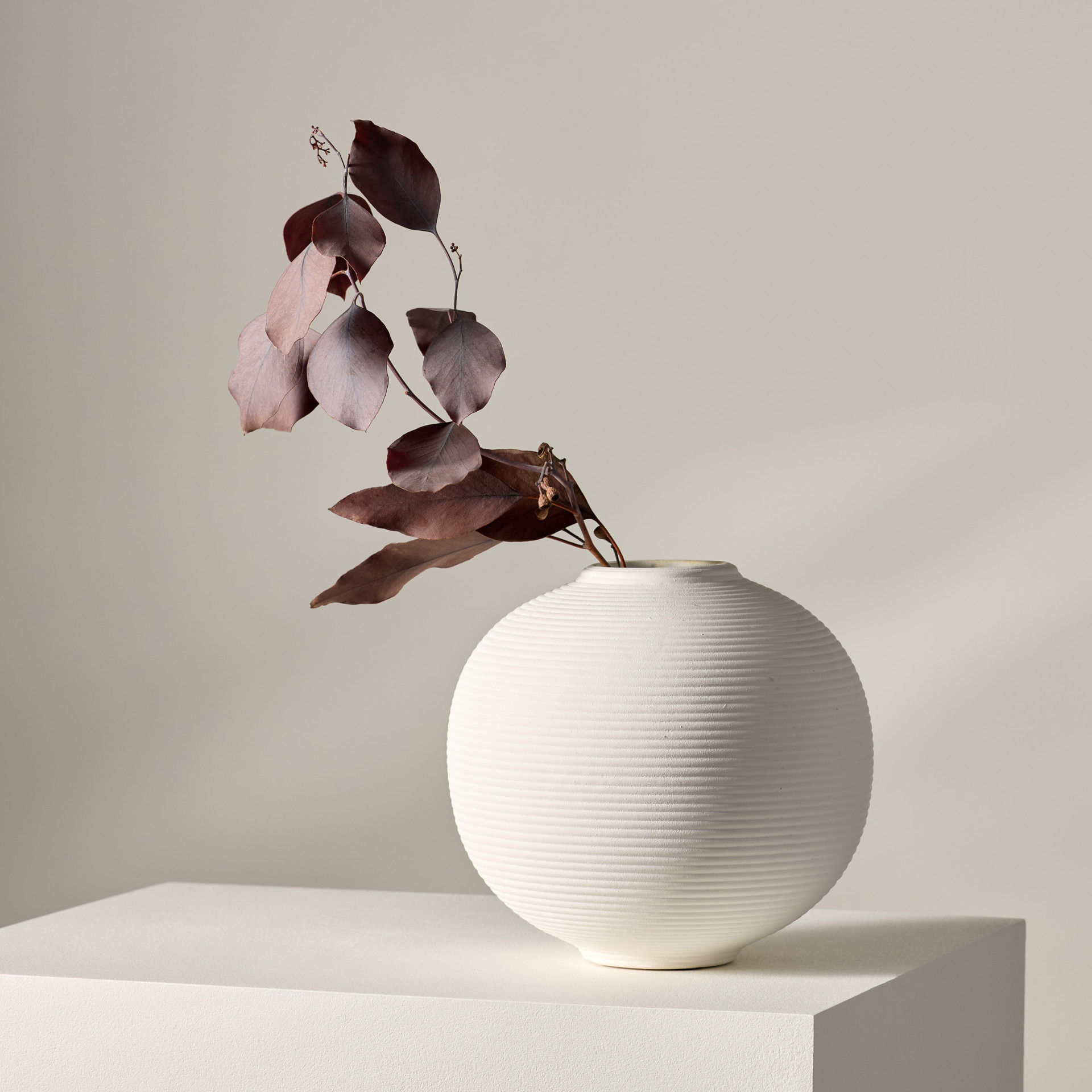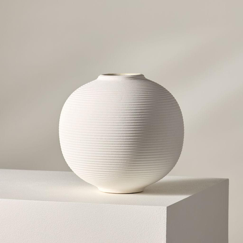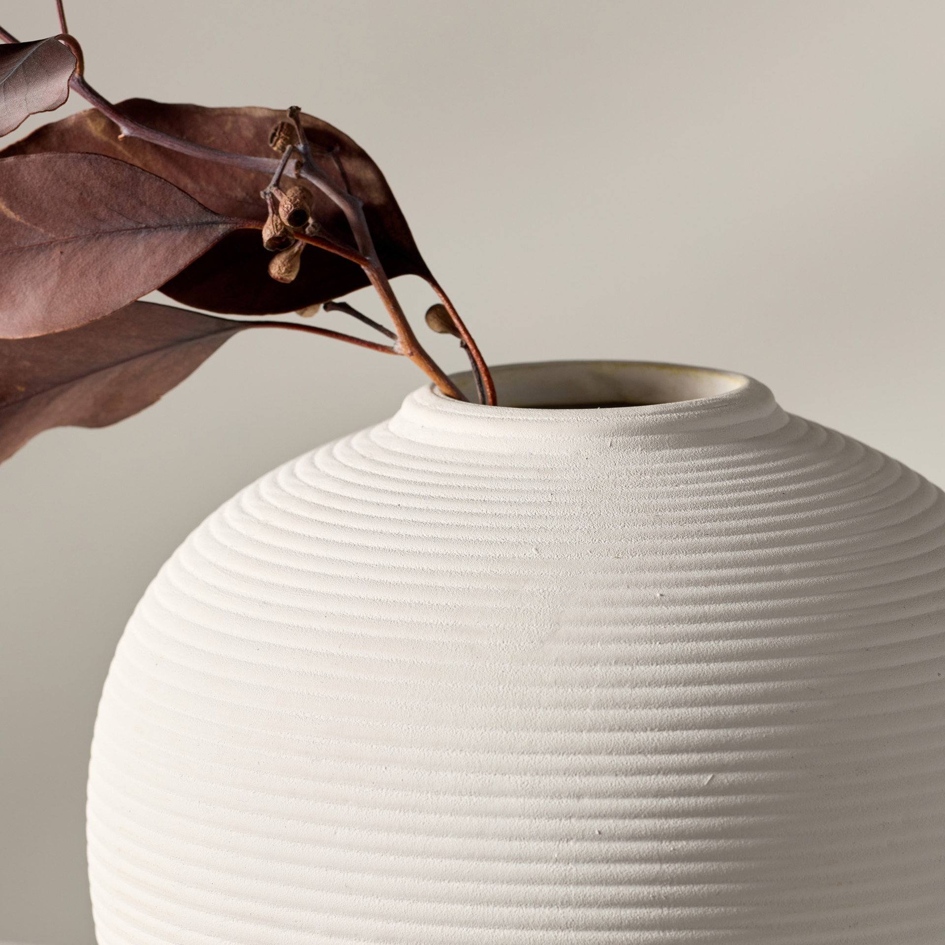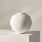 Ce vase en céramique blanche arbore une forme sphérique élégante avec une texture finement striée.
