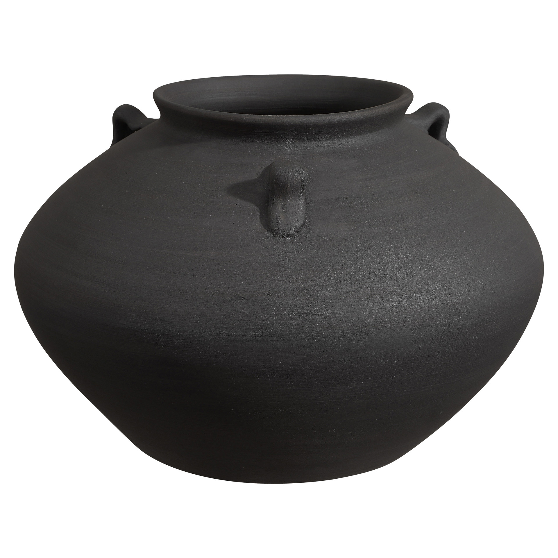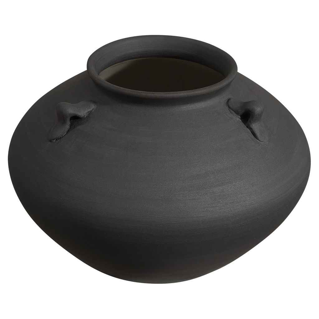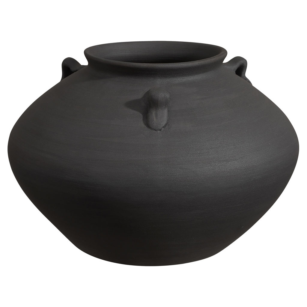 Ce vase présente une finition peinte en noir antique et cette touche spéciale de potier qui assure une ambiance haut de gamme digne de votre projet de design.