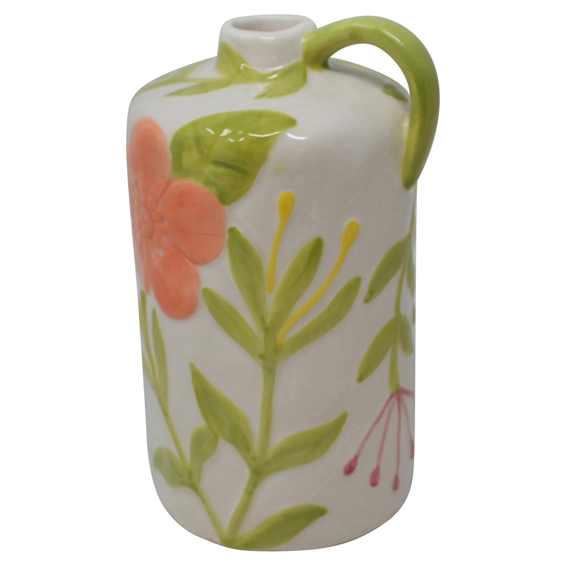 Ce vase en céramique au fini artisanal se distingue par ses motifs floraux peints à la main et sa petite anse délicate.