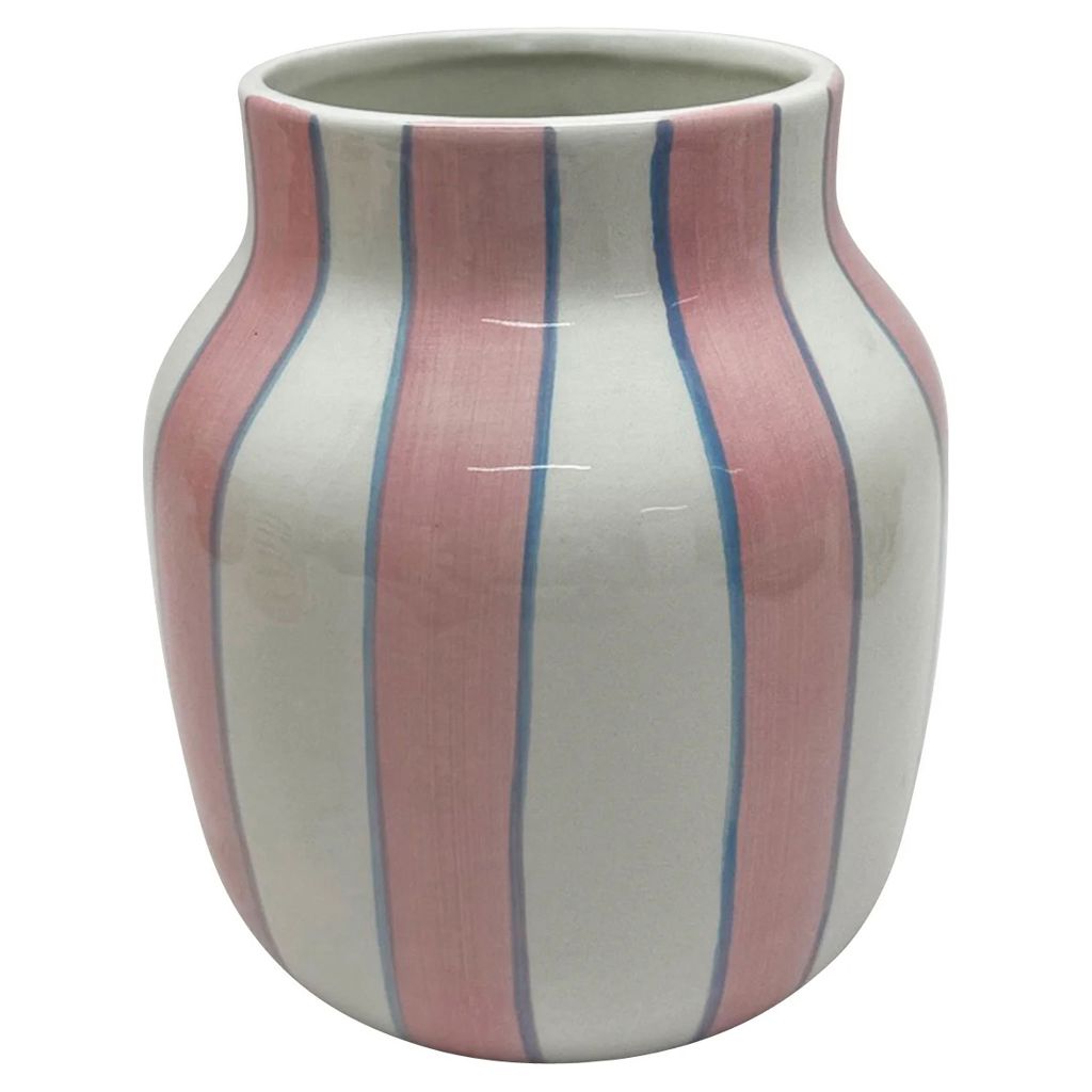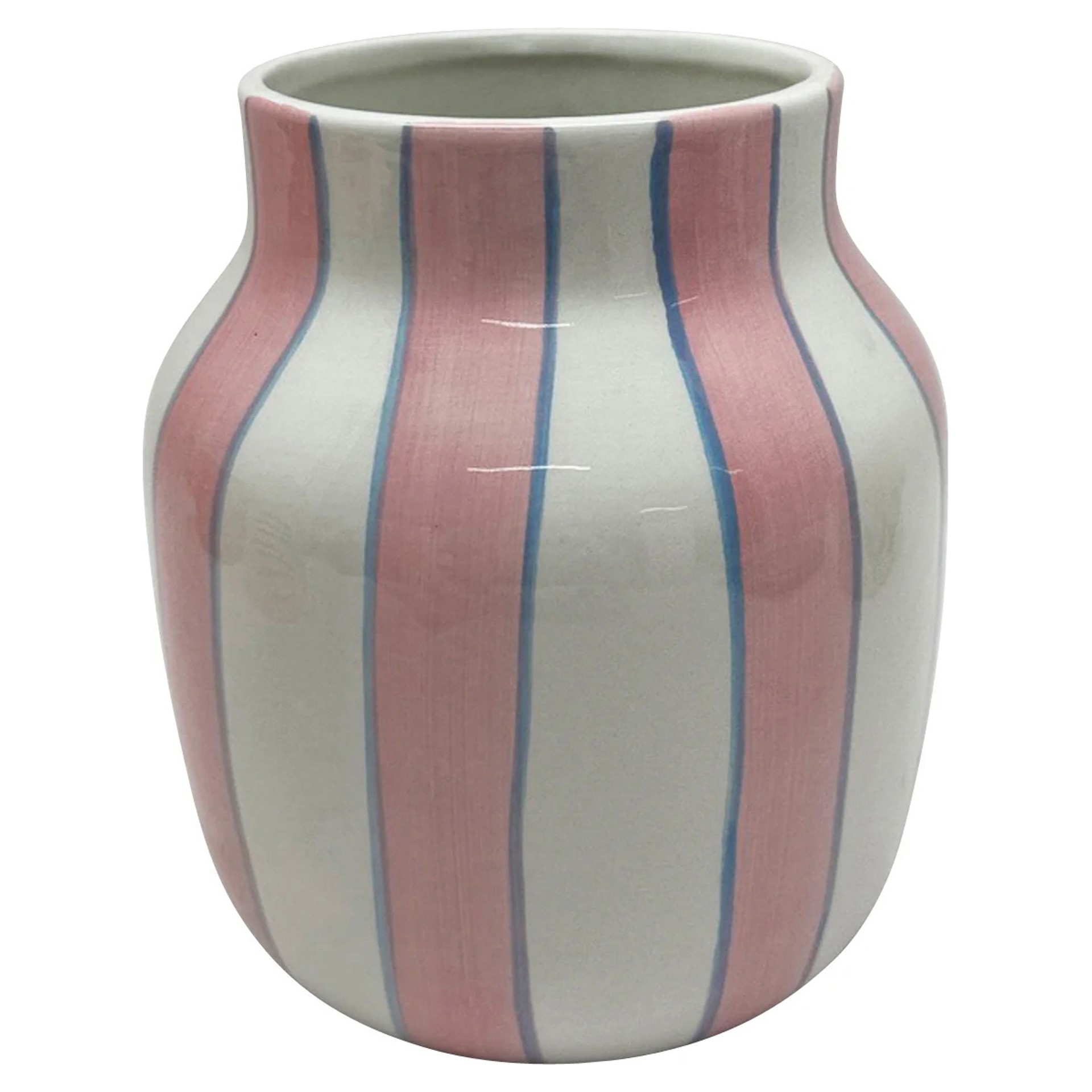 Ce vase en céramique se distingue par son motif à rayures peintes à la main dans des tons doux de rose et de bleu.