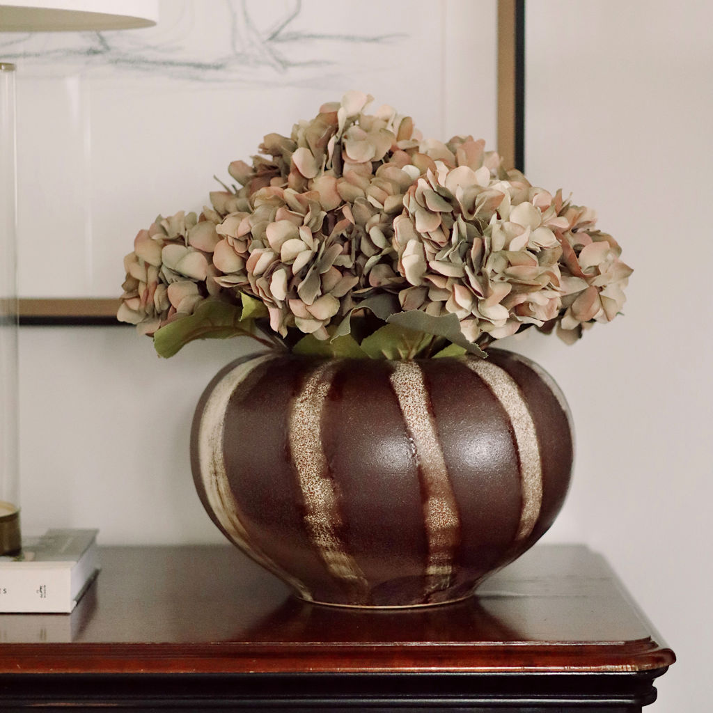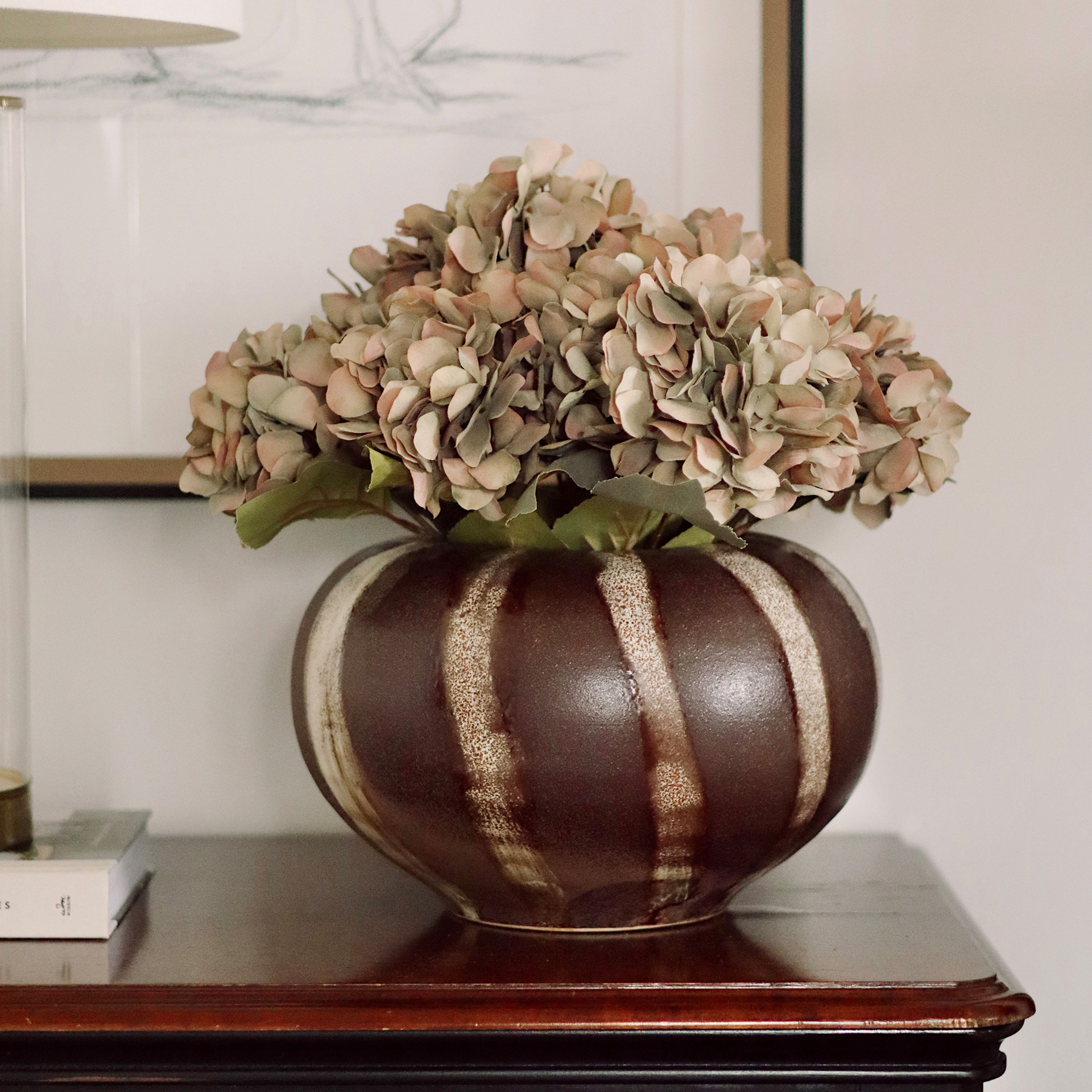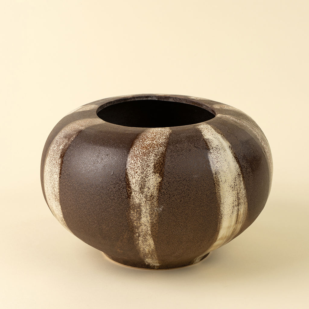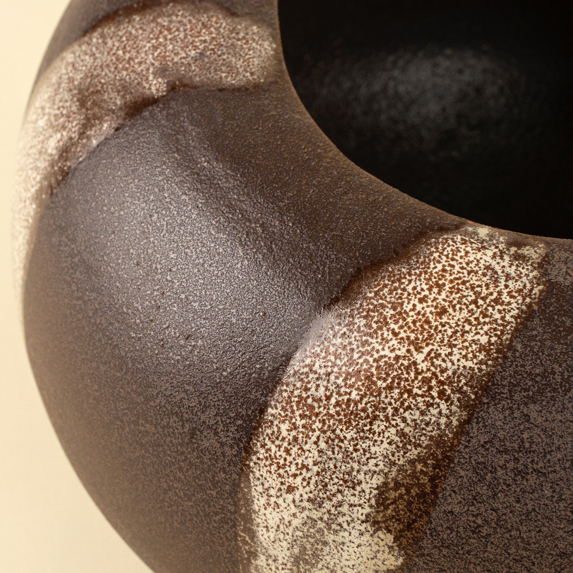 Ses riches émaux bruns et blanc crème créent profondeur et mouvement, en faisant une pièce maîtresse remarquable pour les intérieurs raffinés.